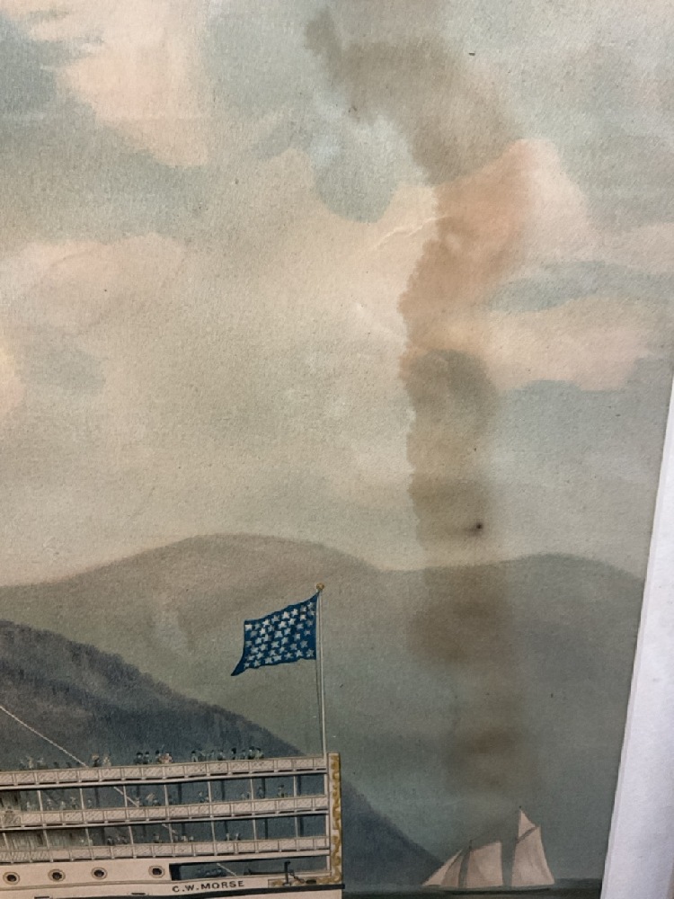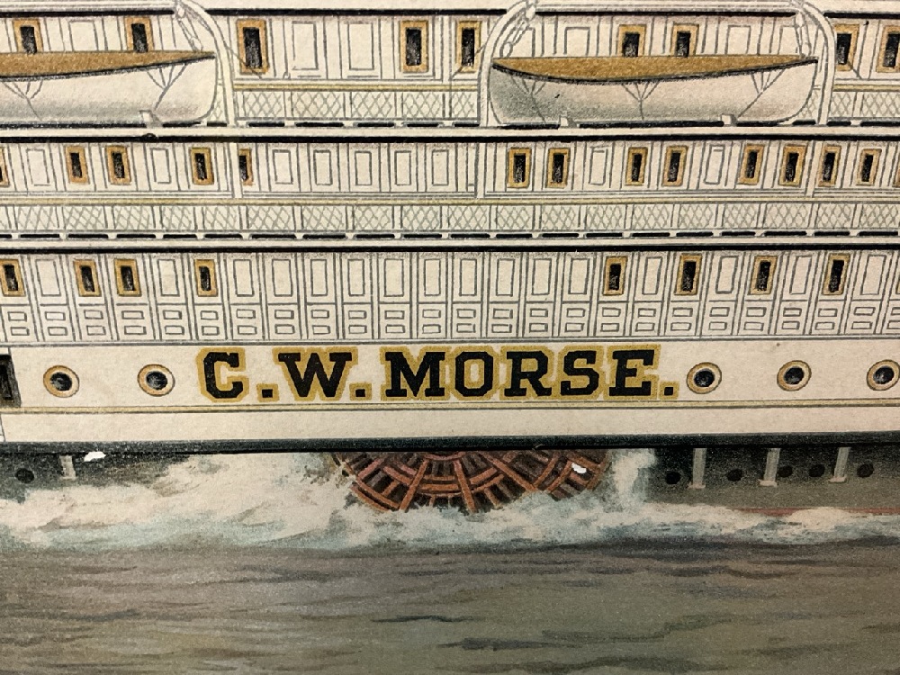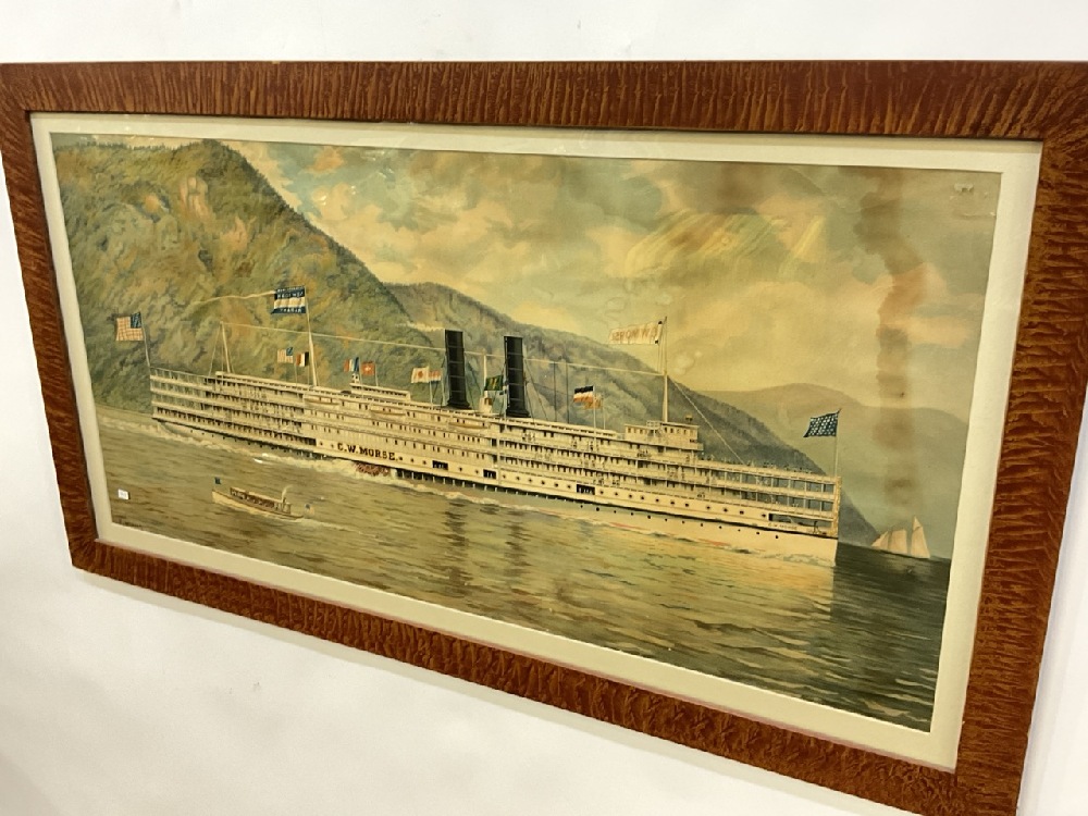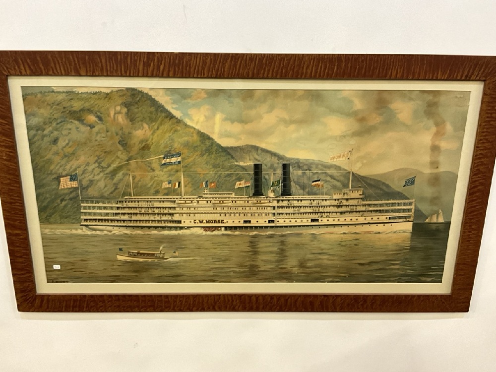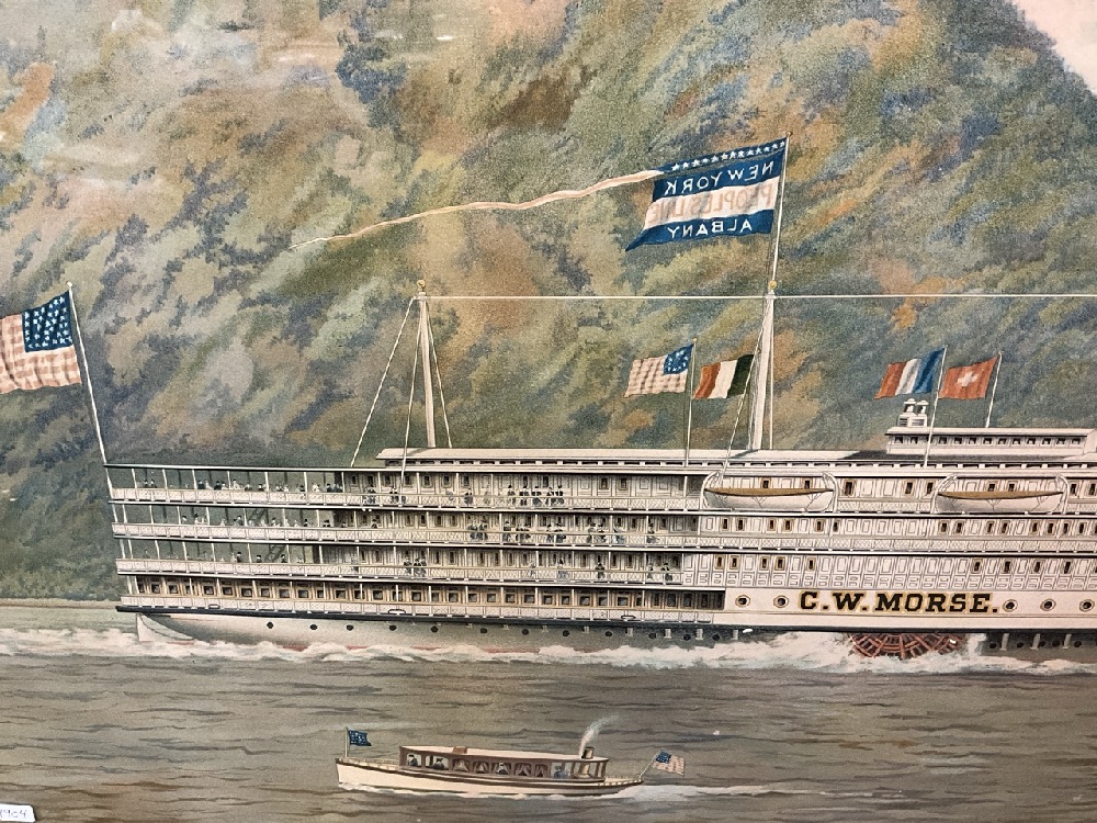 C.W. Morse Steam Ship on the Hudson River from New York to Albany. Color Lithograph from work painted by F. Worms. c. 1904 Advertising for Hudson Dayline.
