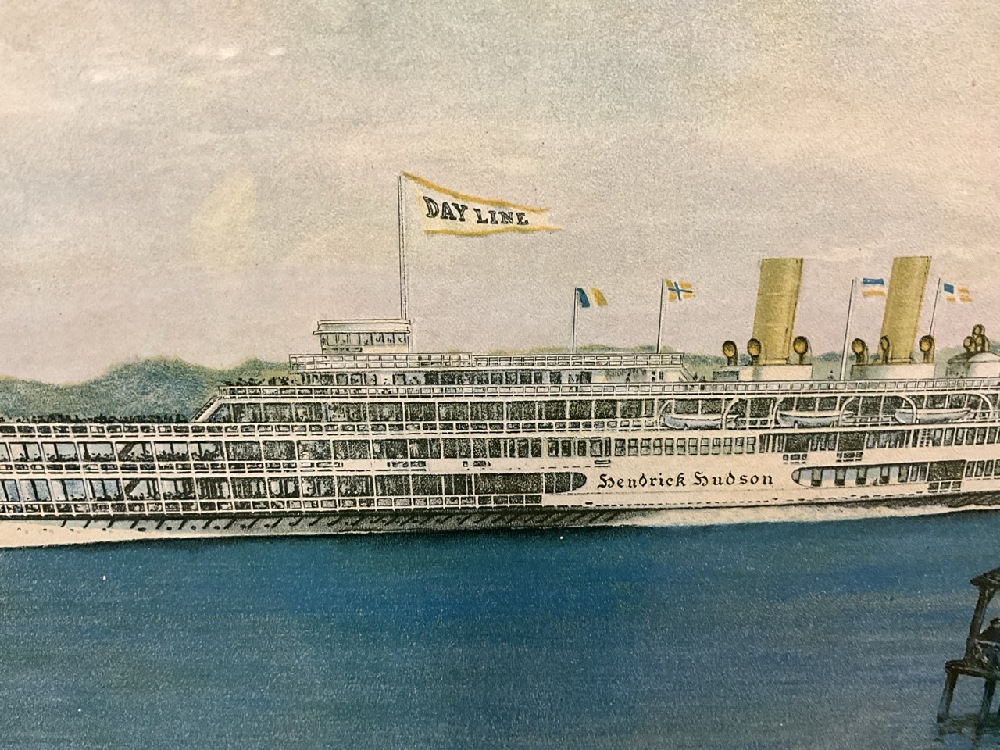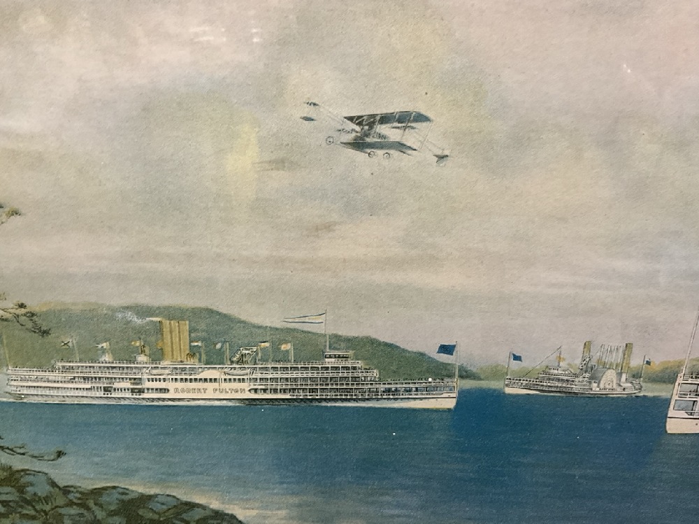 Henrick Hudson, Mary Powell and Robert Fulton Steam Ships. TItled: The Flyer's of the Hudson. An Airplane is flying overhead.