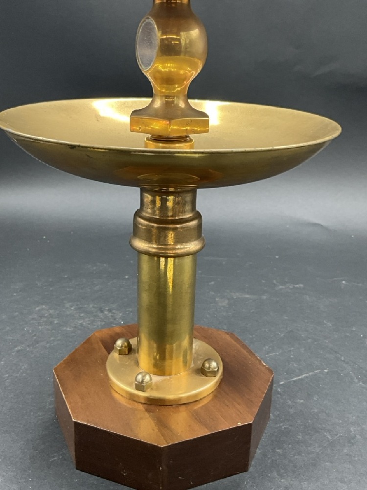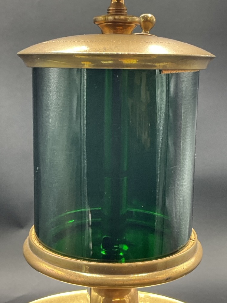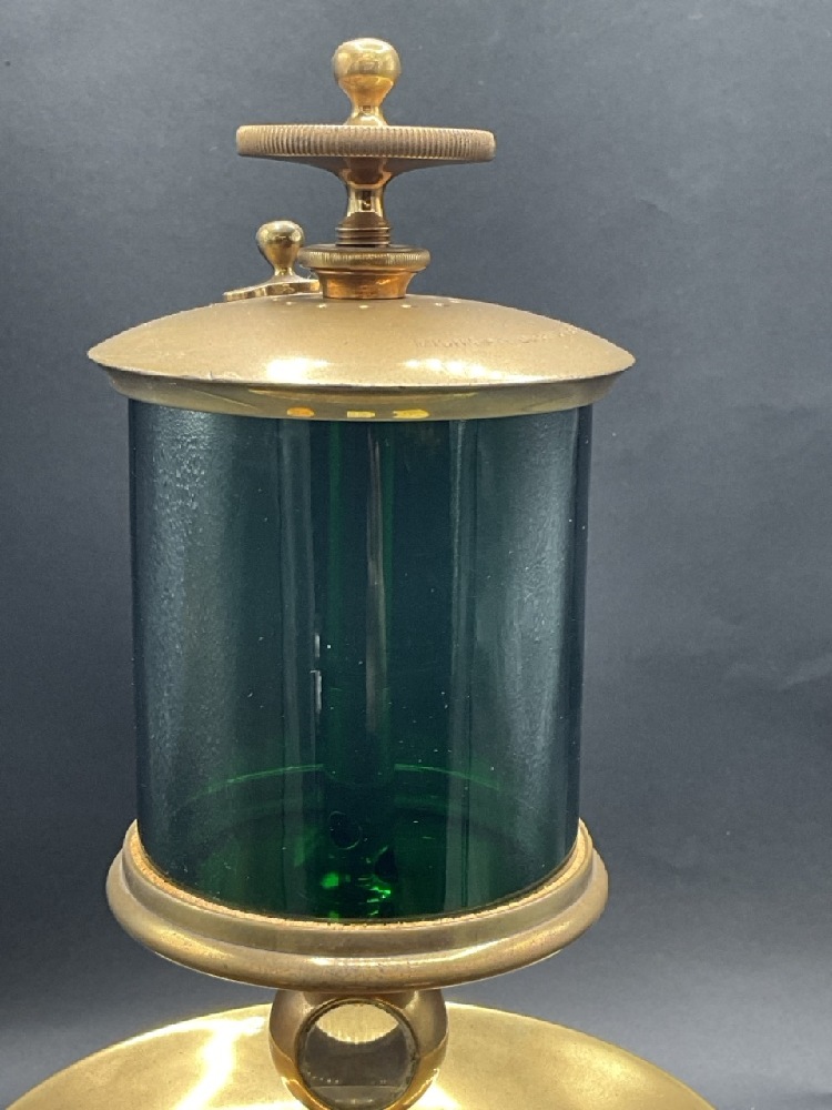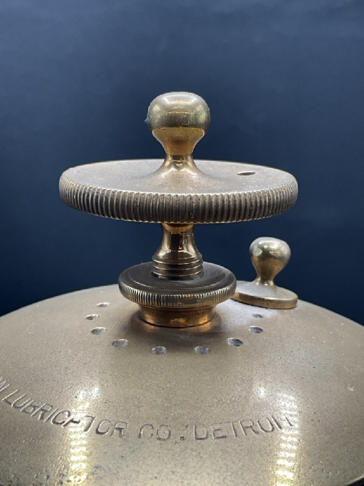 Michigan Lubricator co. Detroit Gravity Feed Oiler for Hit & Miss Engine. Clear glass wrapped with sheet of green plastic. Solid brass.