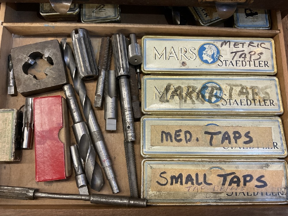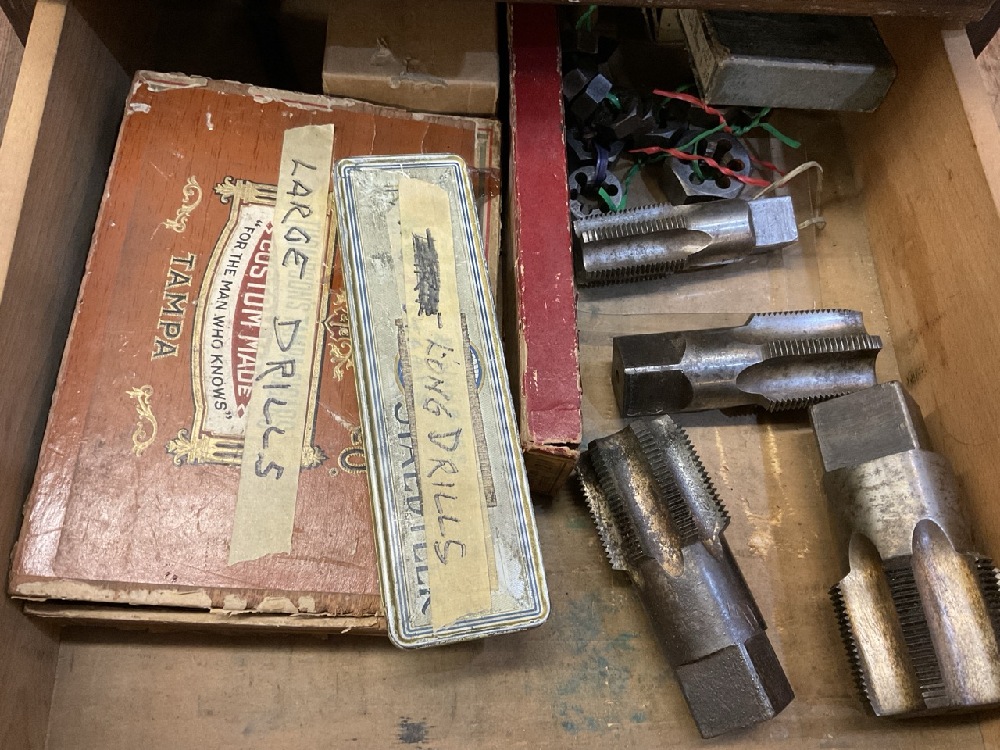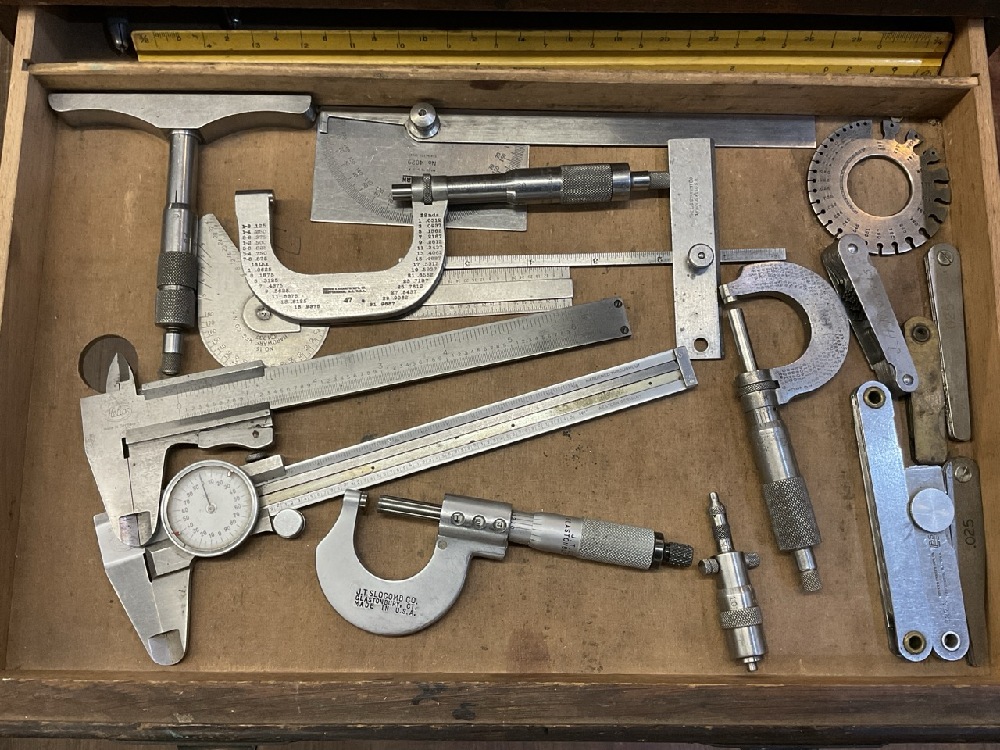 Including: Micrometers by J.T. Slocomb, Starrett, Brown & Sharpe, HELIOS, Starrett Feeler Stock, Tap & Dies, Drill Chucks etc. As seen in photograph preview.