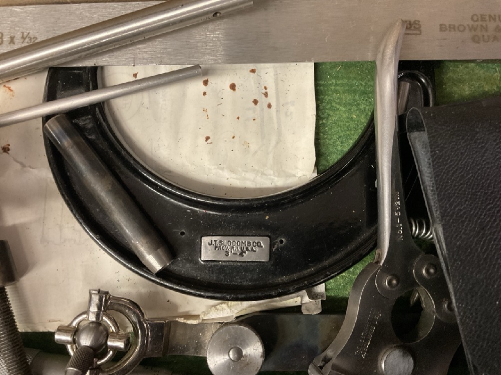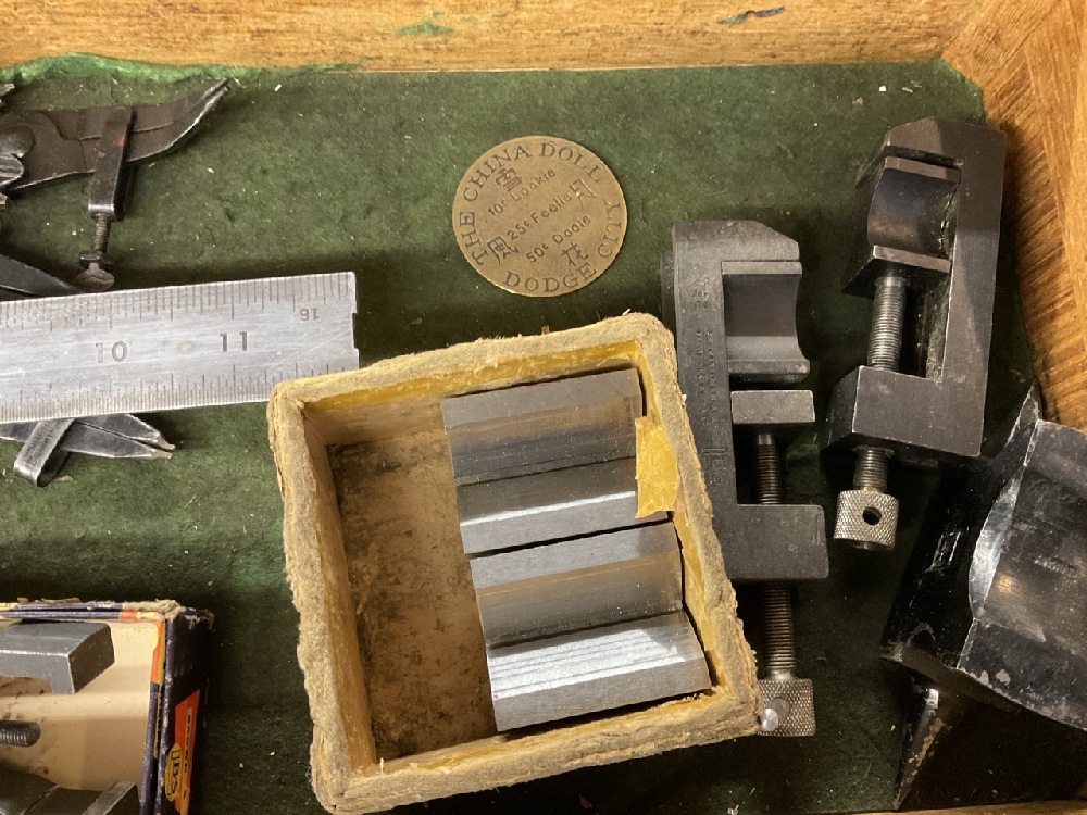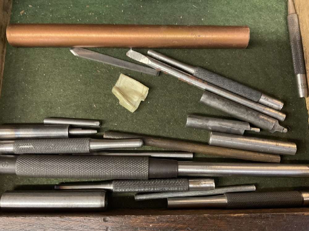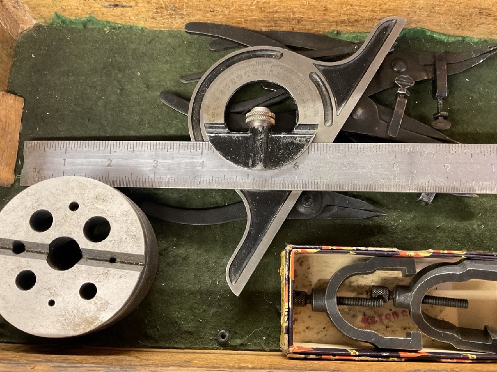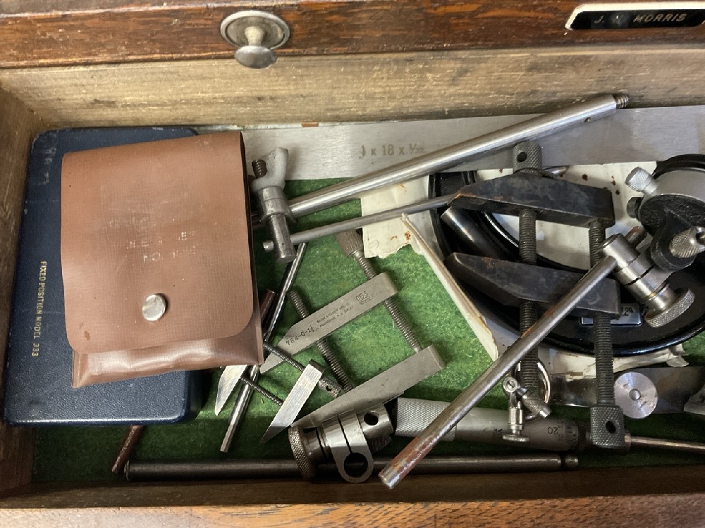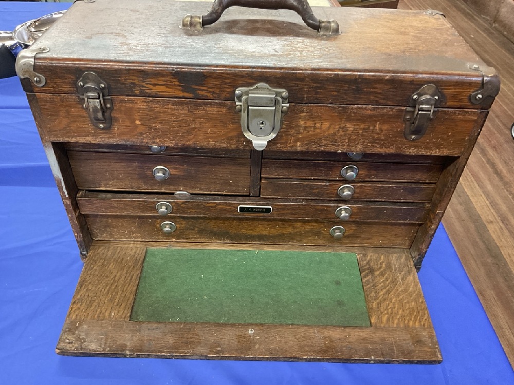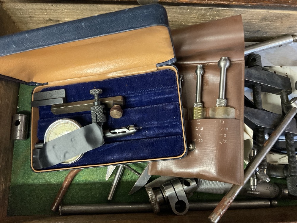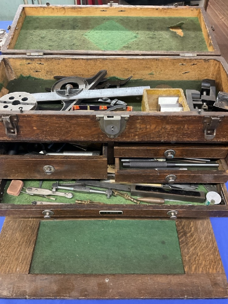 Oak Machinist Tool Box with Contents. Including: Slocomb, Starrett , Millers Falls, Lufkin etc As seen in photograph preview.