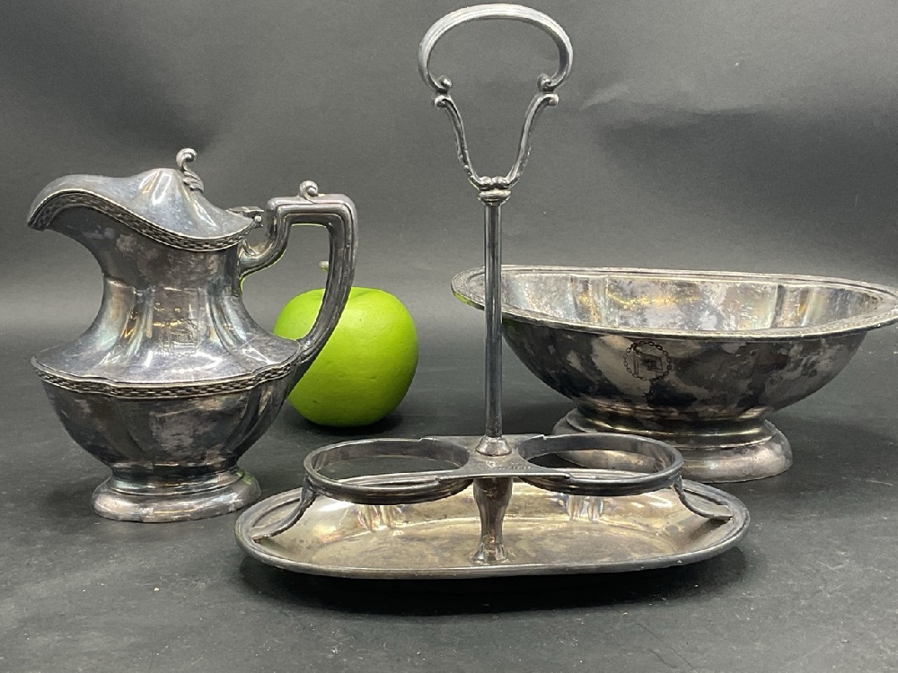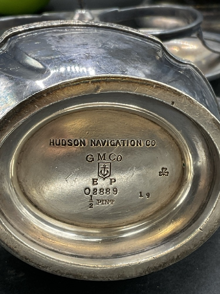 Three (3) Dining room silver plated table wares marked Hudson Navigation Company and caddy marked for Hendrick Hudson. Reed and Barton and Gorham silver plate. Early 20th century.