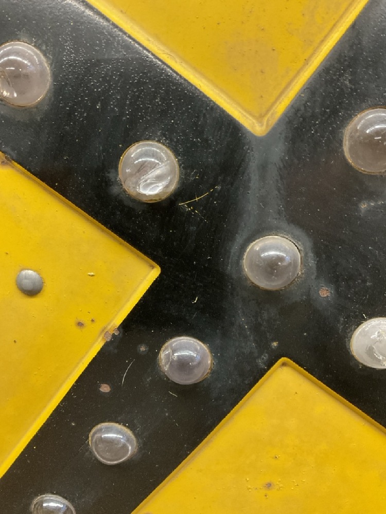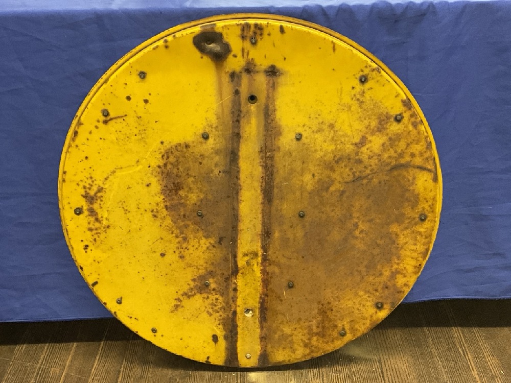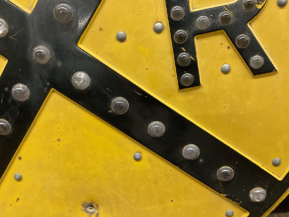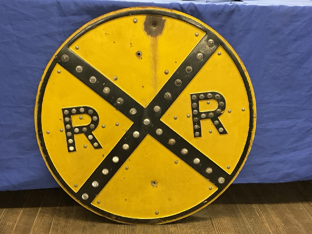 Porcelain Enameled Yellow Cast Iron Railroad Crossing Sign with clear jeweled reflectors.