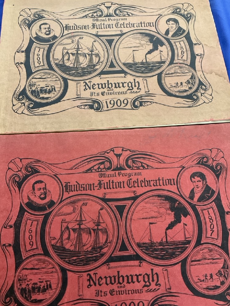 Three Copies of The Official Program for Hudson Fulton Celebration Newburgh, NY. Two original 1909 soft cover copies published by The Quill Club. Third copy is hardcover reprint from 1994.