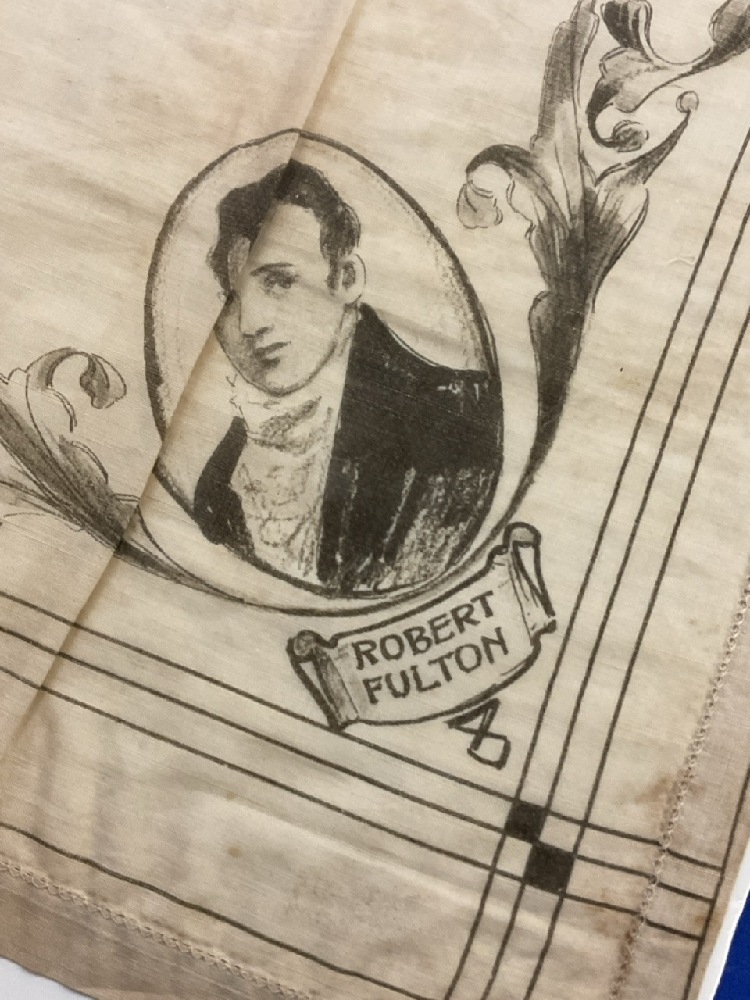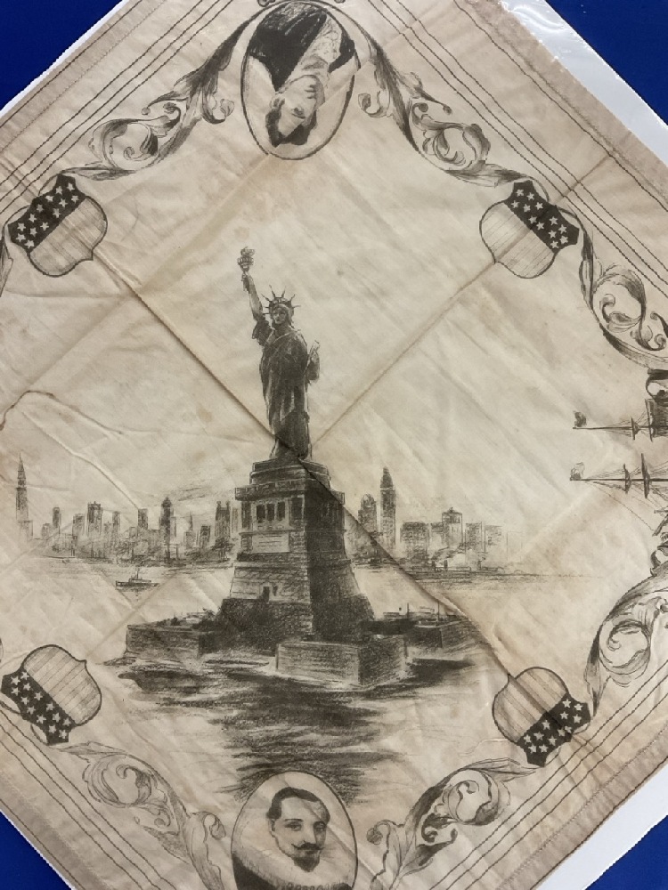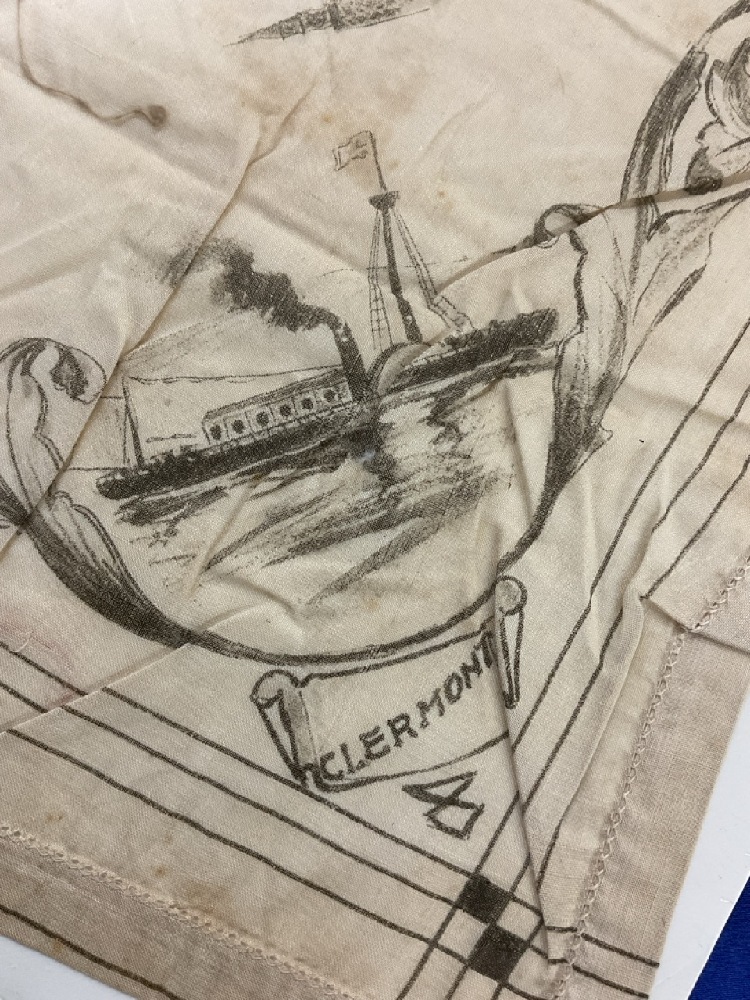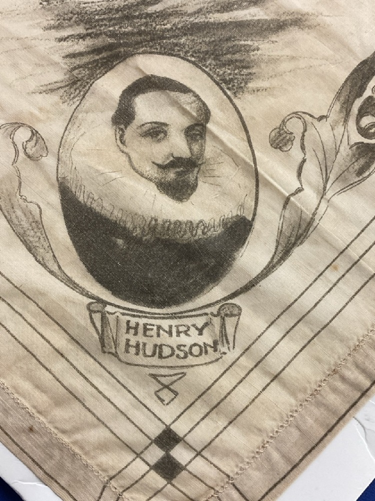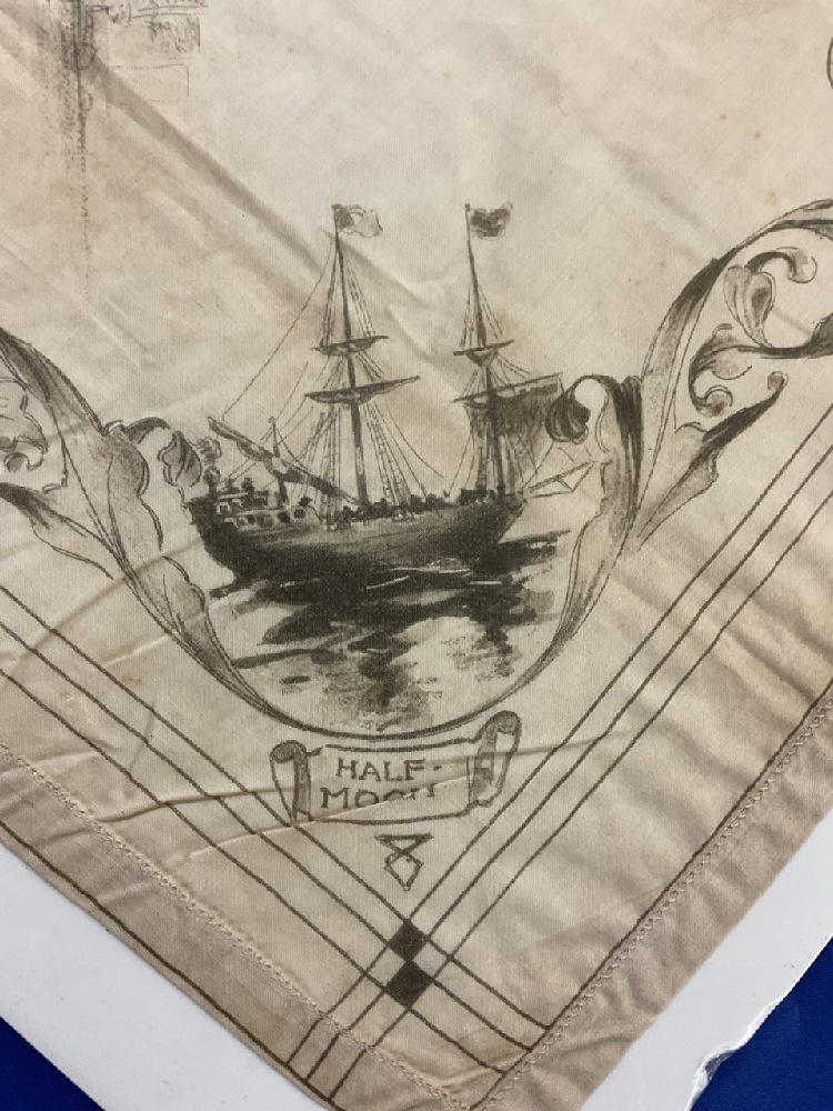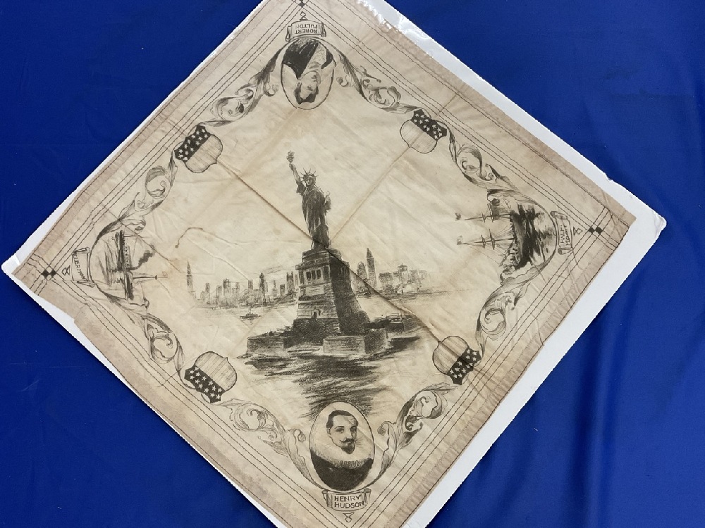 Rare Hudson Fulton Celebration scarf. Centered with Statue of Liberty, Henry Hudson, Half Moon, Robert Fulton and Clermont steam ship.