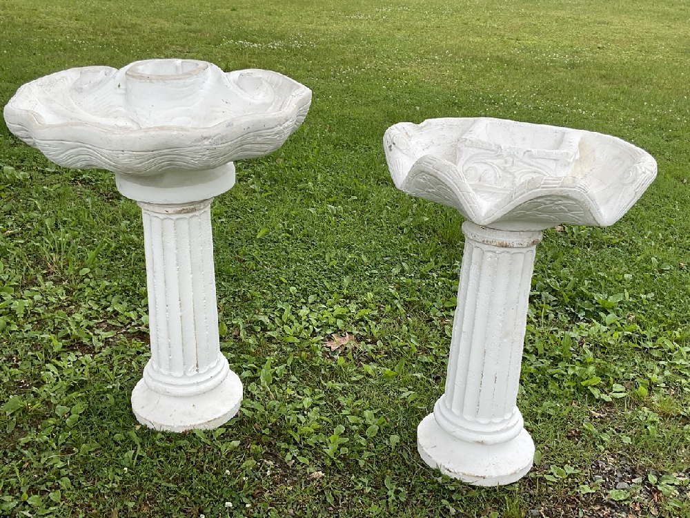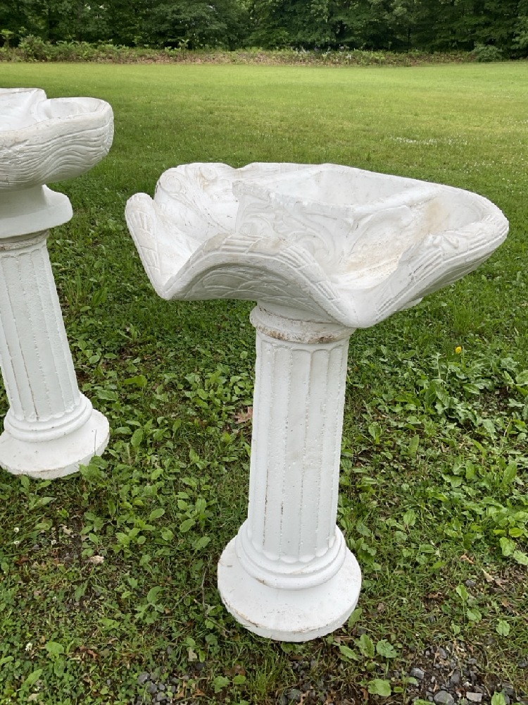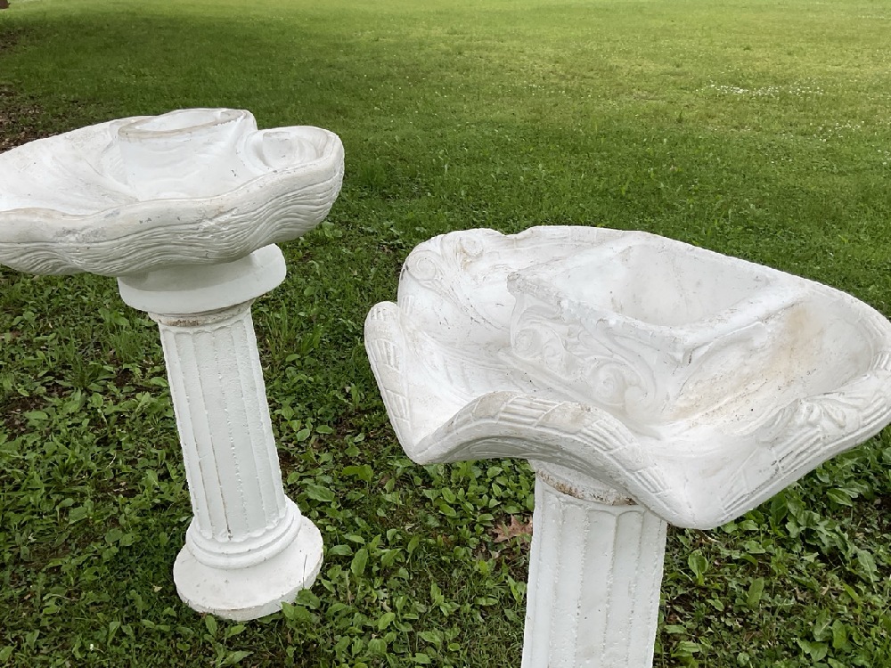 Two concrete columns with shell fountain basins.