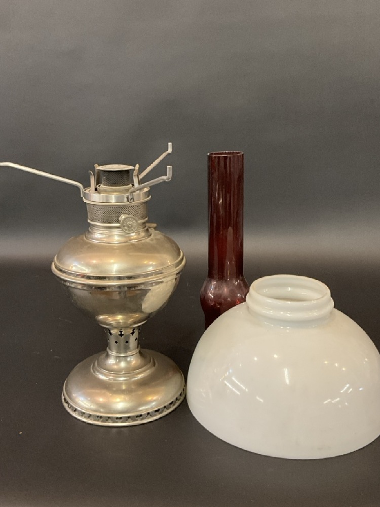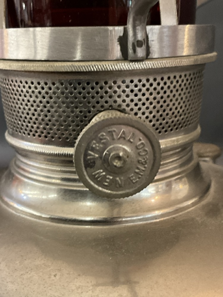 New Vestal Oil Lamp with Ruby and Milk Glass Shade.