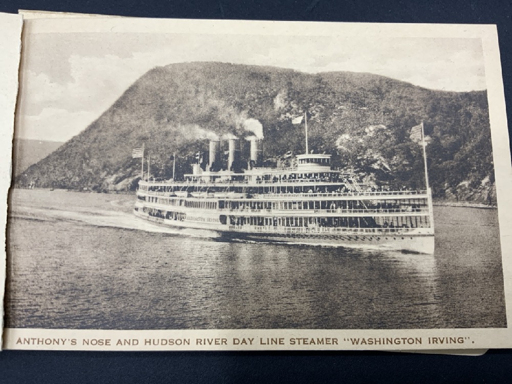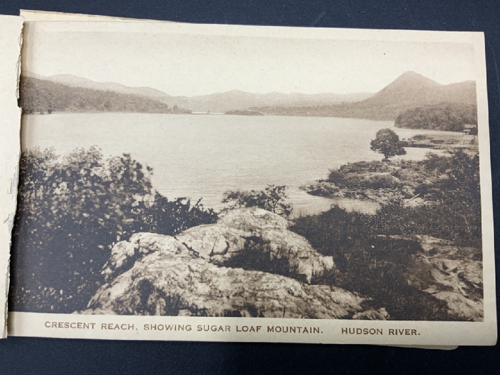 21 Postcards published by The Hudson River Day Line with scenic photos of areas surrounding the Hudson River. Areas include: Stony Point, Bear Mountain, Sugar Loaf Mountain, West Point, Newburgh, Poughkeepsie,Catskill Mountains, etc.