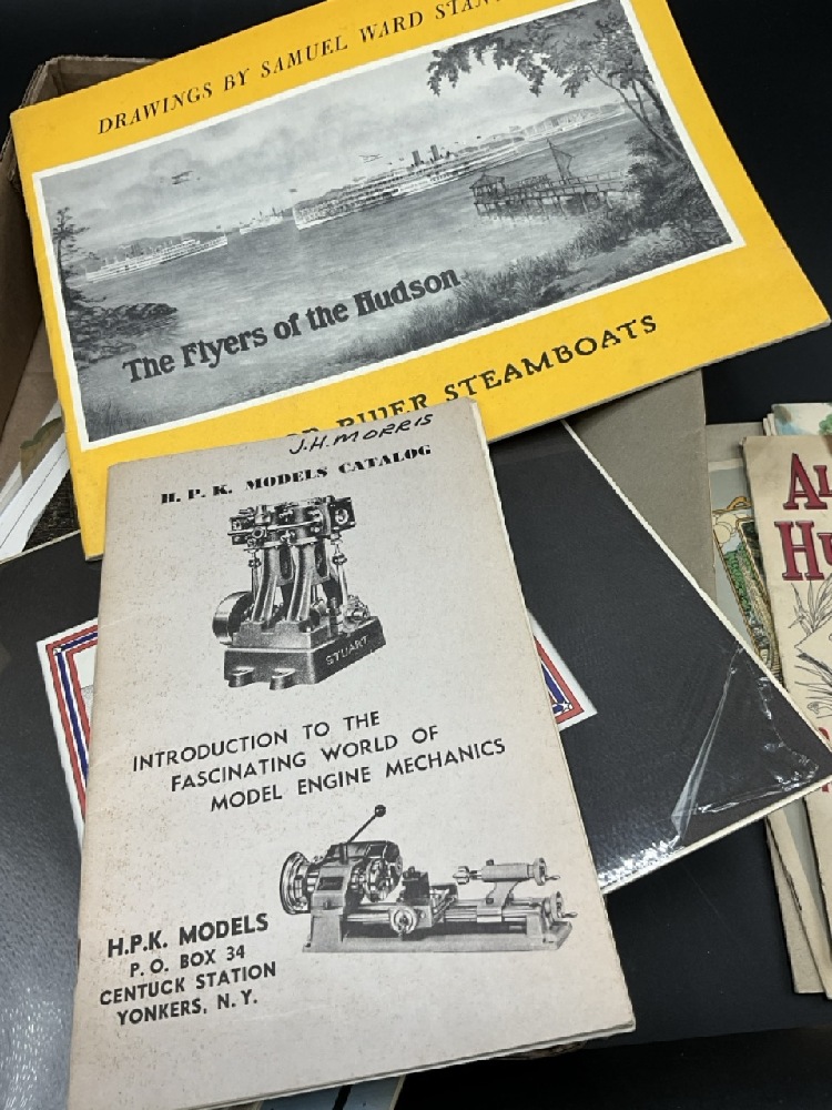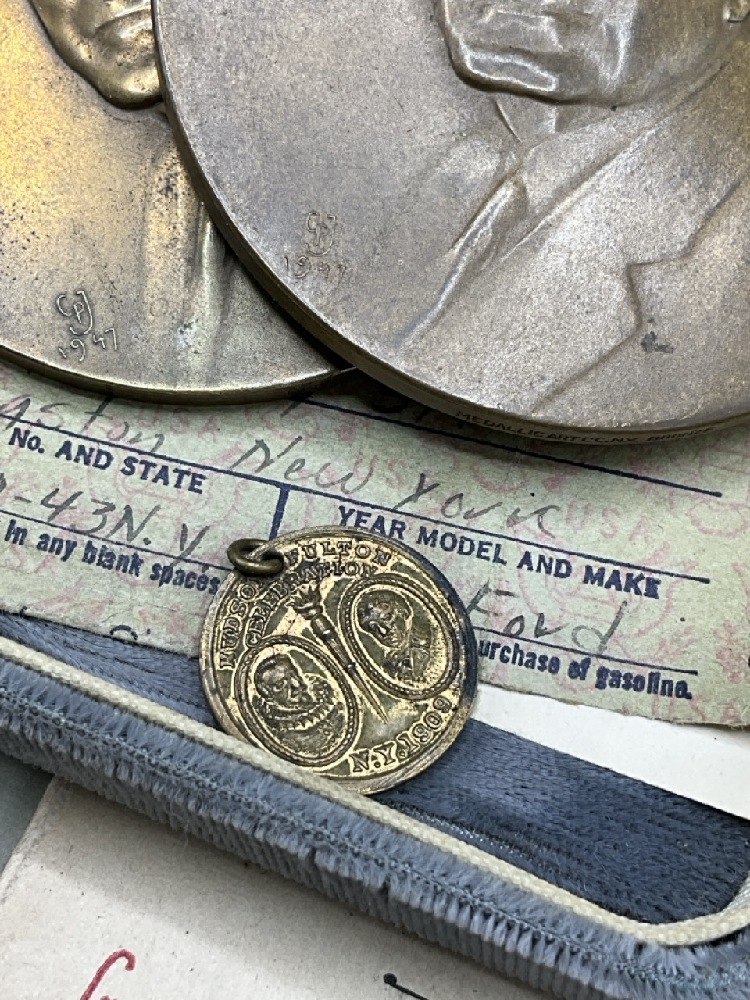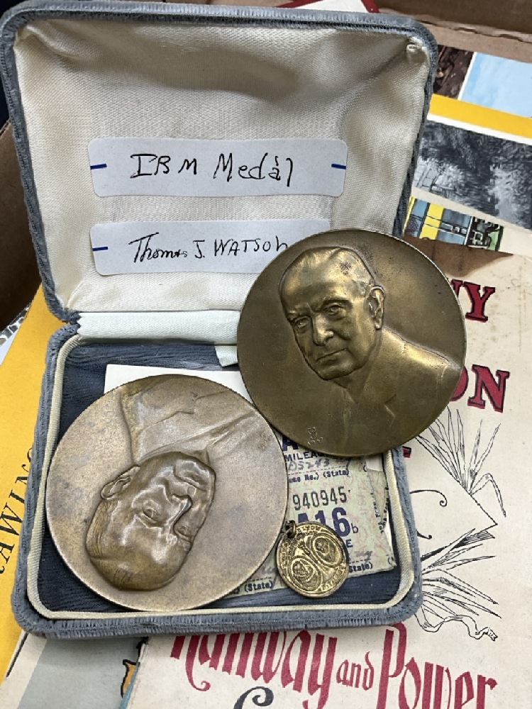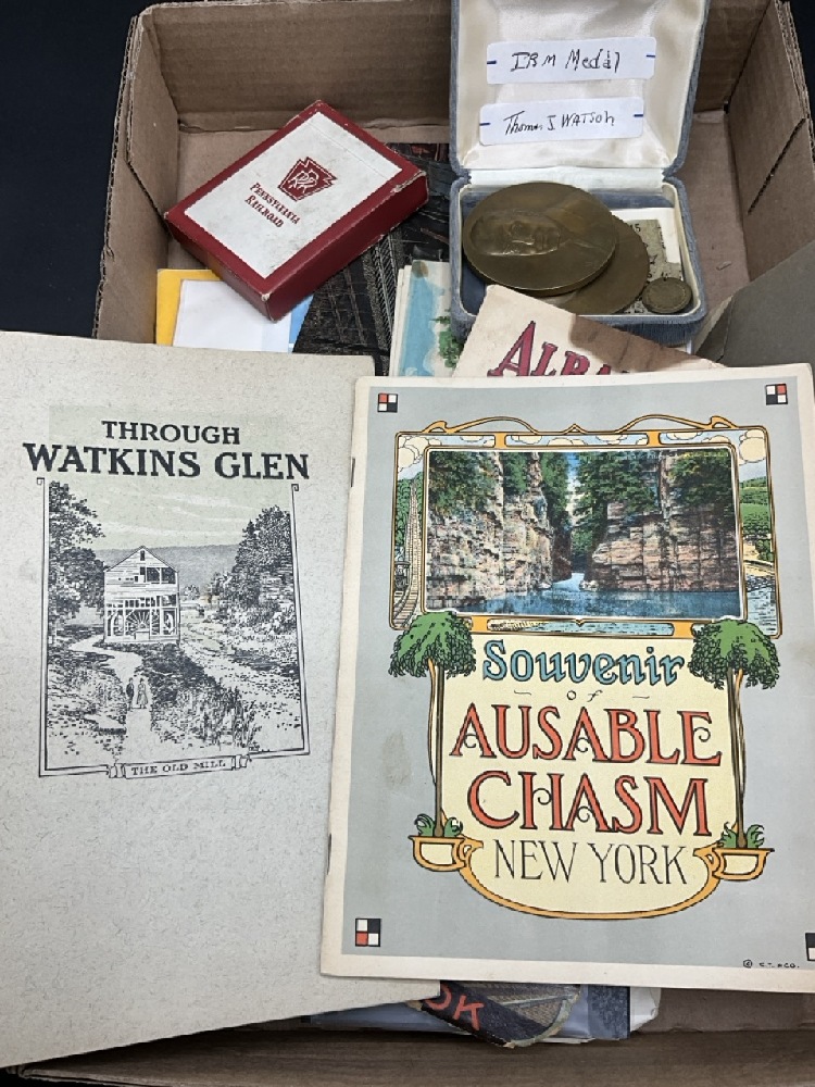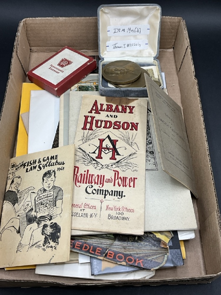 Estate Compiled Paper Ephemera, Bronze IBM Medallions. Train schedules, Hudson Fulton medal, advertising, PRR deck of playing cards etc.