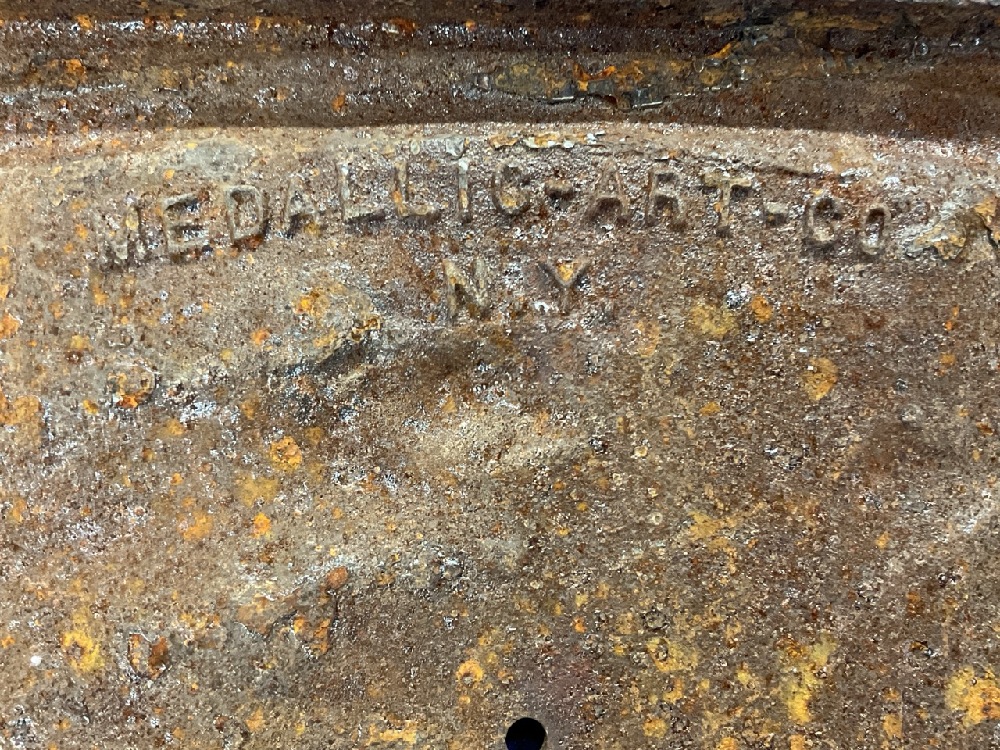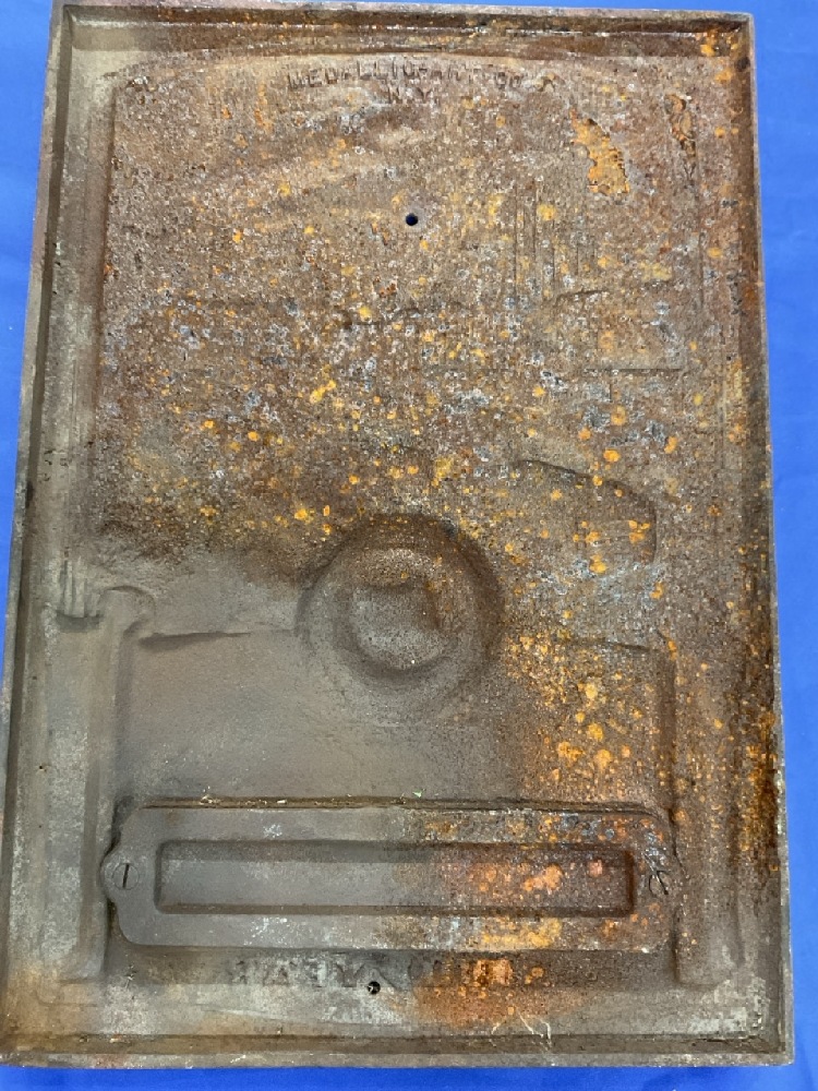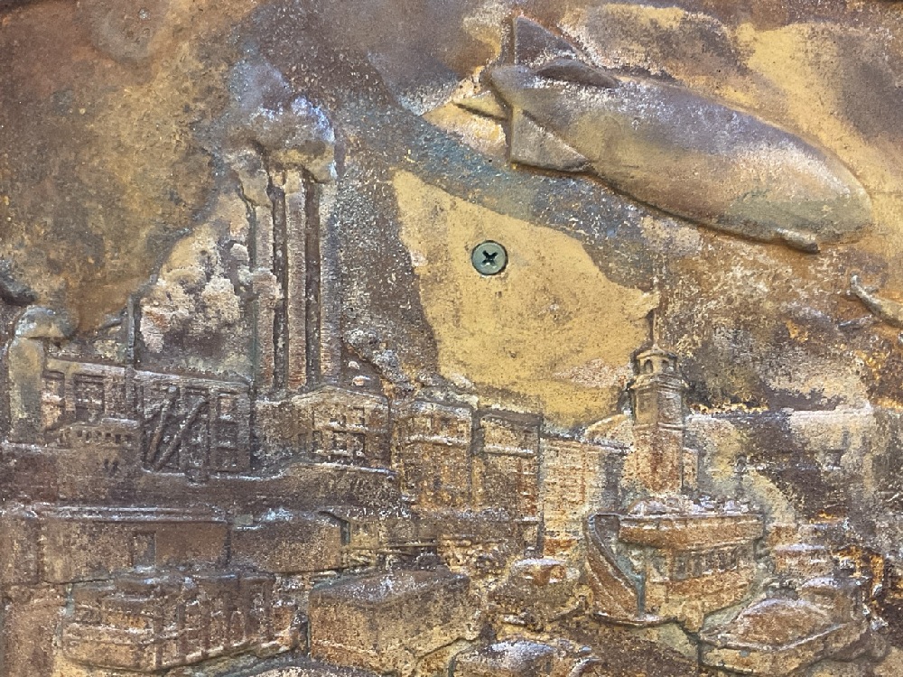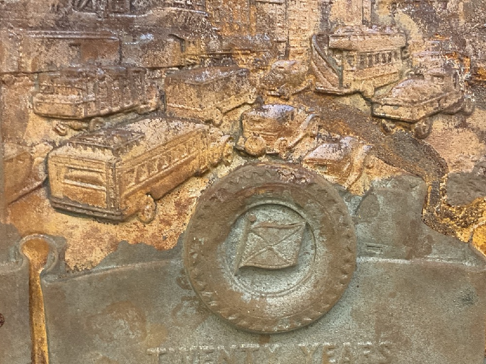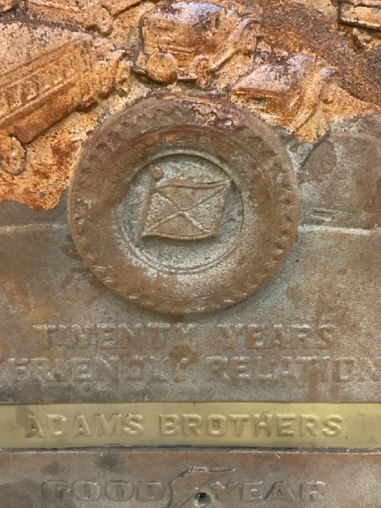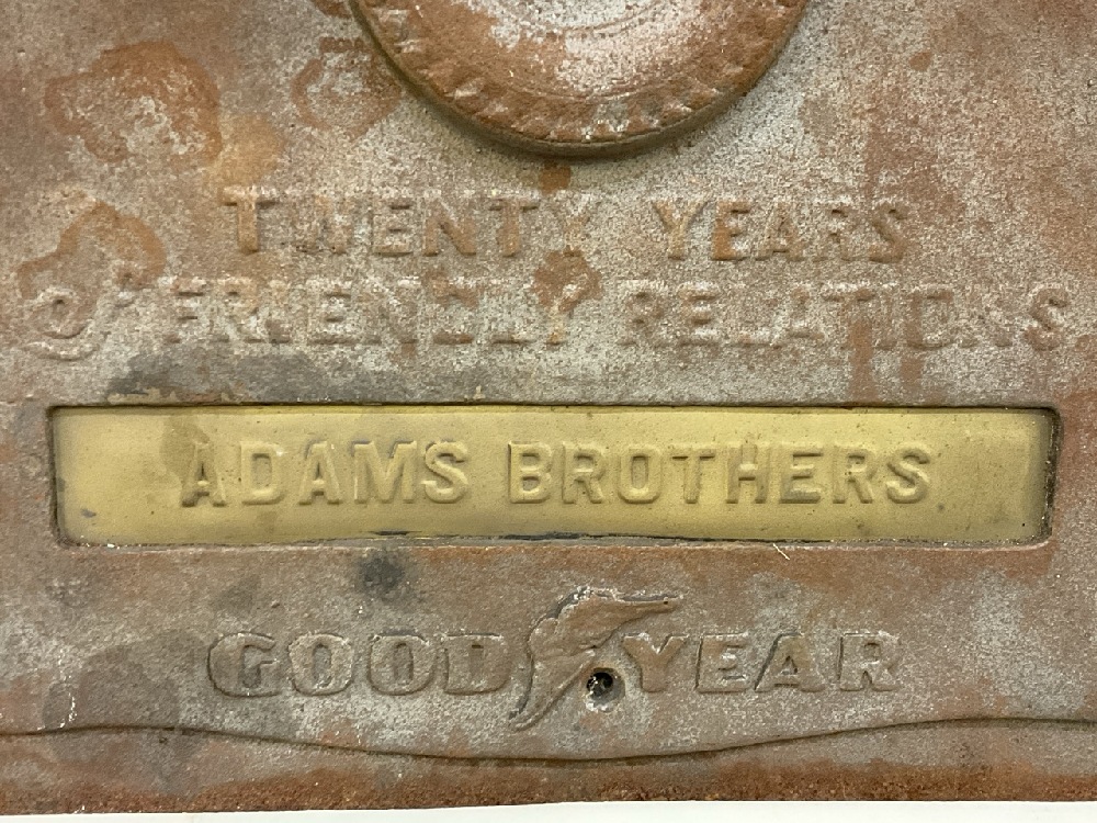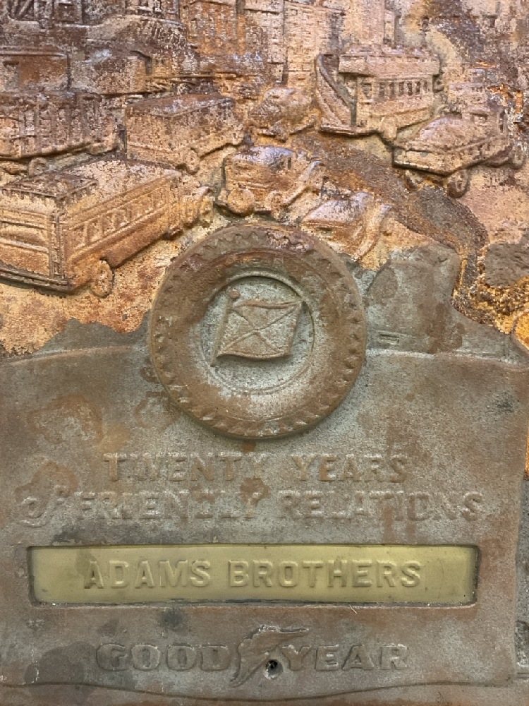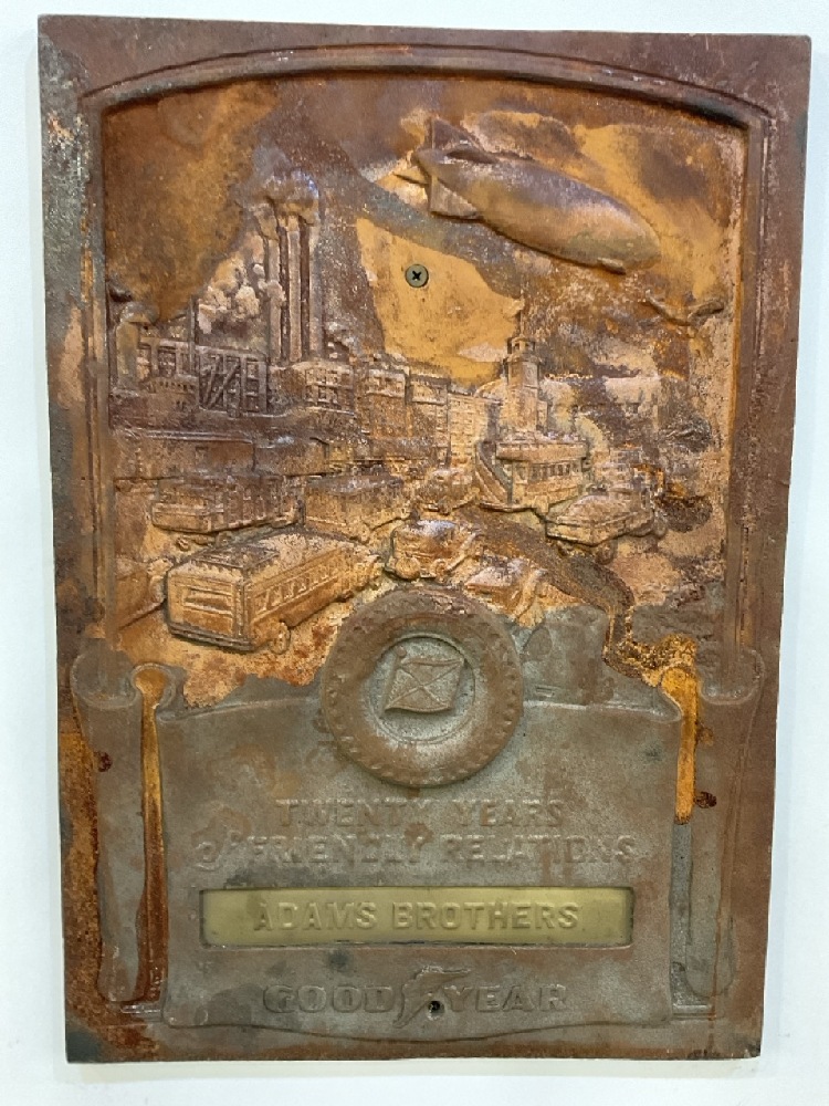 A cast iron building plaque presented to Adam's Bros. Highland Falls, New York from Good Year Tire Celebrating 20 Years of Friendly Relations. Sign dates to 1930's. Made by Medal Art Inc. Features automobiles, blimp and Industrial manufacturing buildings...