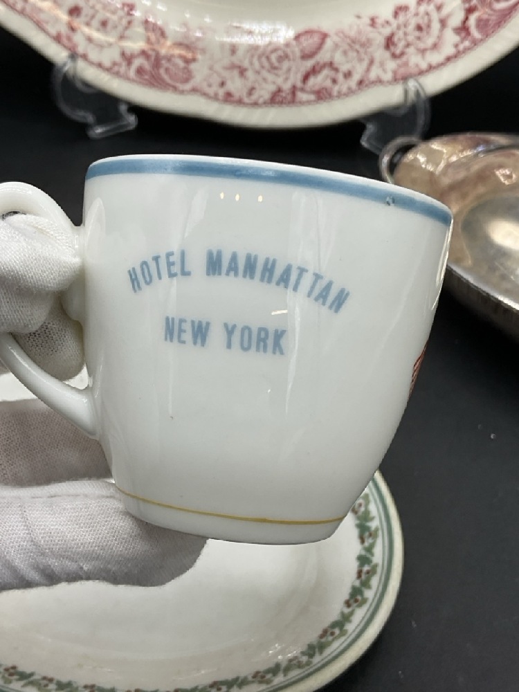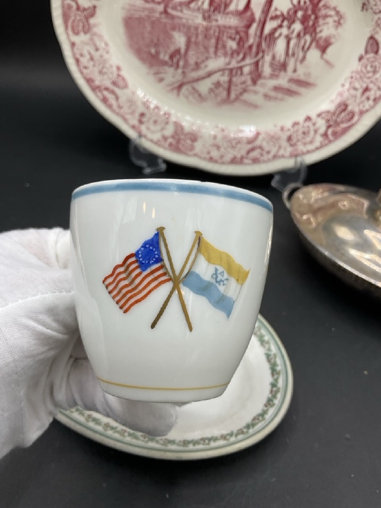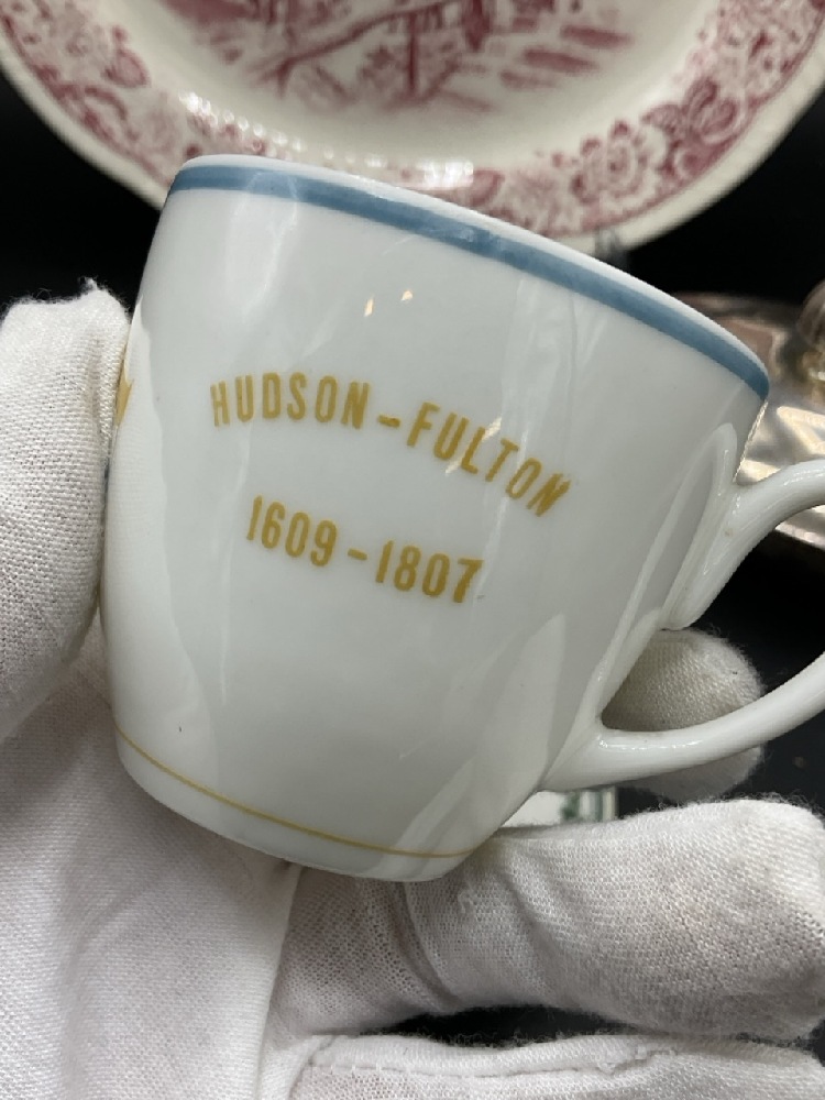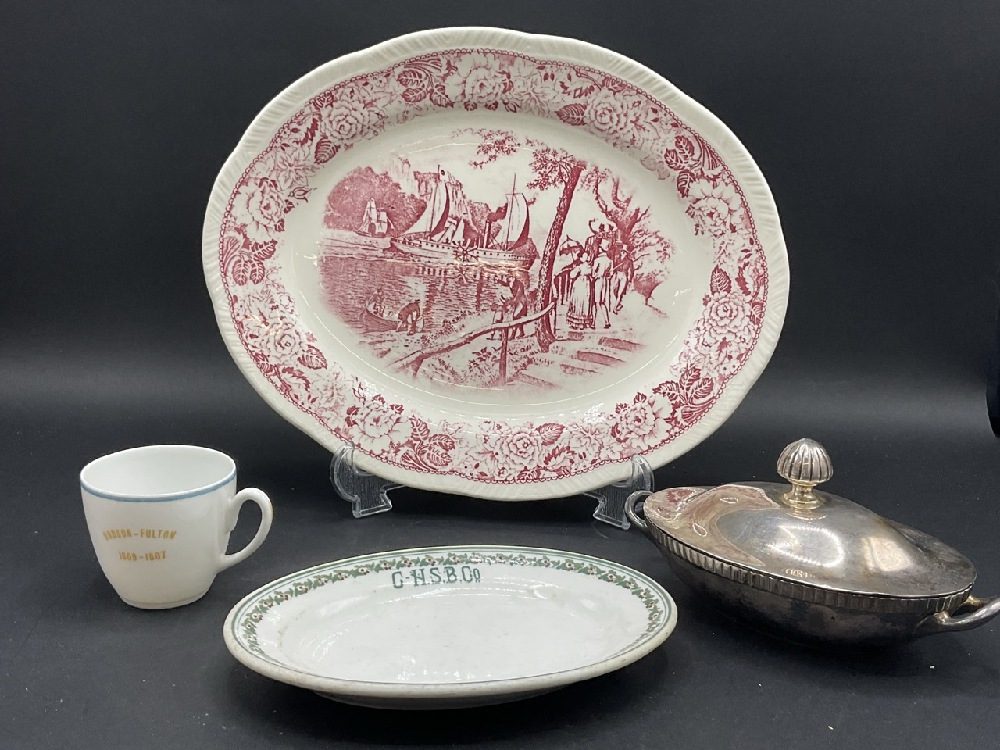 Chsb & Co. Restaurant ware dish Lamberton China Newburgh, NY, Hudson Fulton Celebration Hotel Manhattan Haviland Limoges Teacup, Clermont Historical American Platter and Grosvenor Gorham silver plated lidded dish.