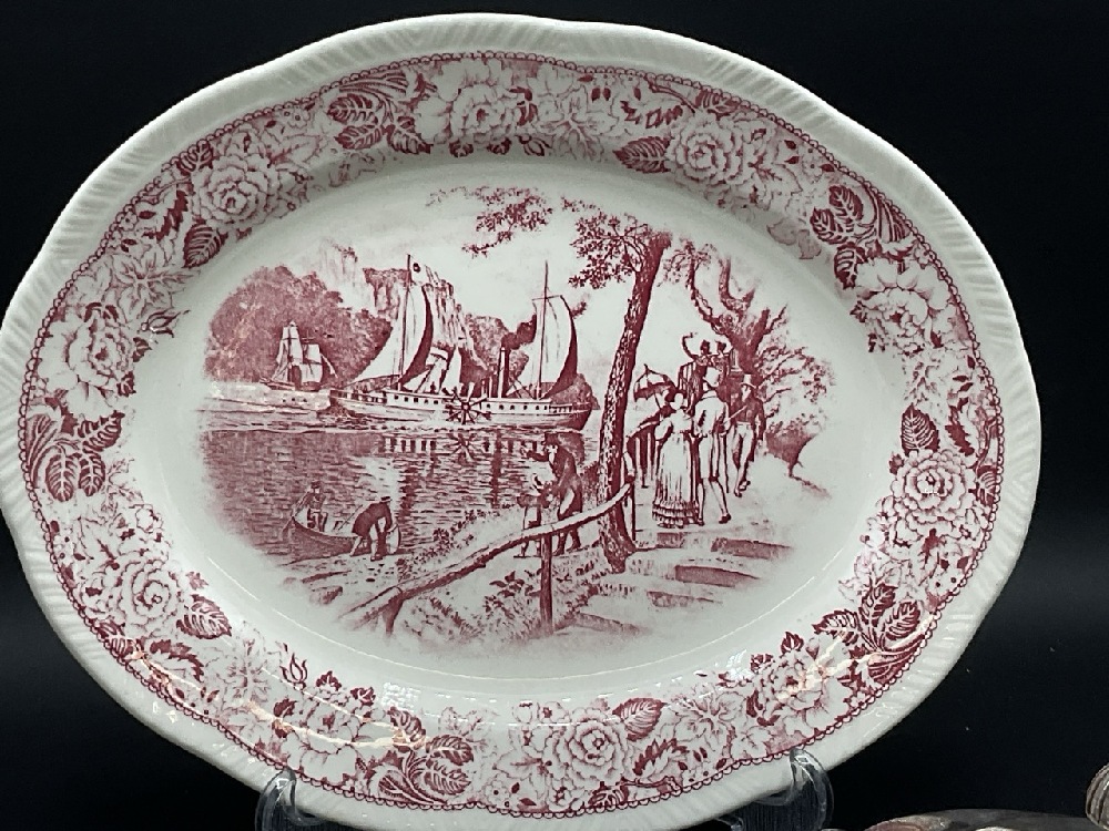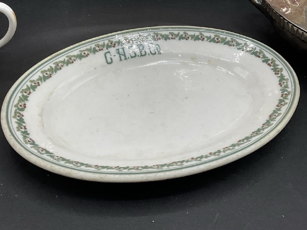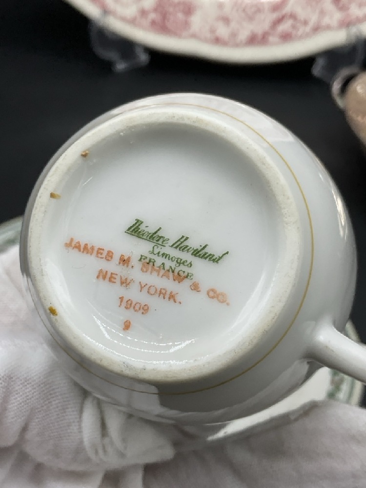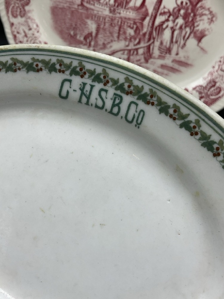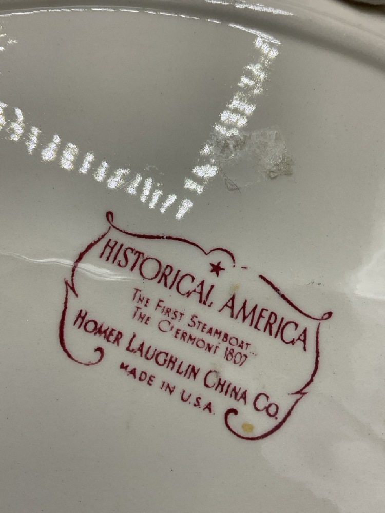 Chsb & Co. Restaurant ware dish Lamberton China Newburgh, NY, Hudson Fulton Celebration Hotel Manhattan Haviland Limoges Teacup, Clermont Historical American Platter and Grosvenor Gorham silver plated lidded dish.