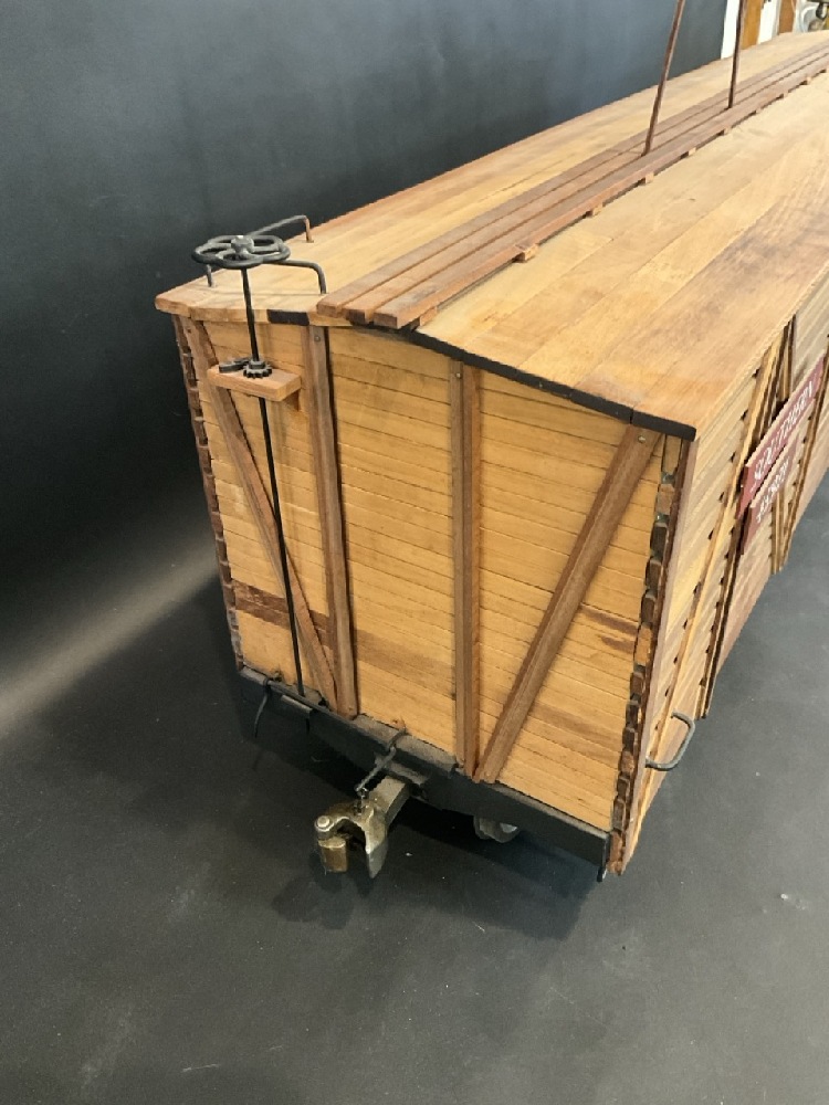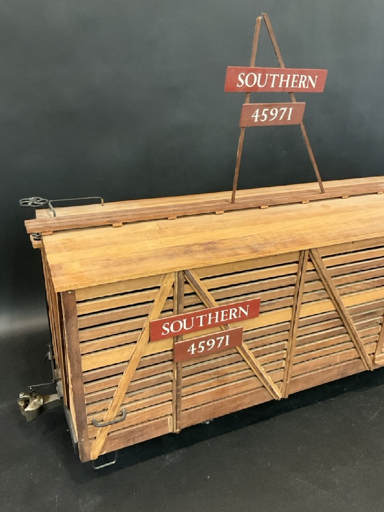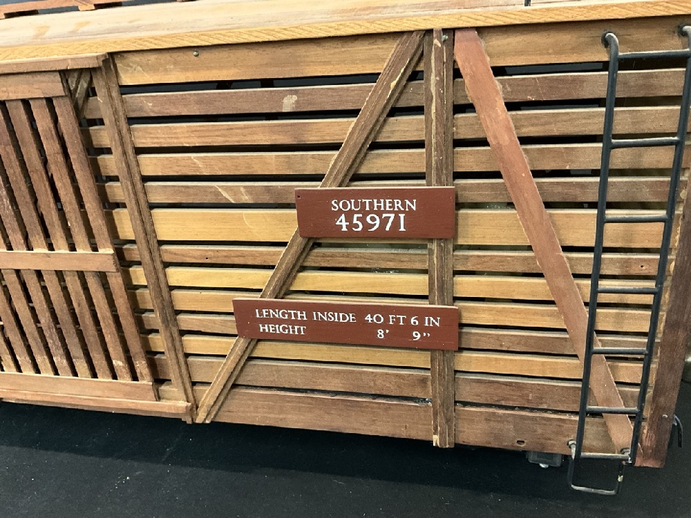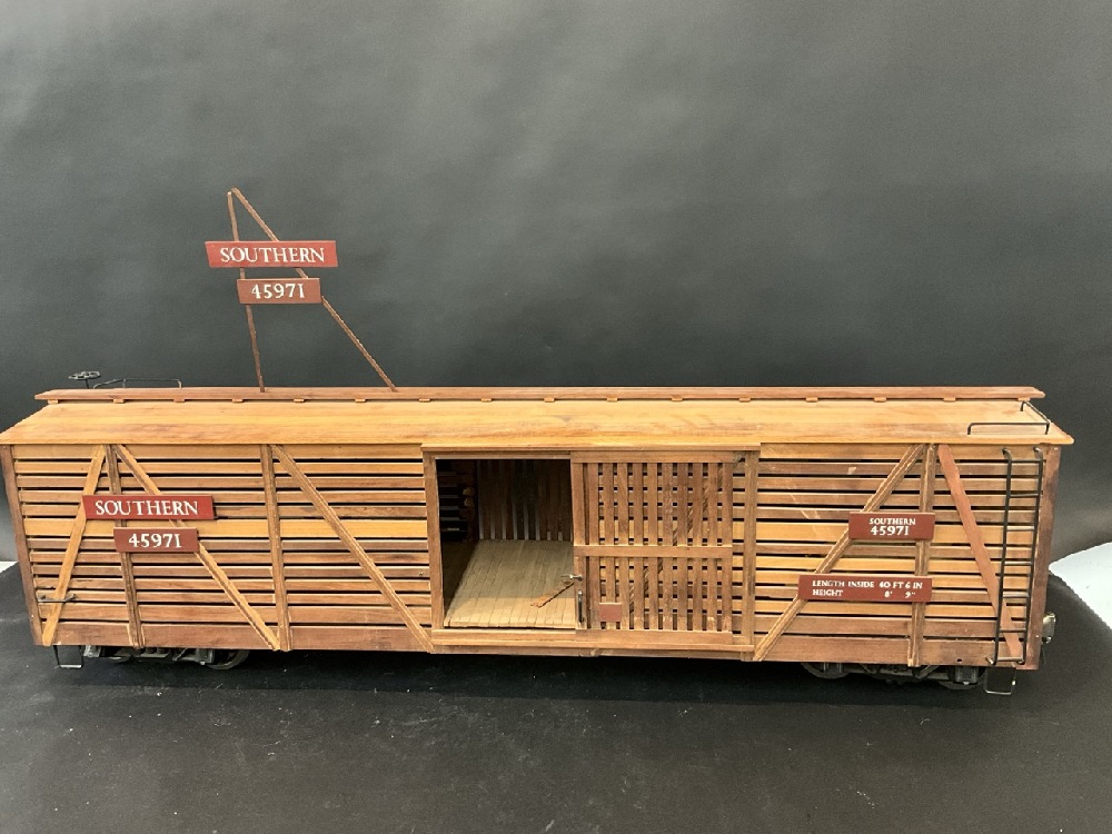 The Southern 45971 Large Size Handmade Railroad Cattle Car by Joe Krojicek. Sliding door. Crafted in mahogany wood.