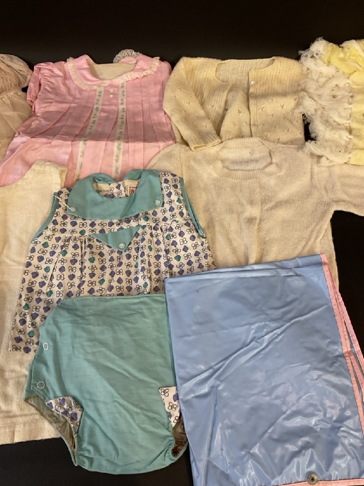 Nine (9) Vintage Children’s Clothes, Two (2) Blankets, one hat, one set of booties.