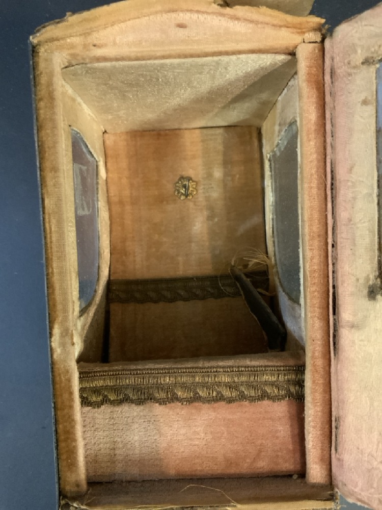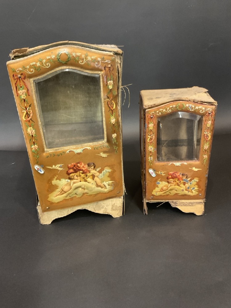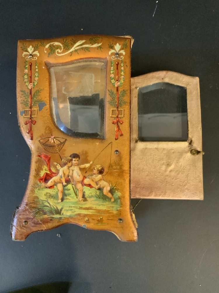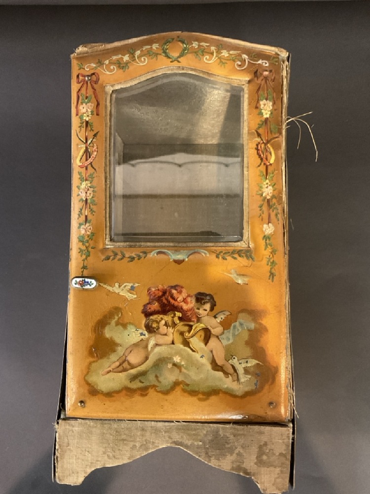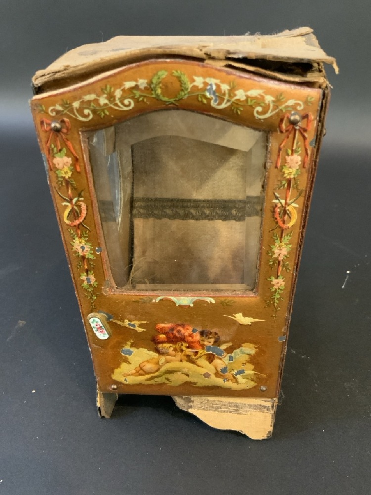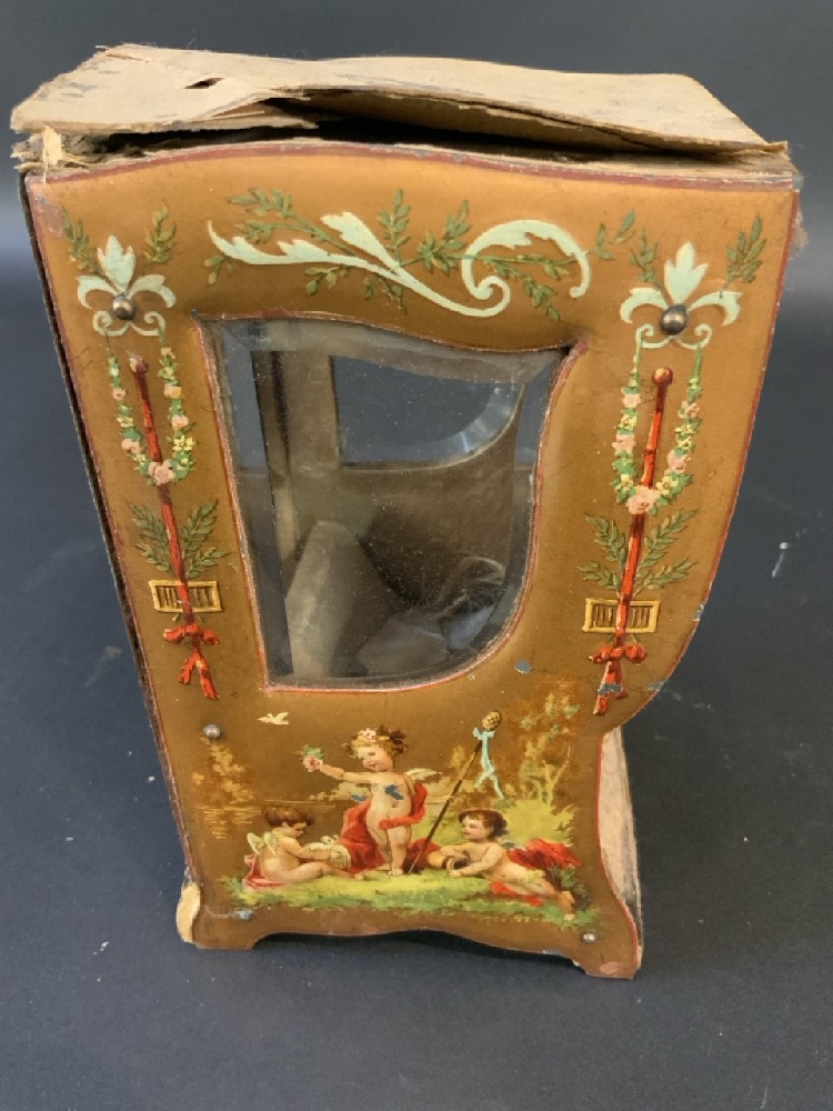 Antique French Miniature Sedan Chair Jewelry Chest Vitrine. Handpainted Putti, Ribbons and Floral Decoration. Signed at base Procede Brevete Modele Depose.