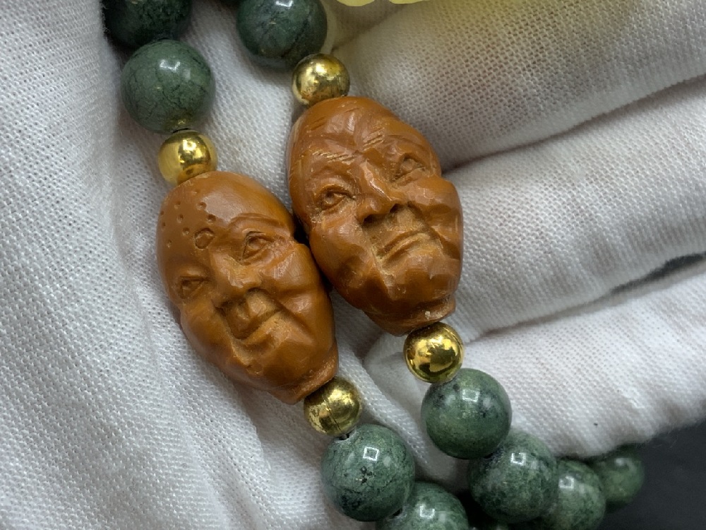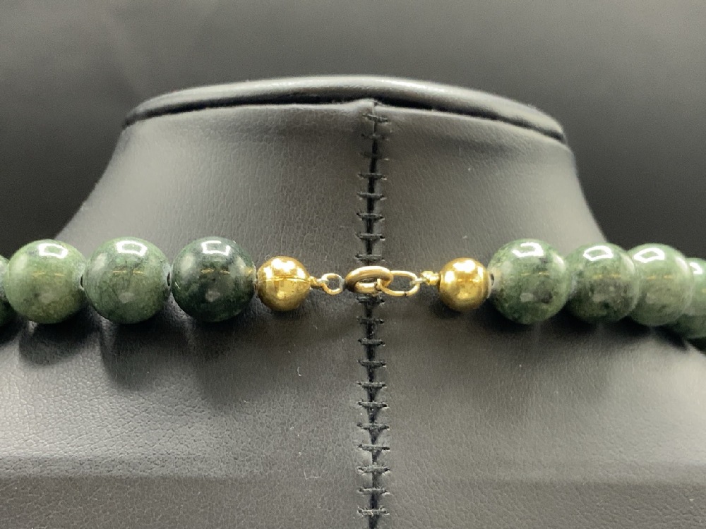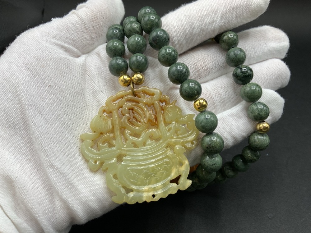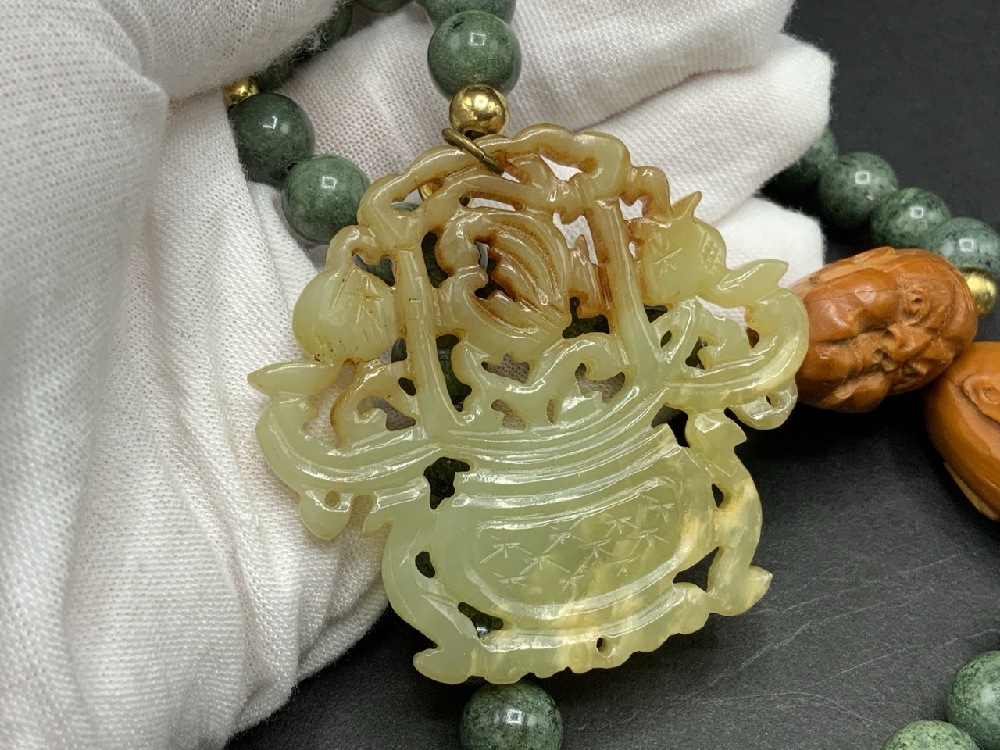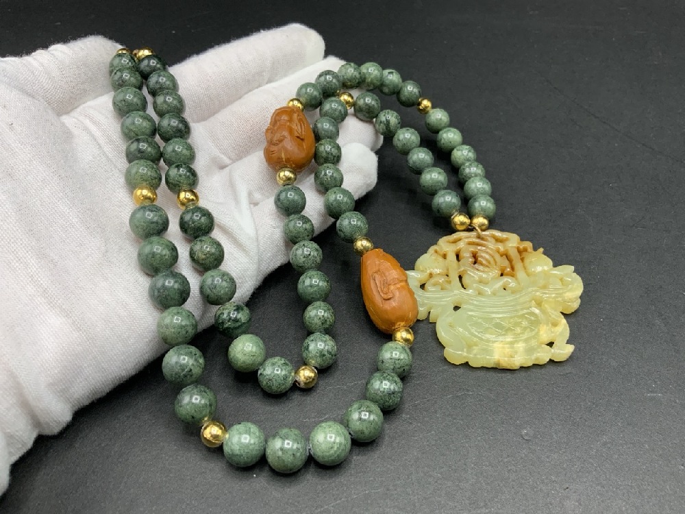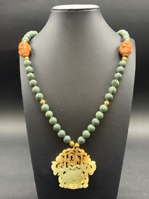 Chinese Carved Jade Pendant Necklace with Green Stones 28" length.