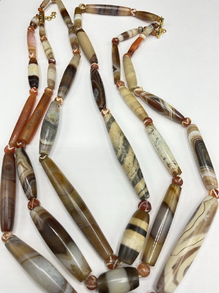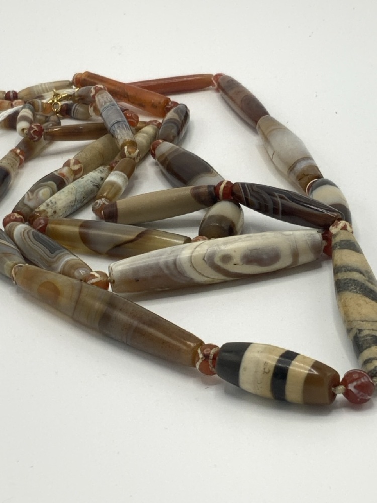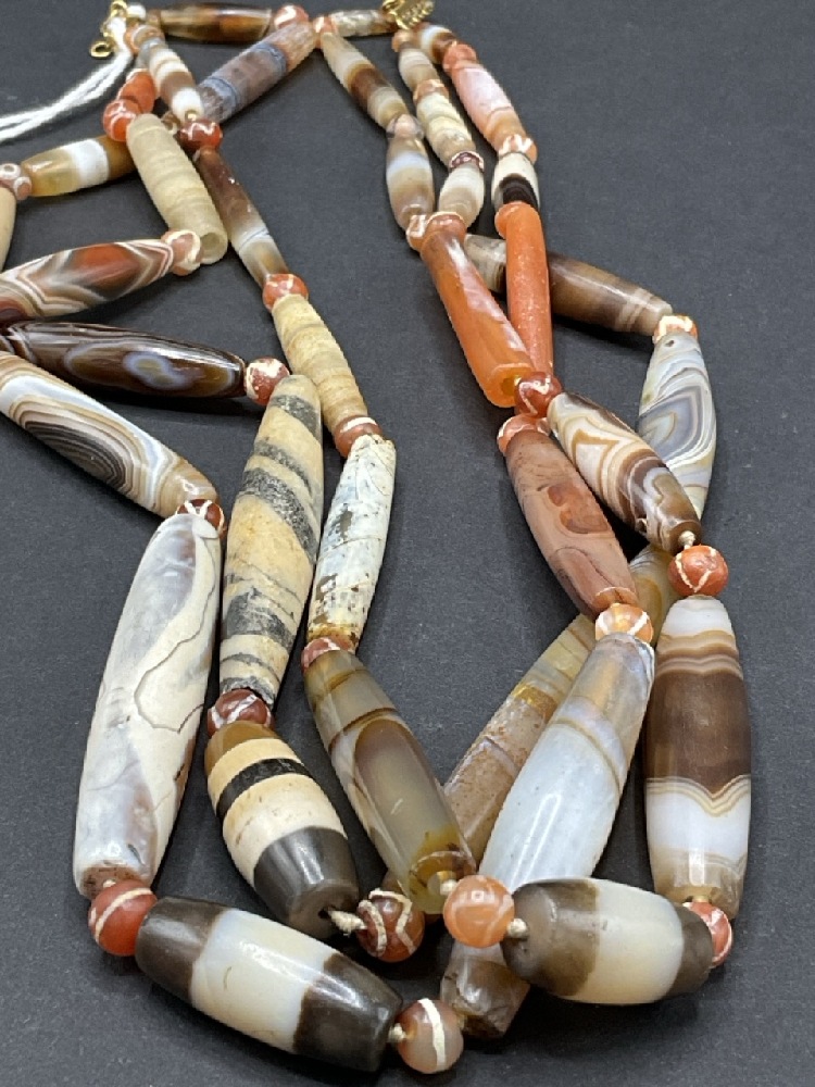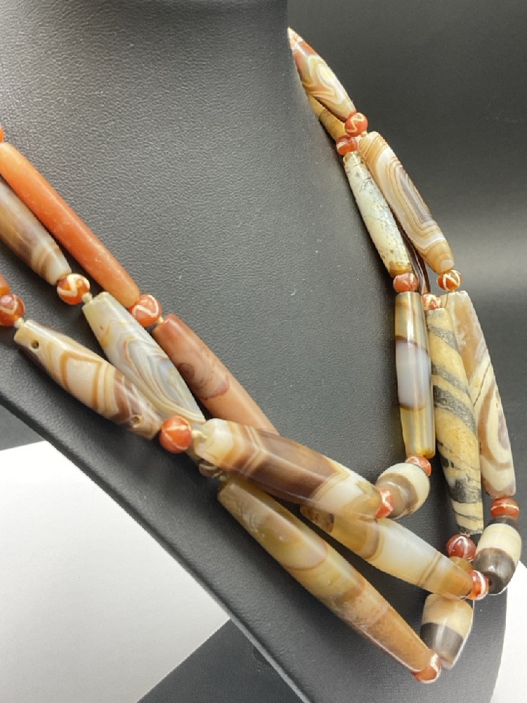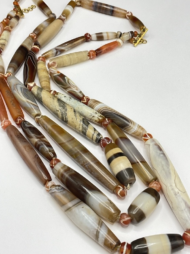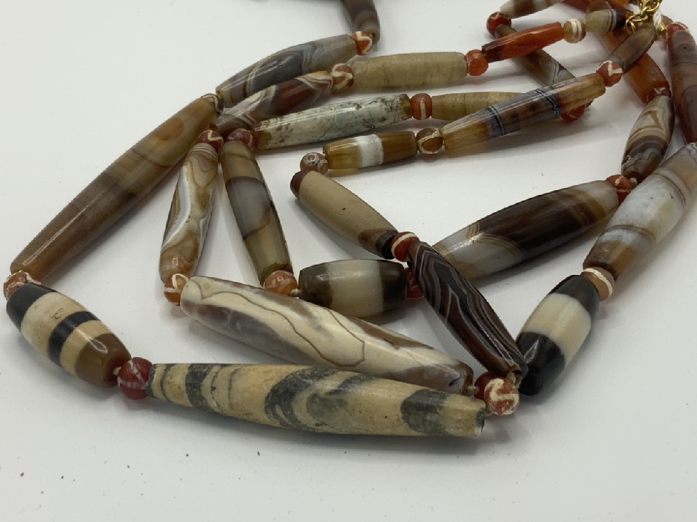 A Multi Strand Natural Agate Barrel Bead Necklace with 22K Gold. Each stone not tested to be Agate stone. Spacers additionally may be glass. Please inquire with questions if needed.