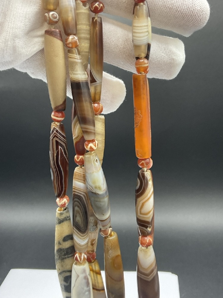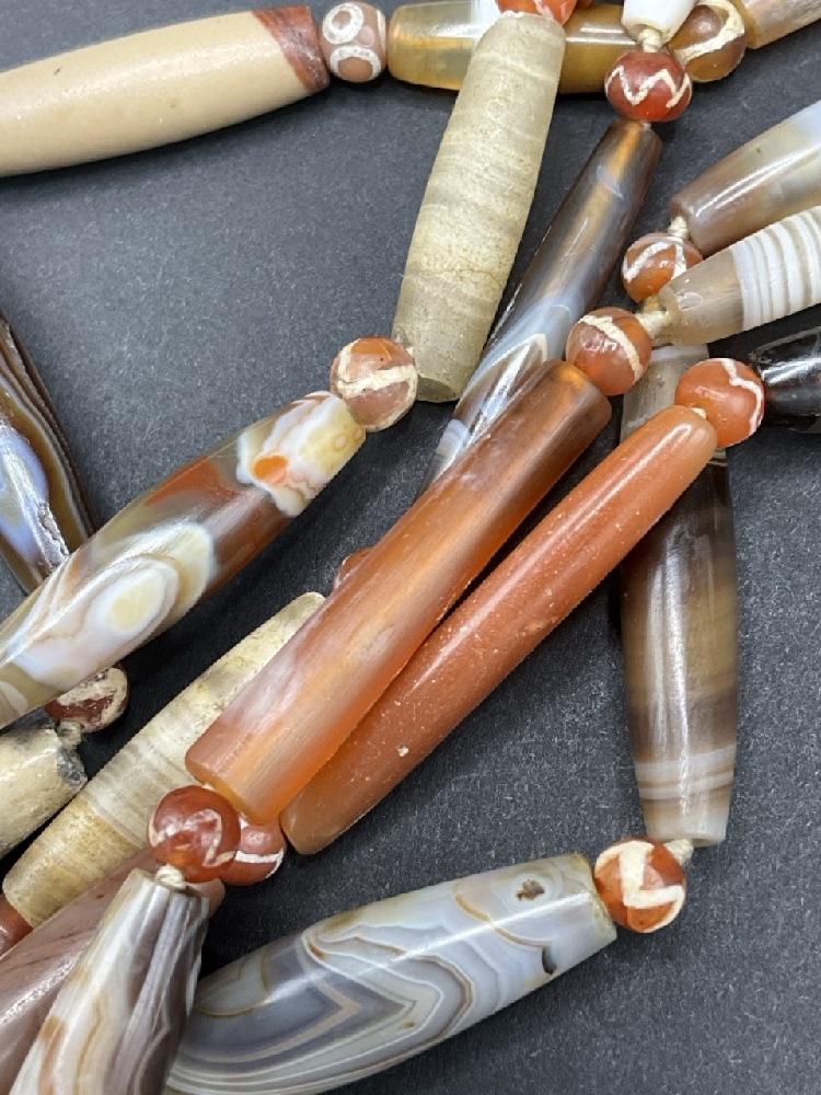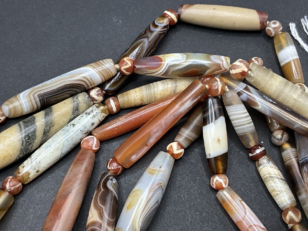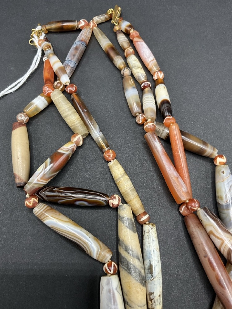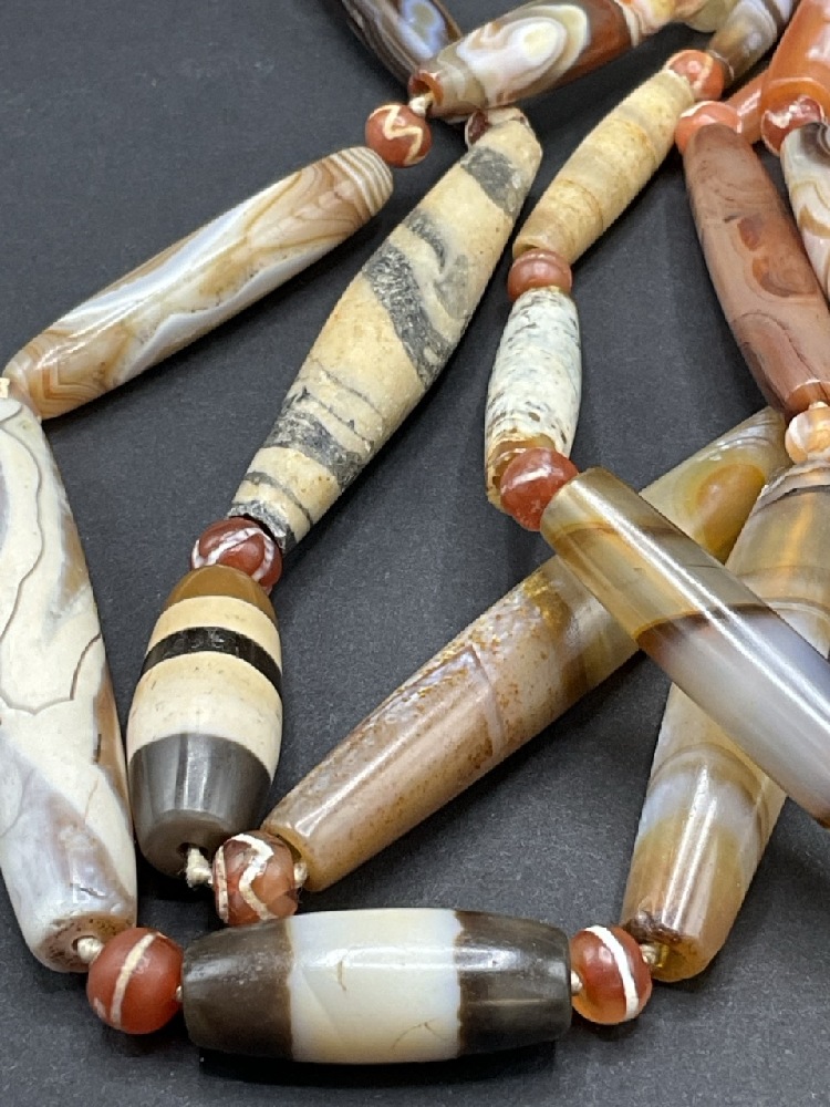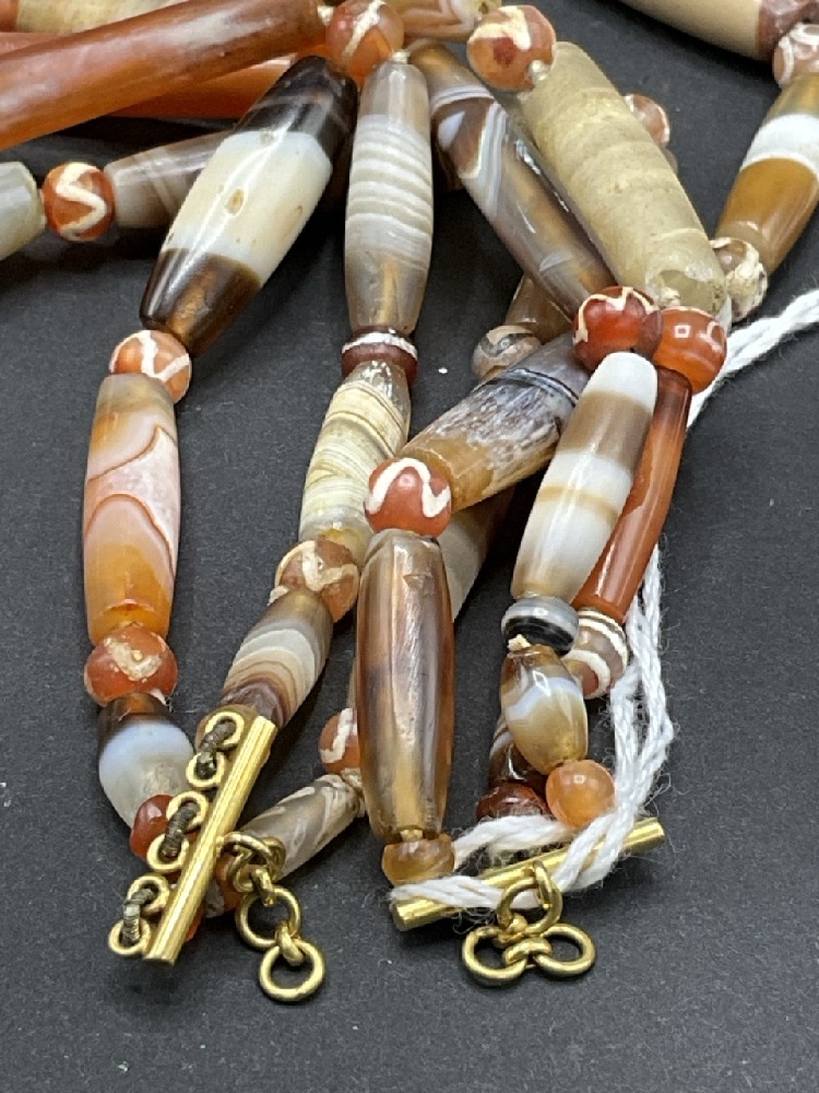 A Multi Strand Natural Agate Barrel Bead Necklace with 22K Gold. Each stone not tested to be Agate stone. Spacers additionally may be glass. Please inquire with questions if needed.