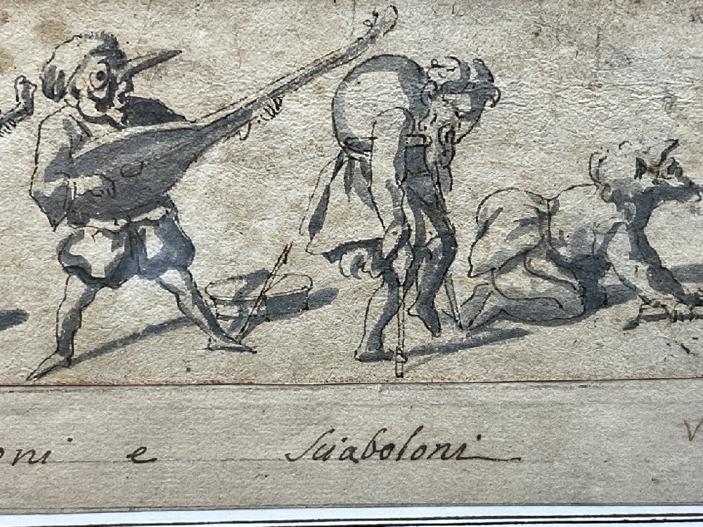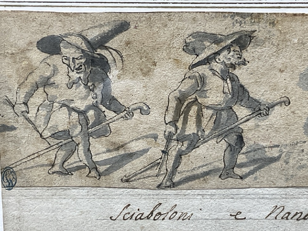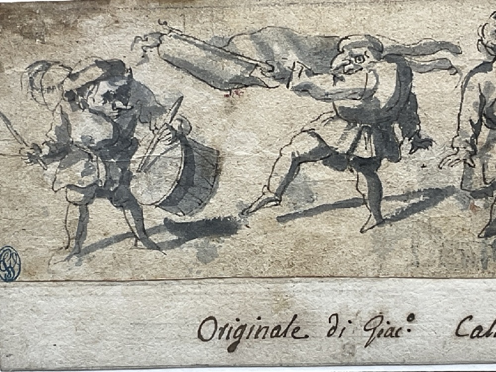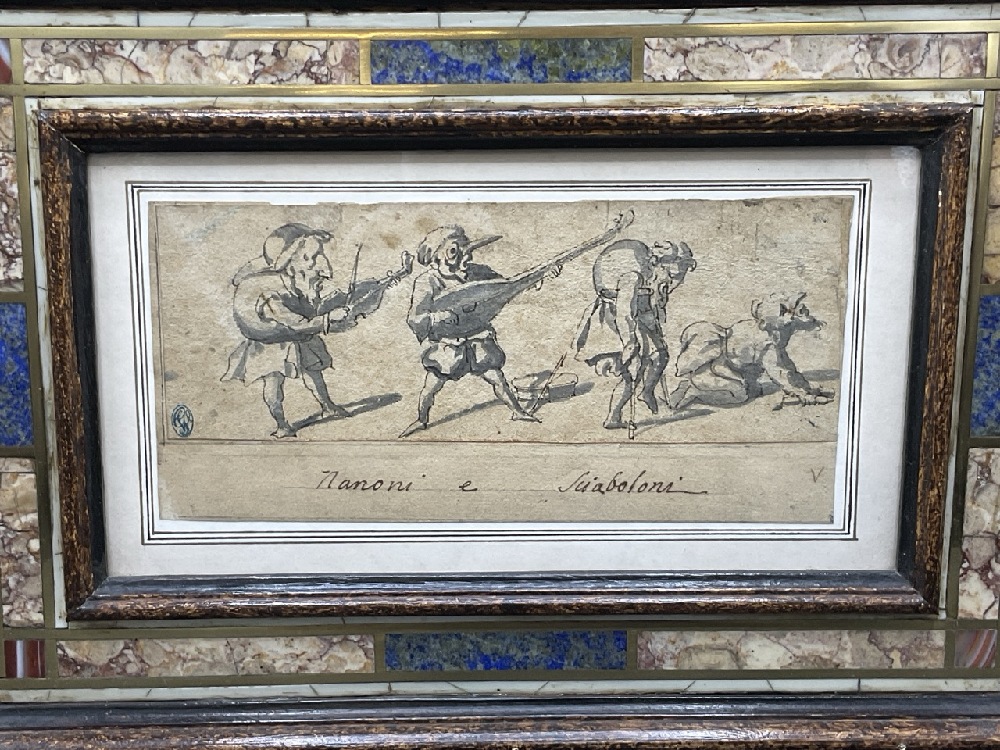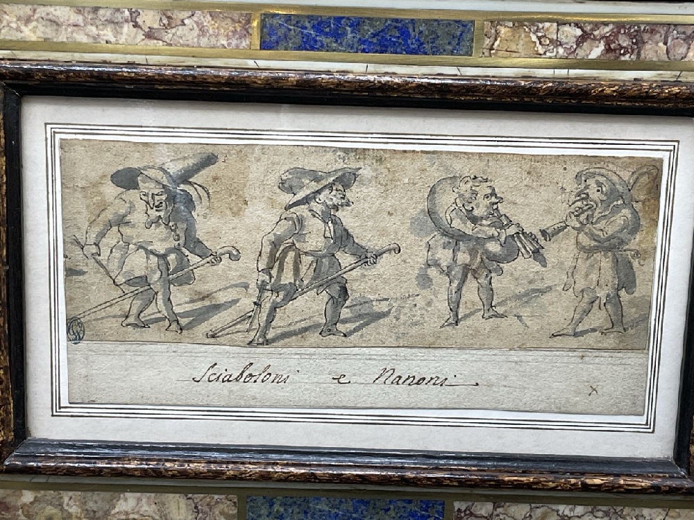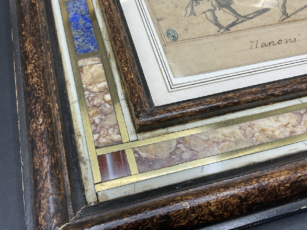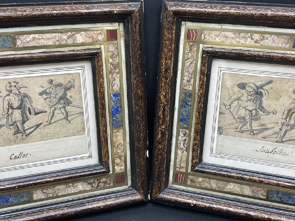 Three (3) Drawings. Circle of Jacques Callot (French, 1592-1635) bearing markings from Collection of Giuseppe Vallardi (Milan,1784-1863) . Housed in ornate Italian framed with lapis, agate and stone inlays.