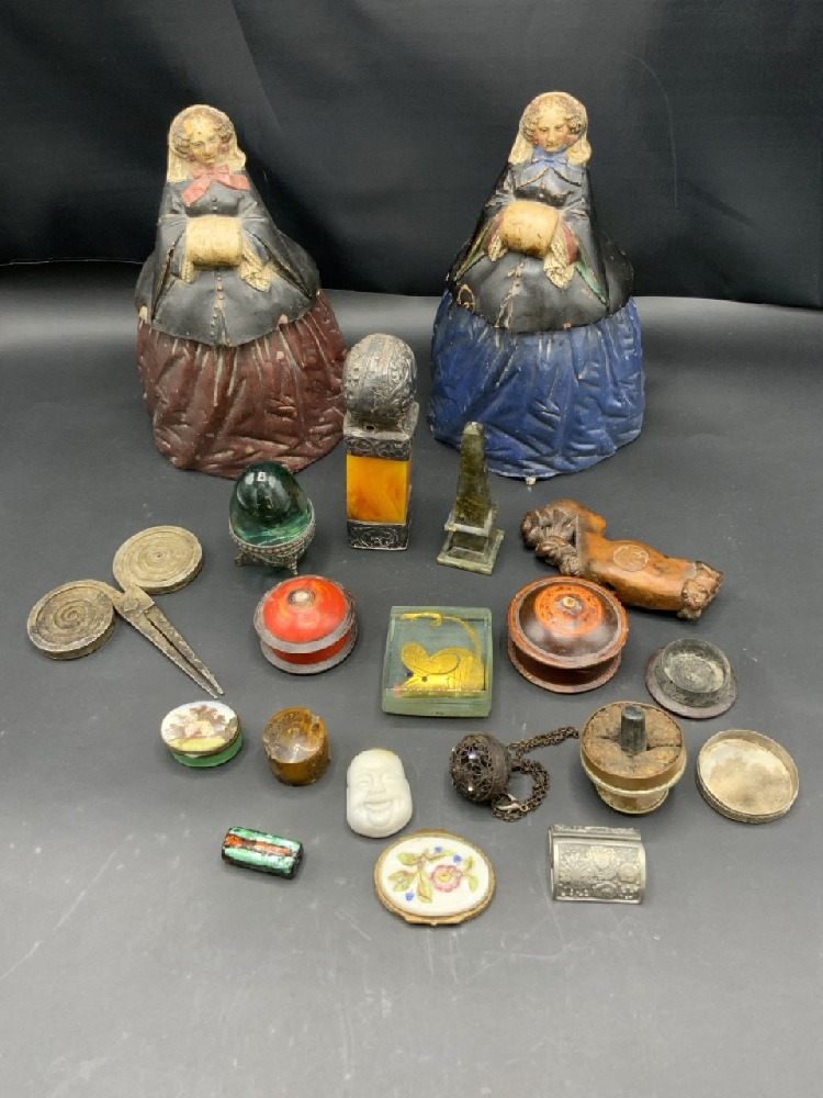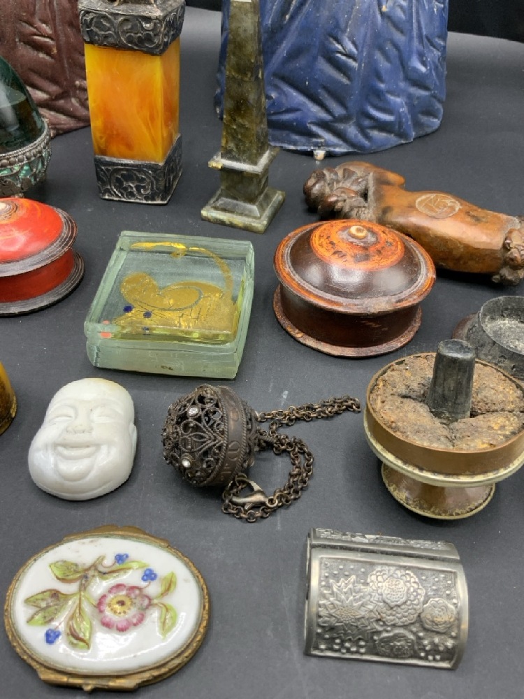 Twenty (20) Piece Small Curious Estate Found Objects. Tobacco jars, boxes, trinkets etc.