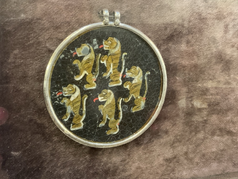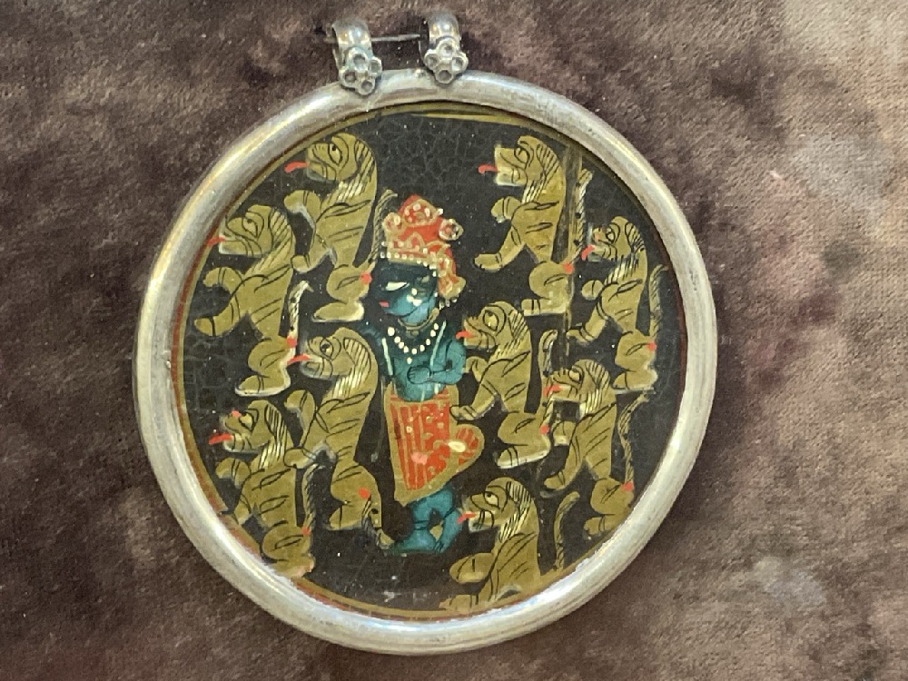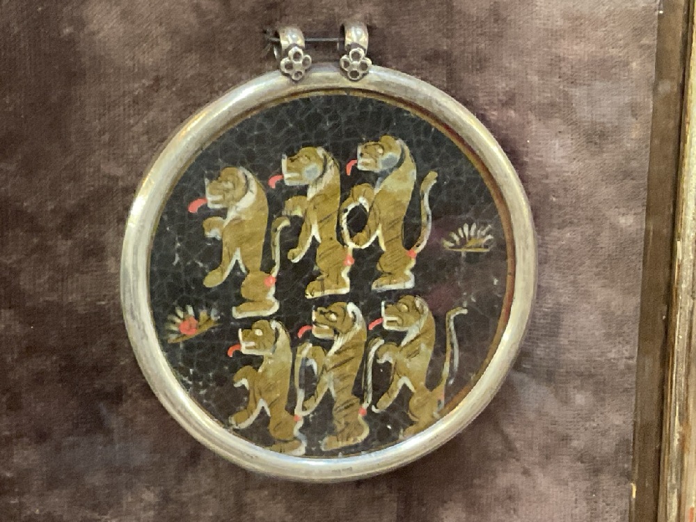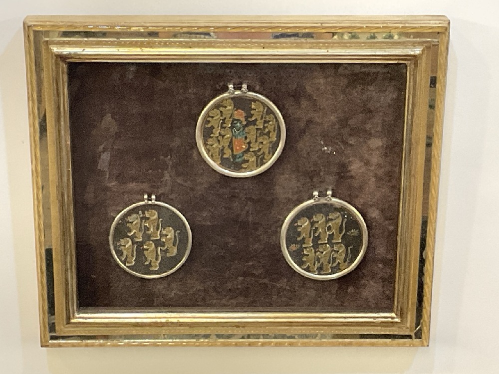 Antique Ganjifa Hindu Playing Cards, Hand Painted Glass. Eight (8) Pieces total. The cards are framed in silver and housed in a Venetian frame by Cornici