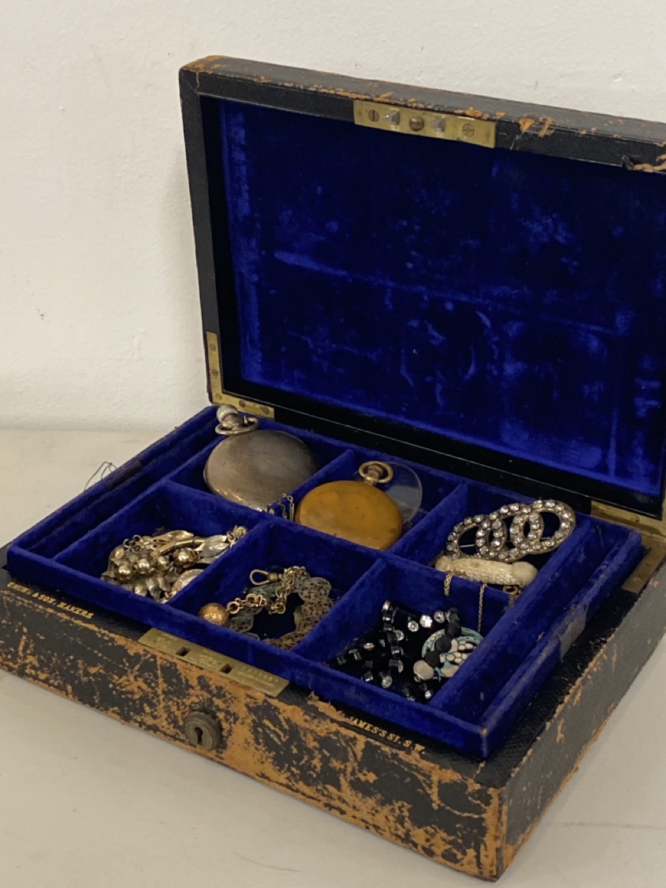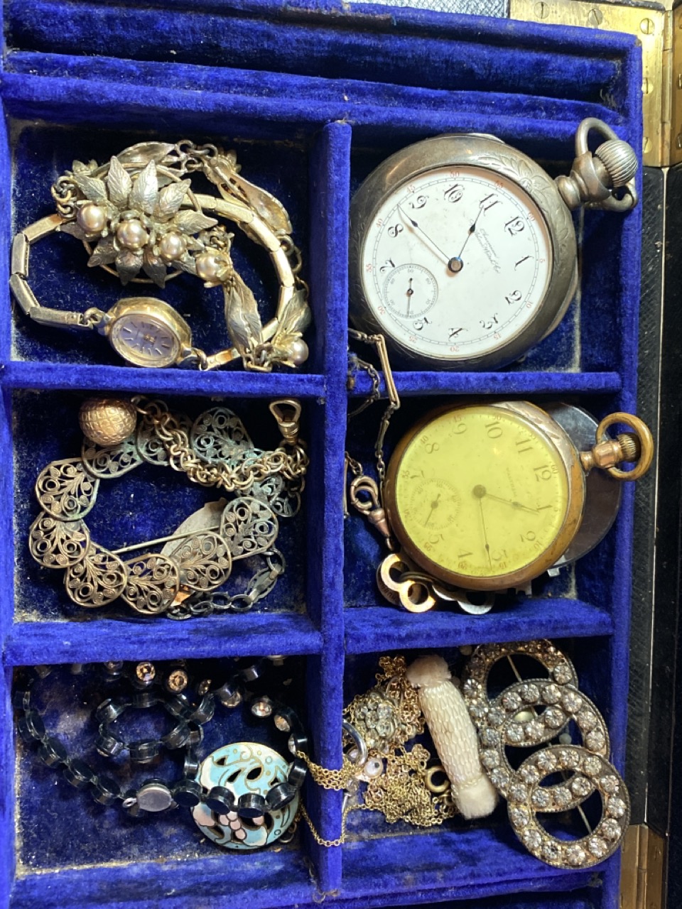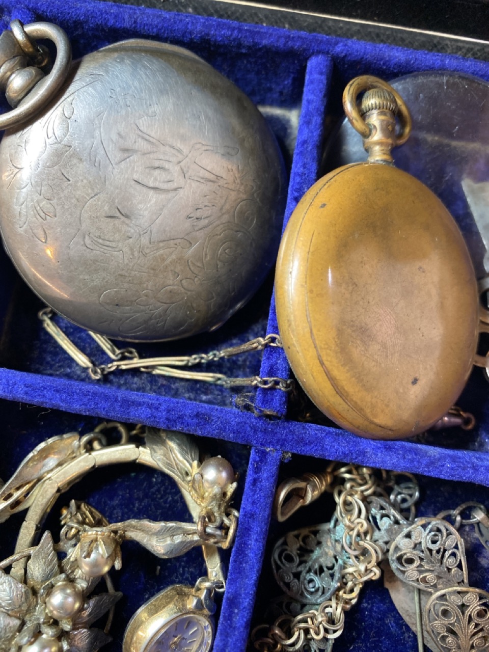 Victorian Jewelry Box w/ Contents, various jewelry Waltham pockets watches or parts etc.