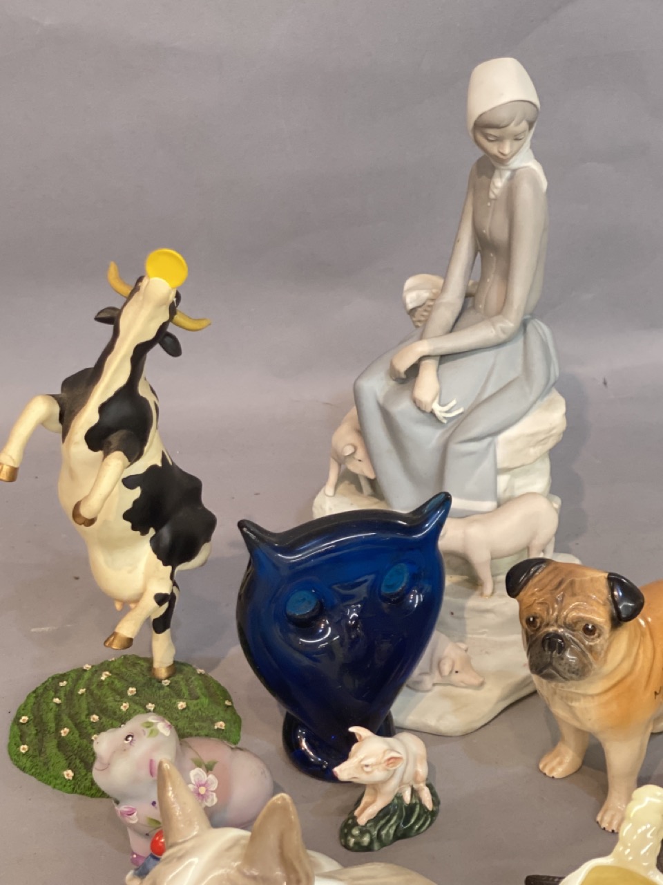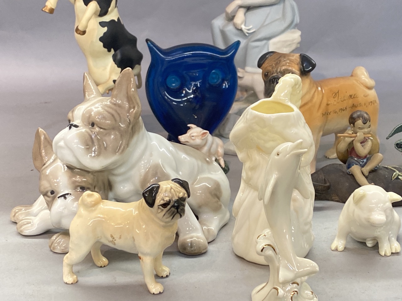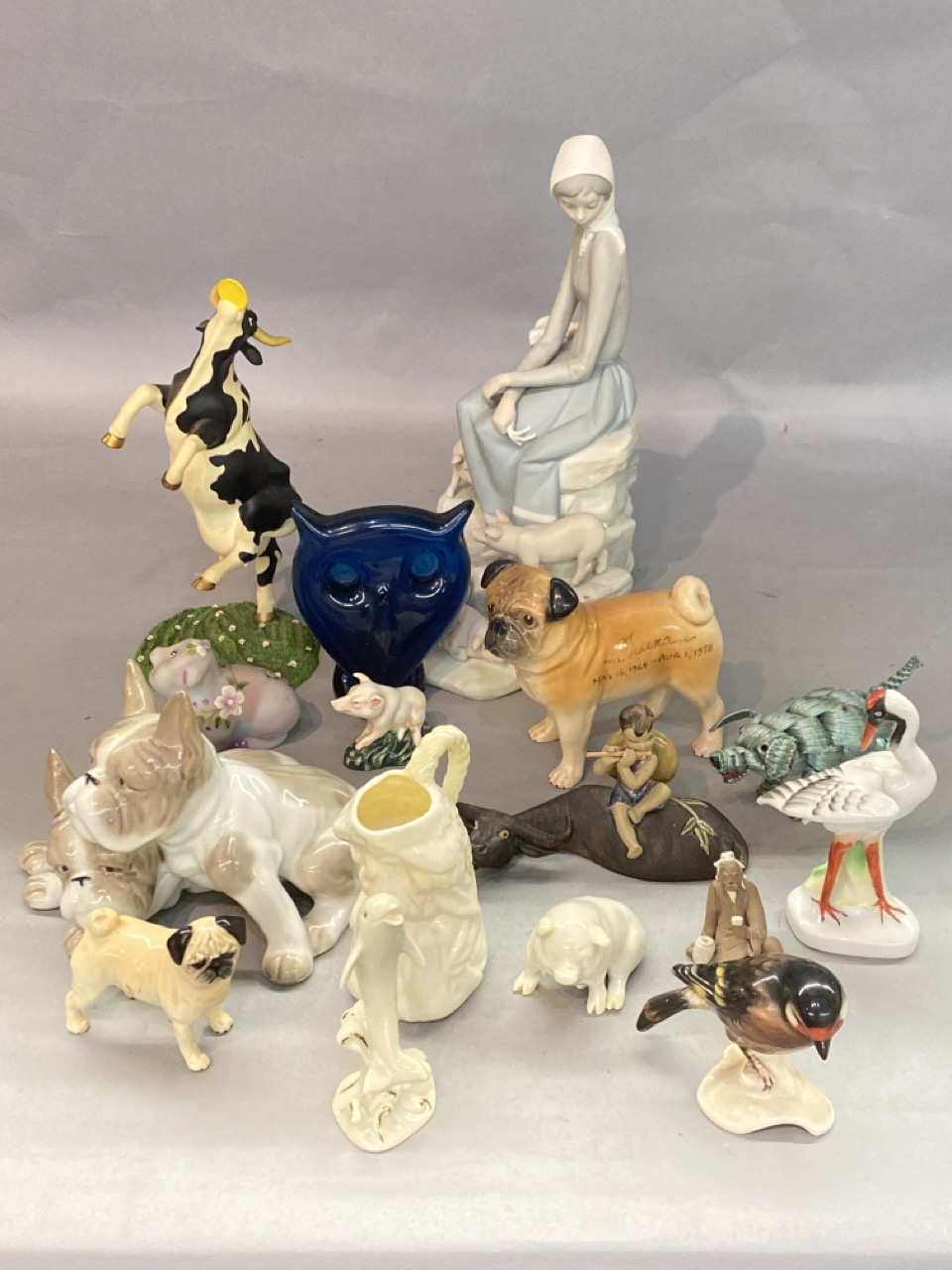 Compiled grouping of collectible figurines including Belleek, Beswick, Lladro etc