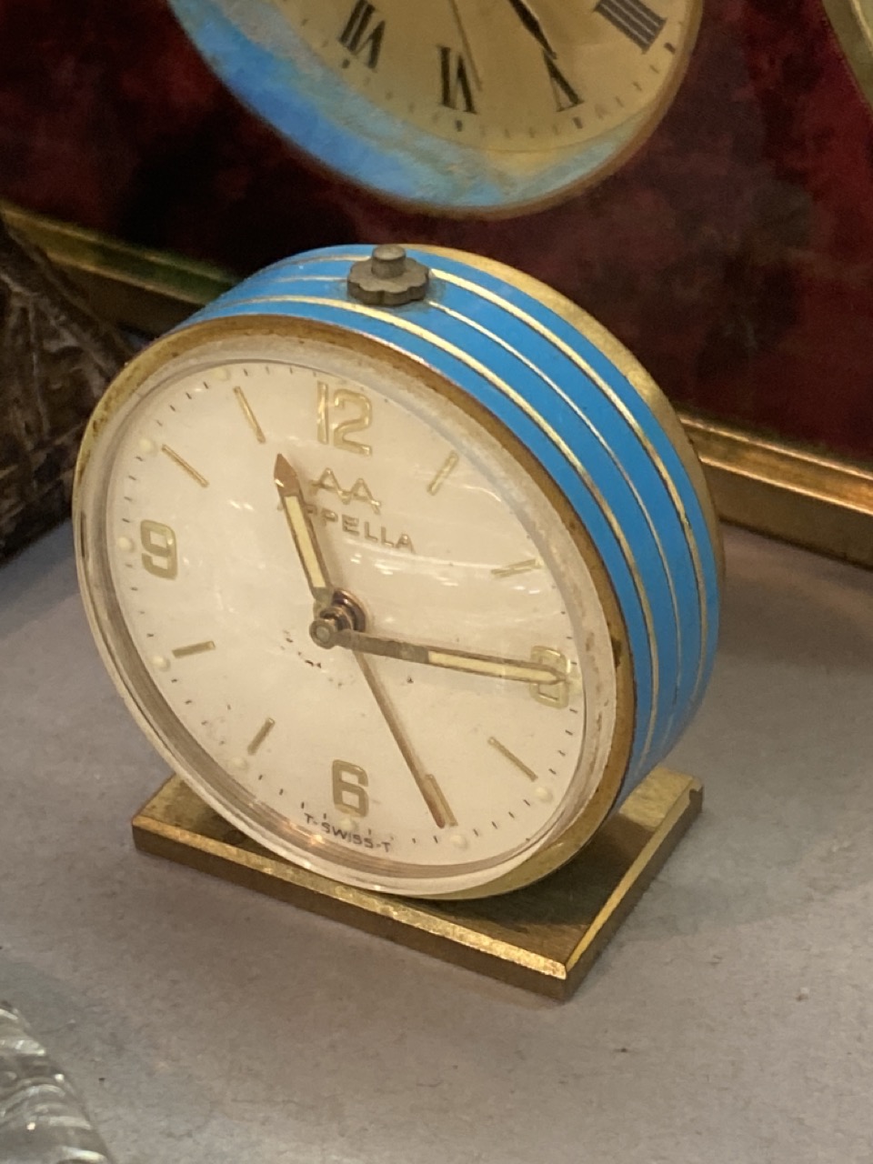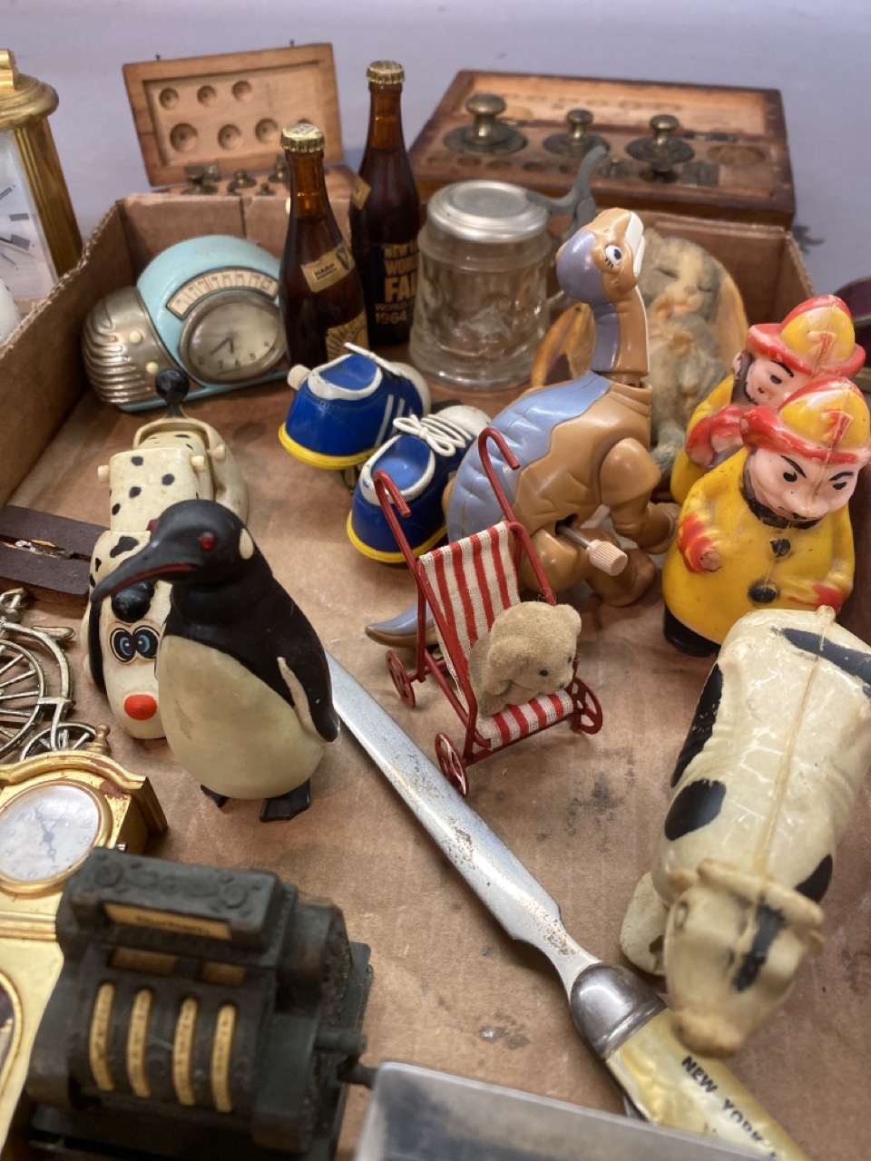 A compiled grouping of miniature estate curiosities, including small toys, alarm clock, pin cushion etc.