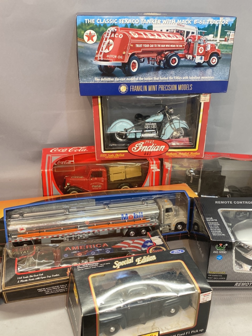 Collectible Die Cast Models Lot. Texaco Tanker, Coca Cola, Indian Motorcycle etc.