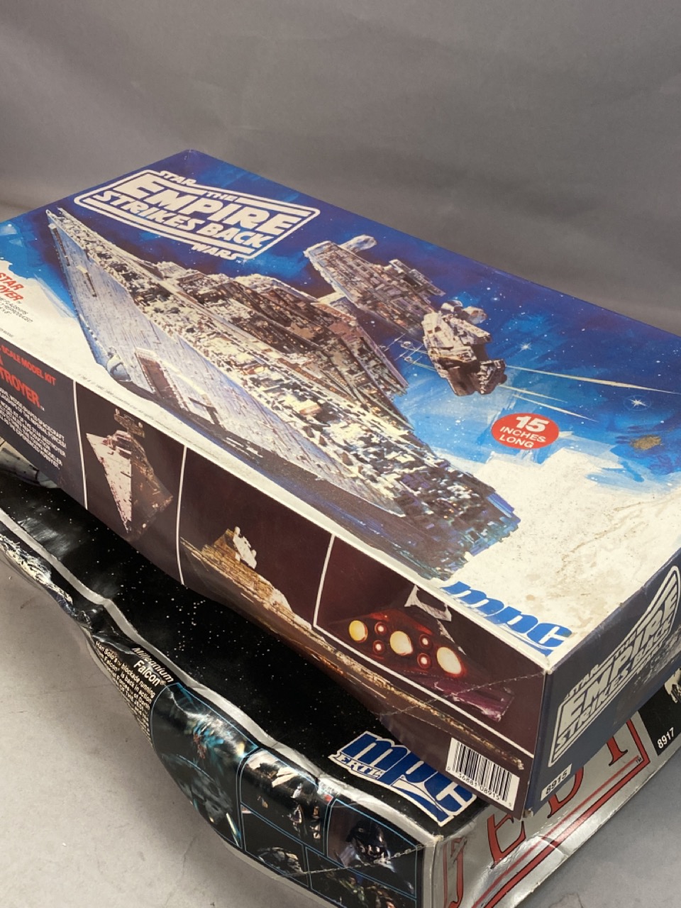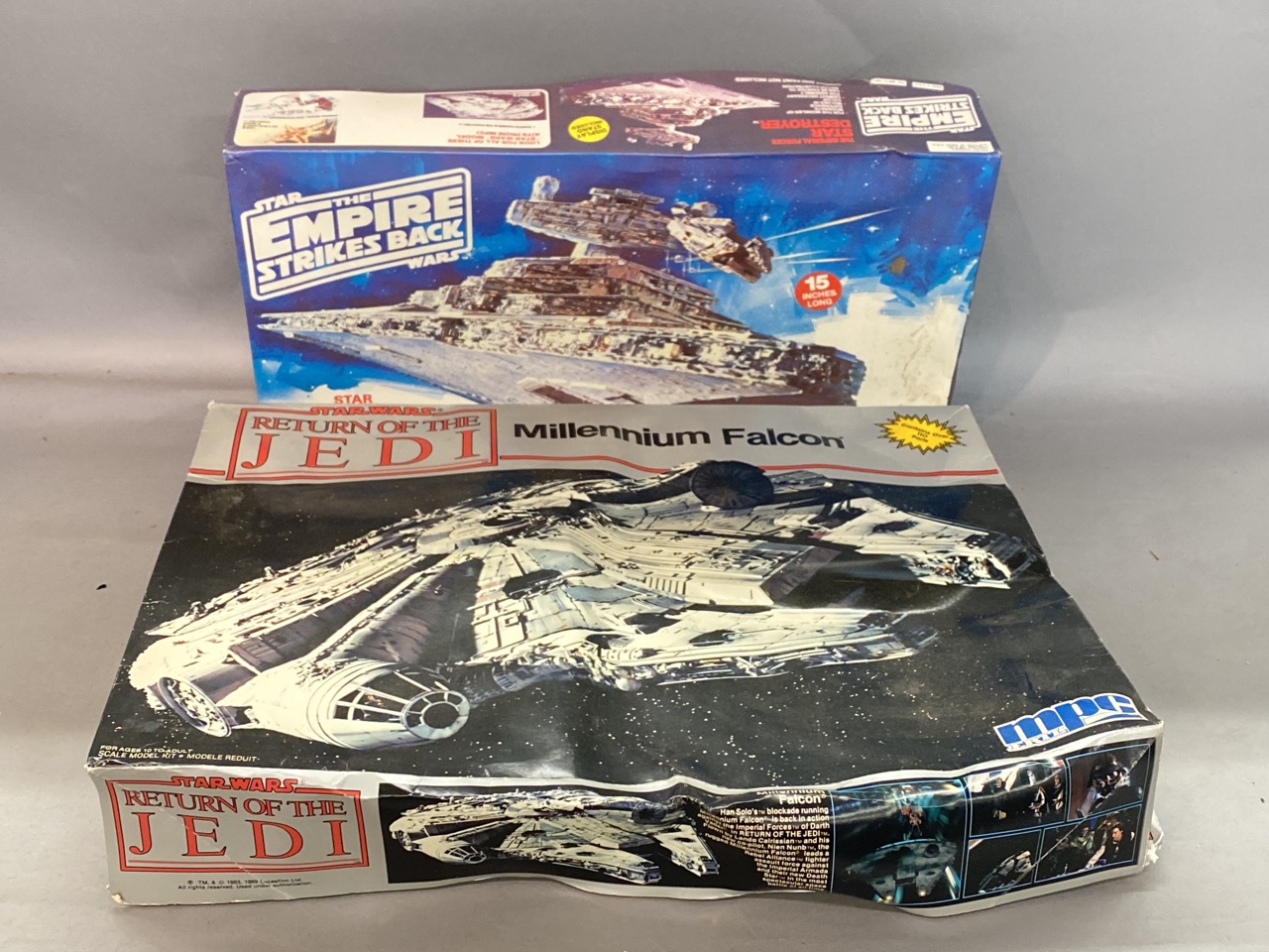 MPC Star Wars Return of Jedi and Empire Strikes Back models. One boxed crushed. Unused paperwork and models appear complete.