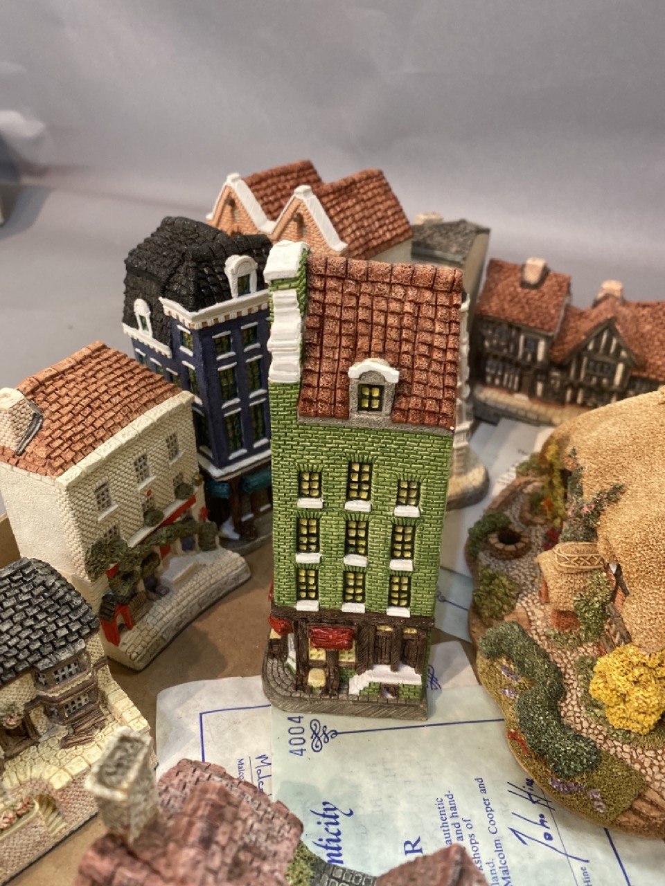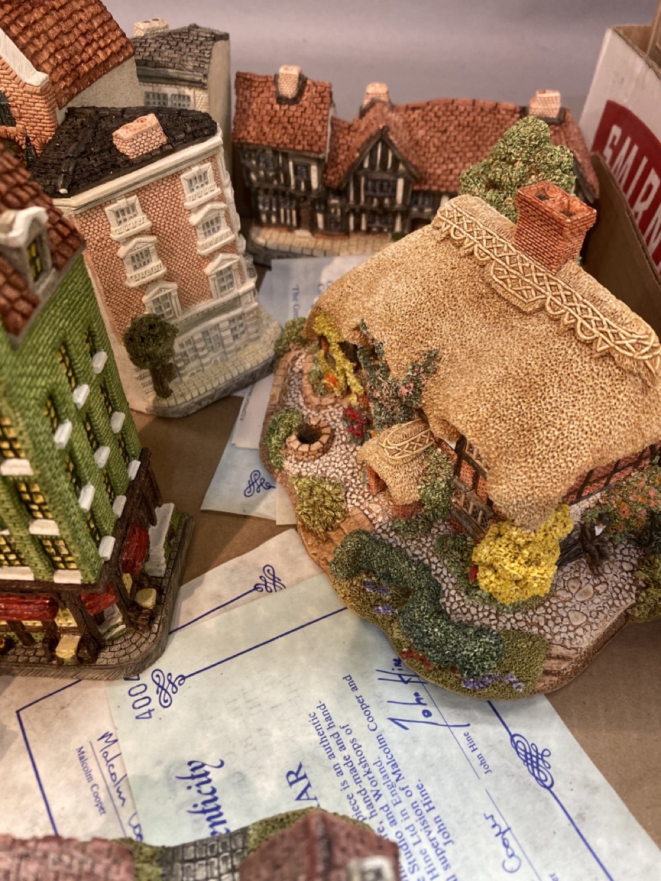 Decorative collectibles lot including John Hine, Lilliput Lane etc, Timothy Richards English bookends.
