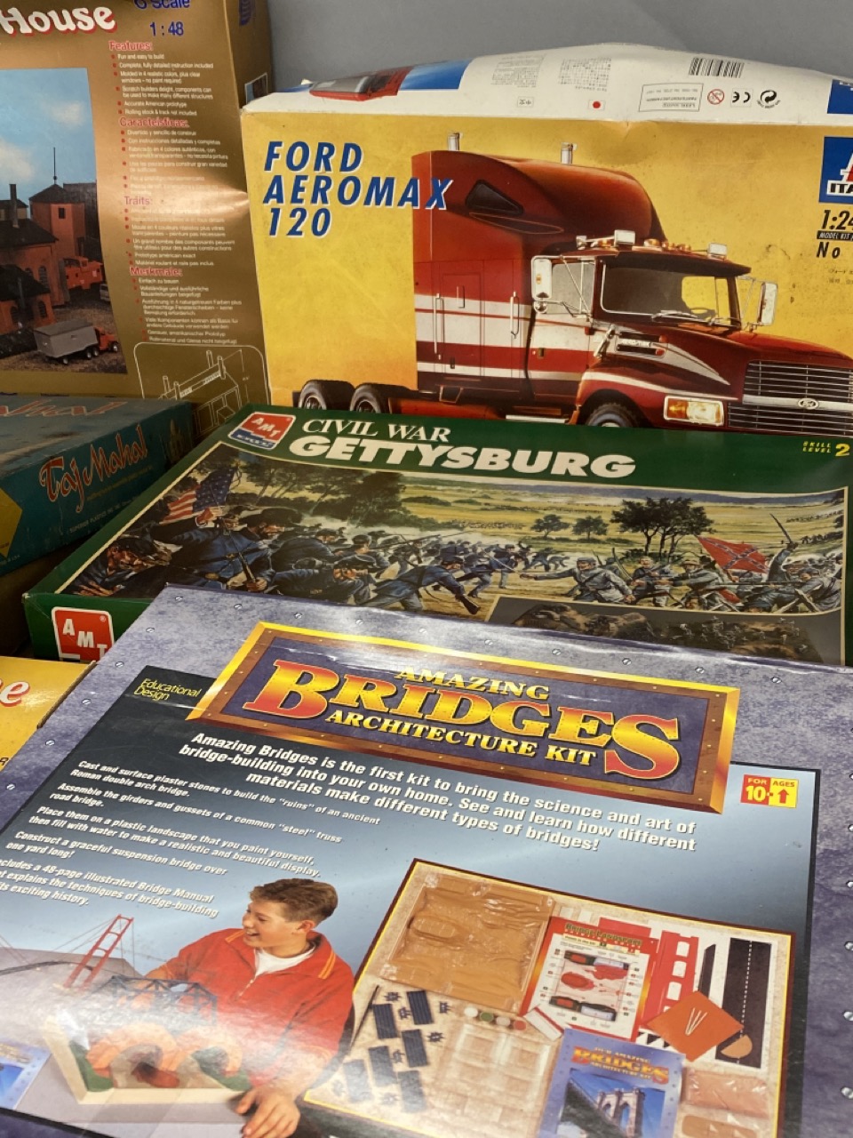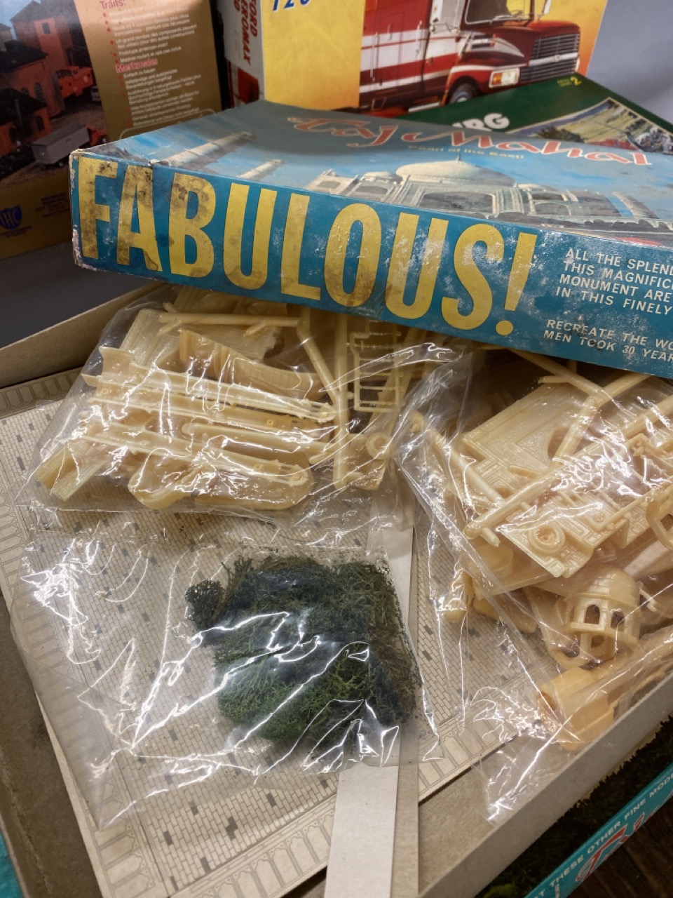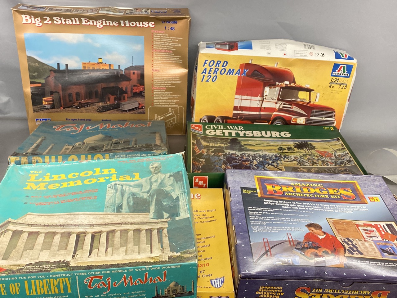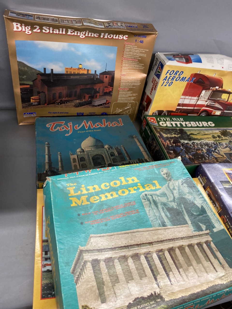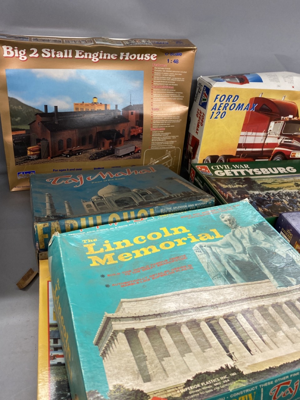 Seven (7) Buildable Models including HO Scale Taj Mahal (Box damaged and deteriorating)Ford Aeromax Italeri, AMT Civil War Gettysburg, Lincoln Memorial etc. IHC