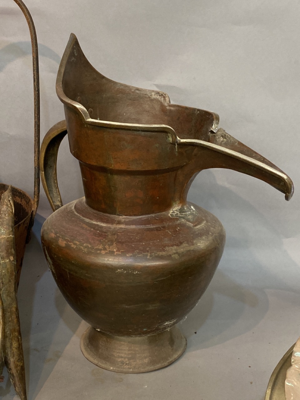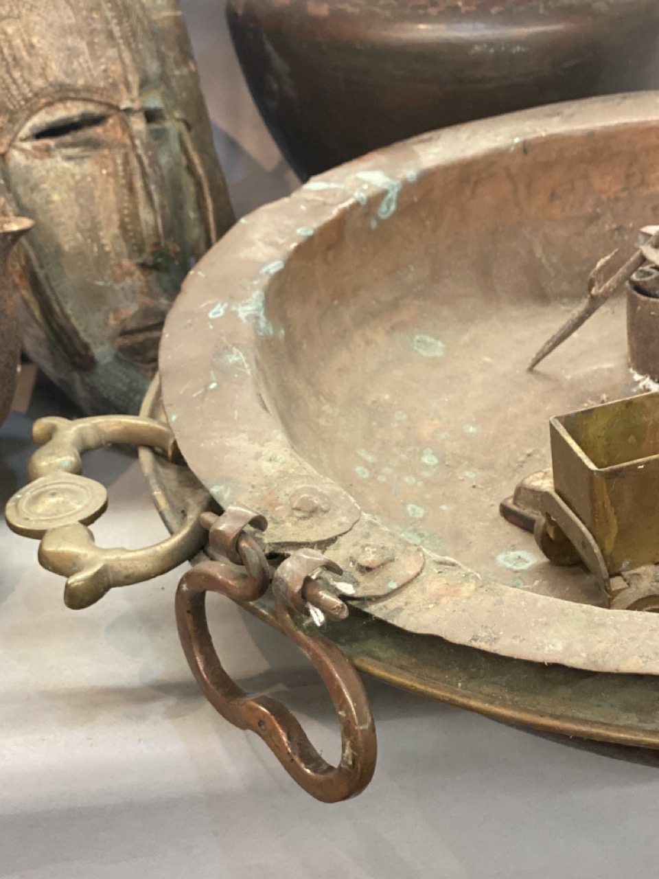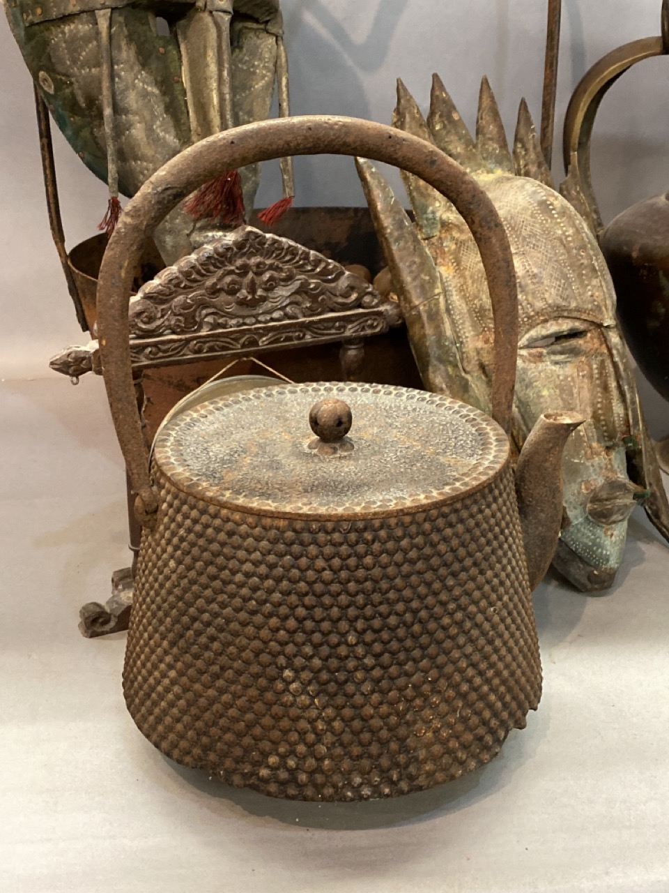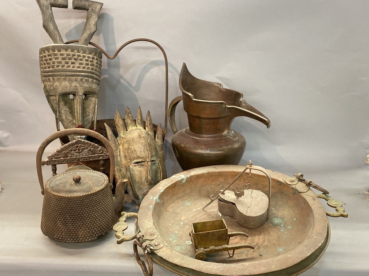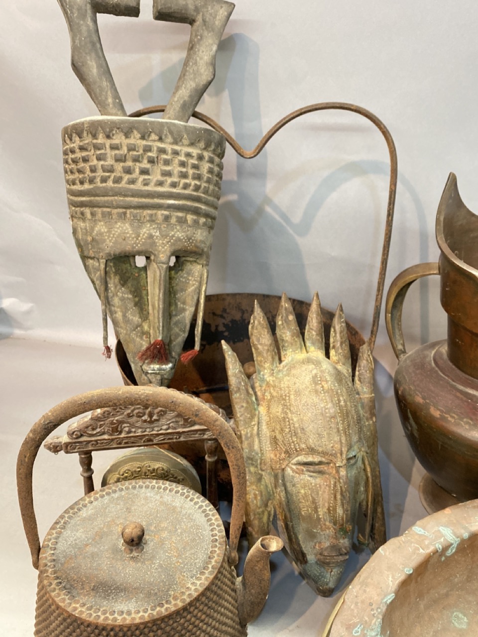 Ten (10) Piece Decorative metalwares and tribal masks. Large copper basins, smelting pitcher, Japanese kettle etc.