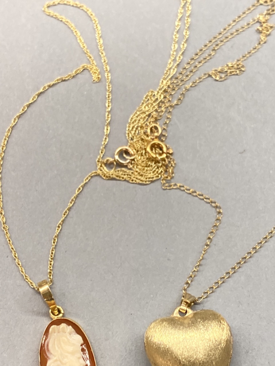 Two (2) 14k gold necklaces. One cameo and brushed gold heart pendant with chains.