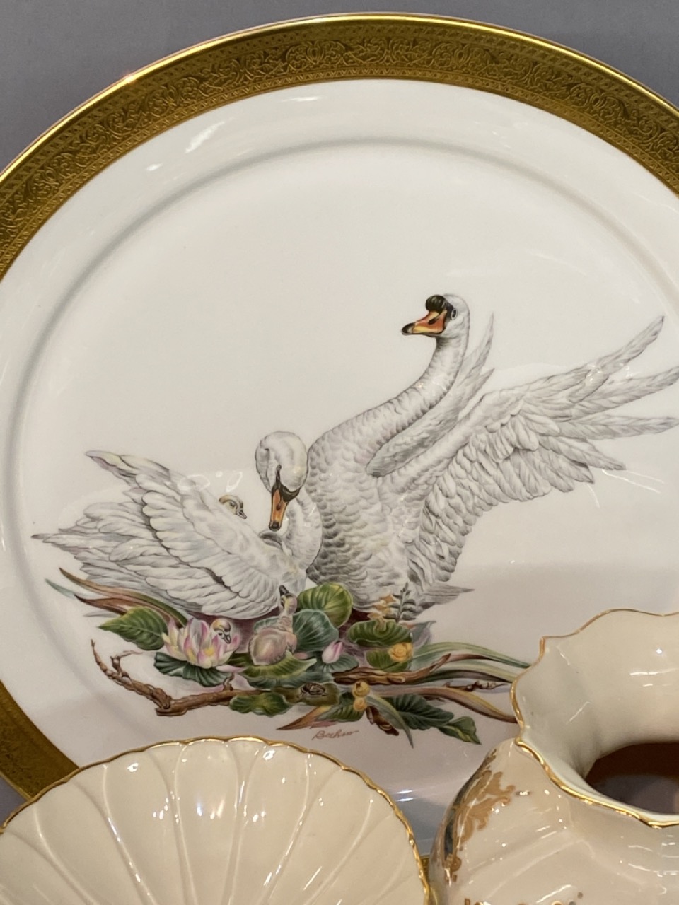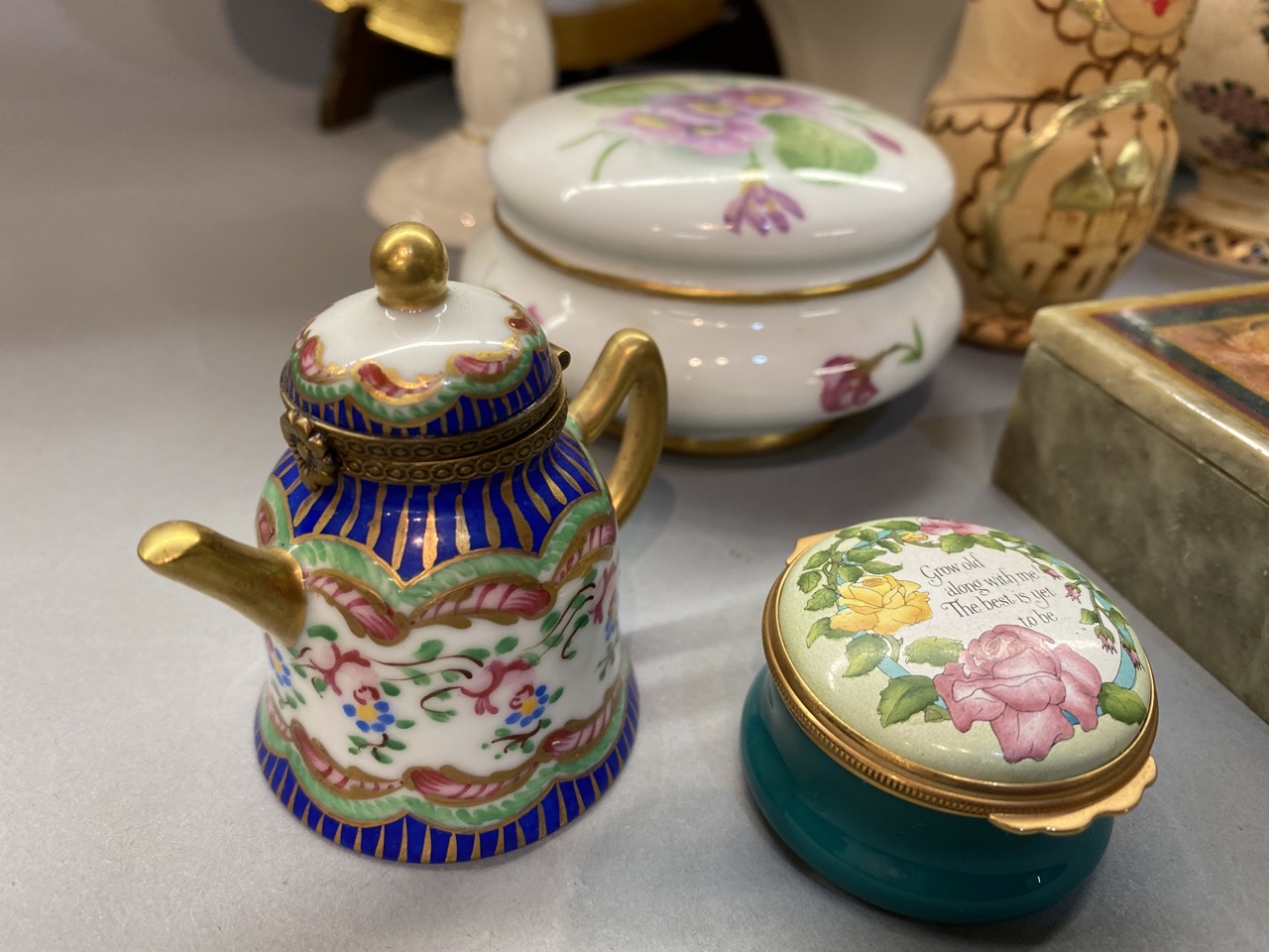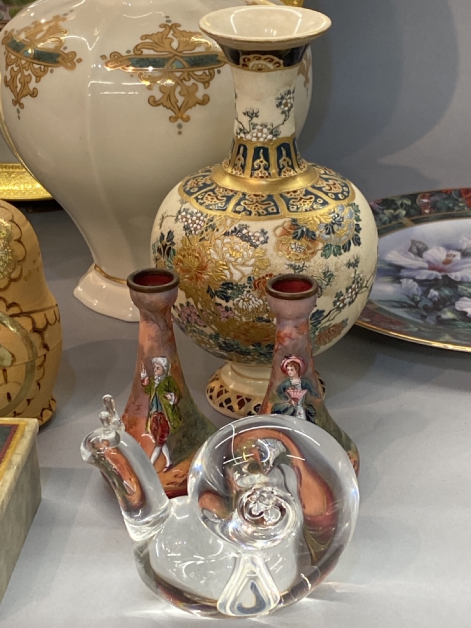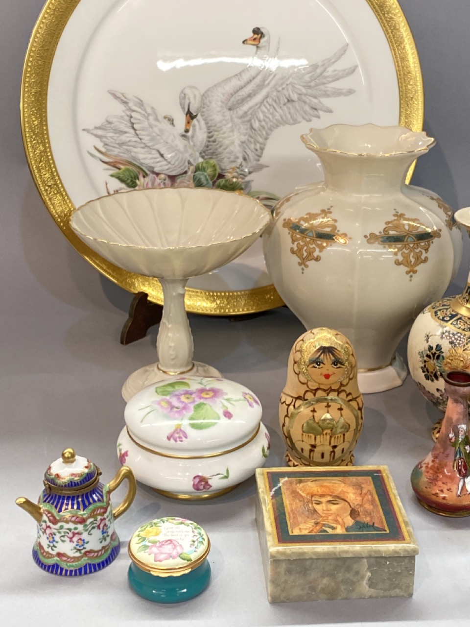 Collectibles porcelain and miniatures lot including Halycon days, Lenox, Steuben snail,Satsuma vase, Limoges etc.