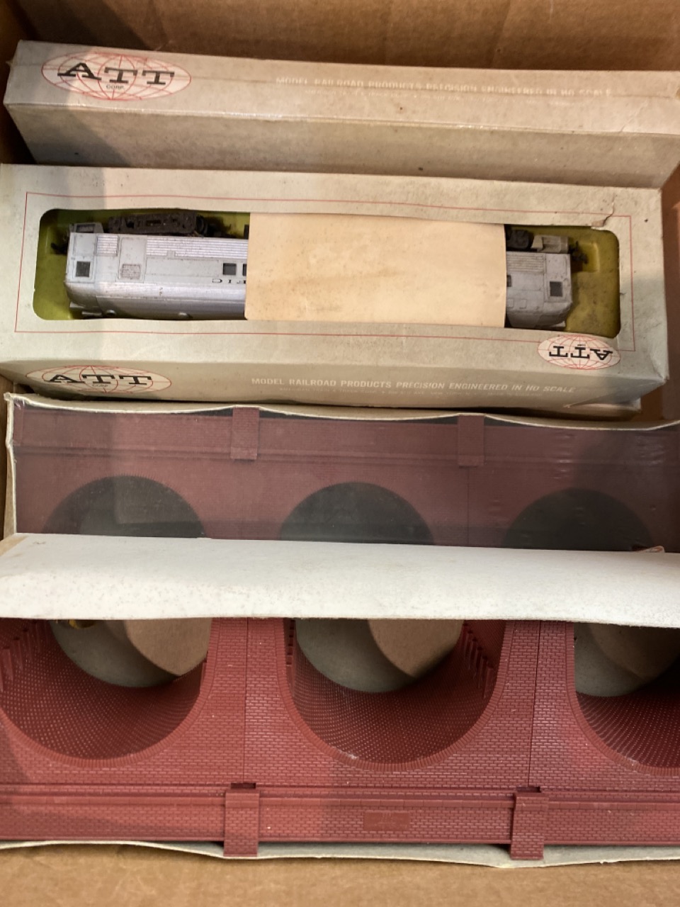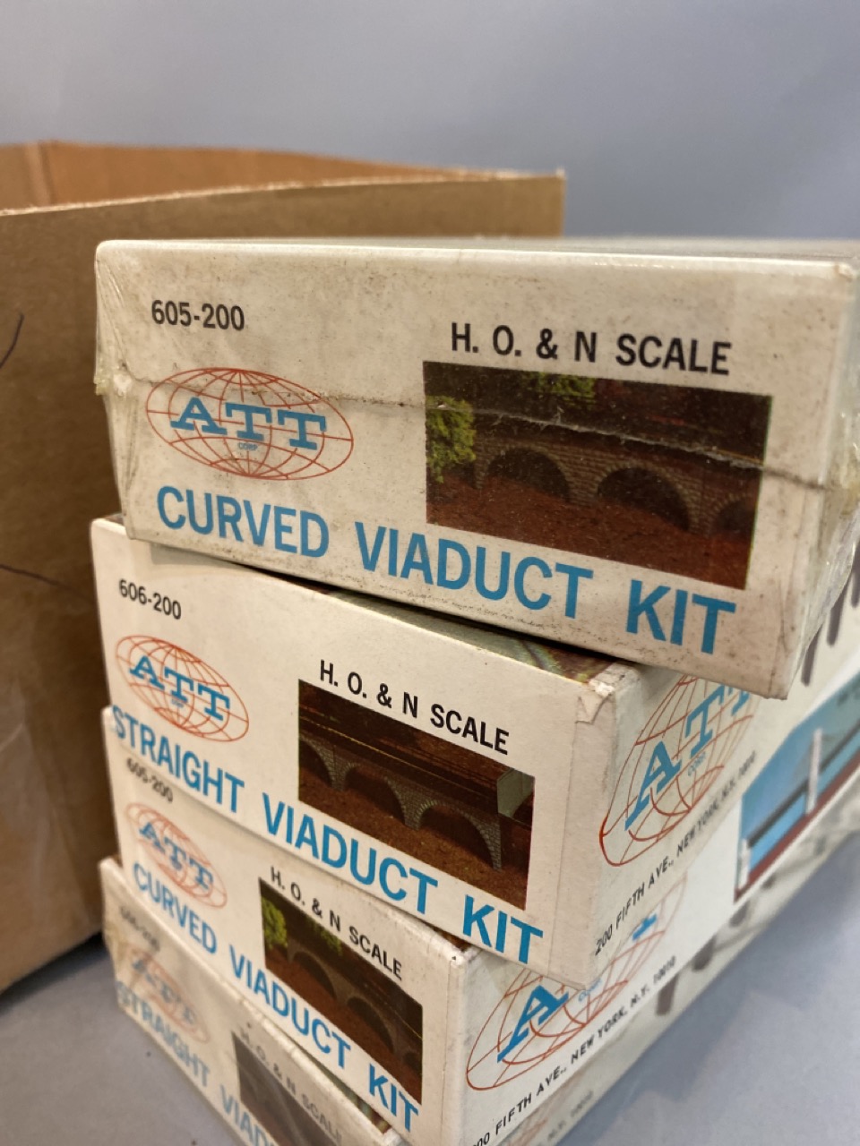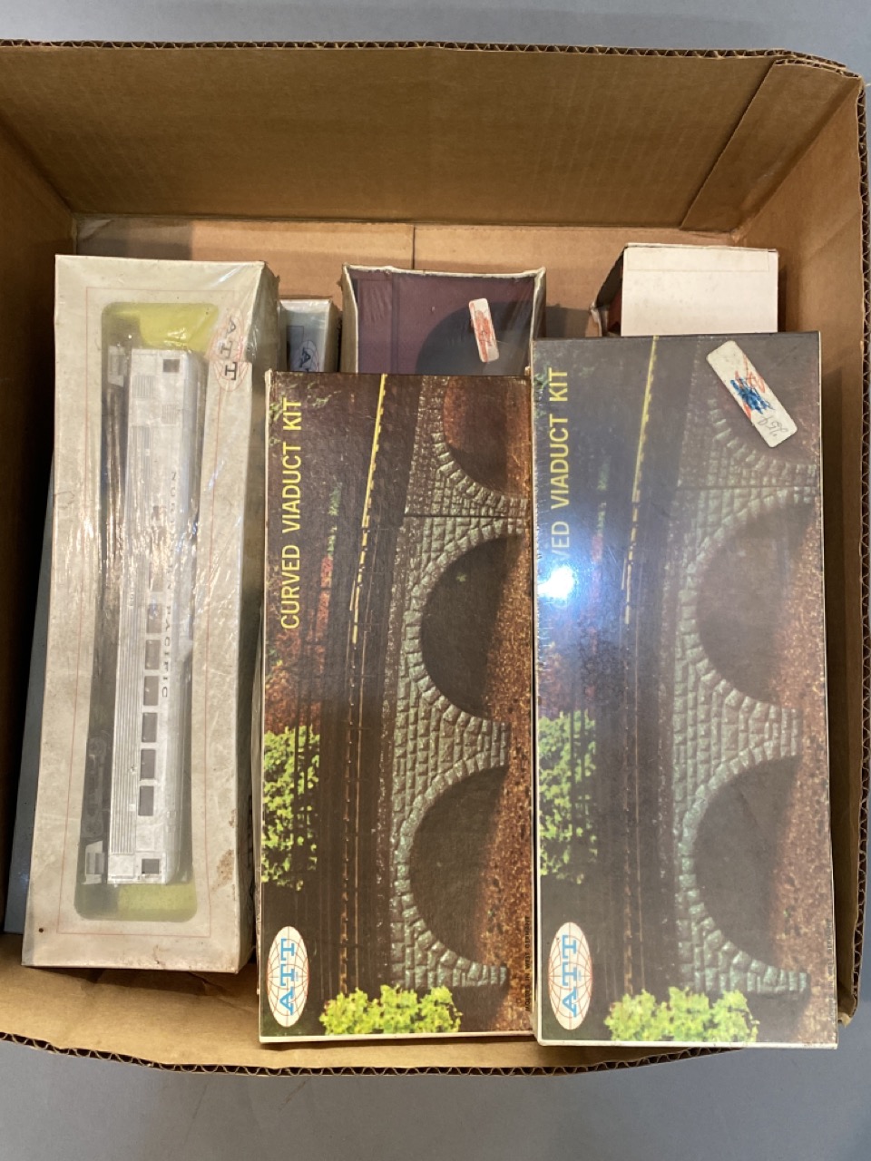 HO & N Scale Bridge Viaduct Kits and train cars.