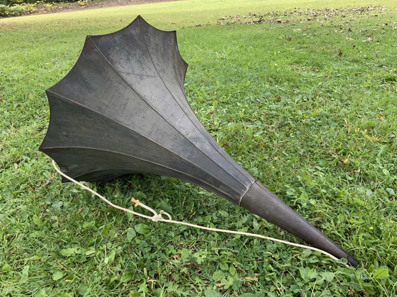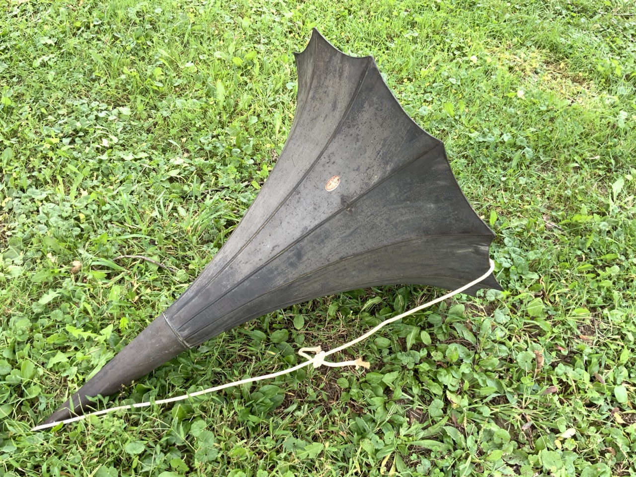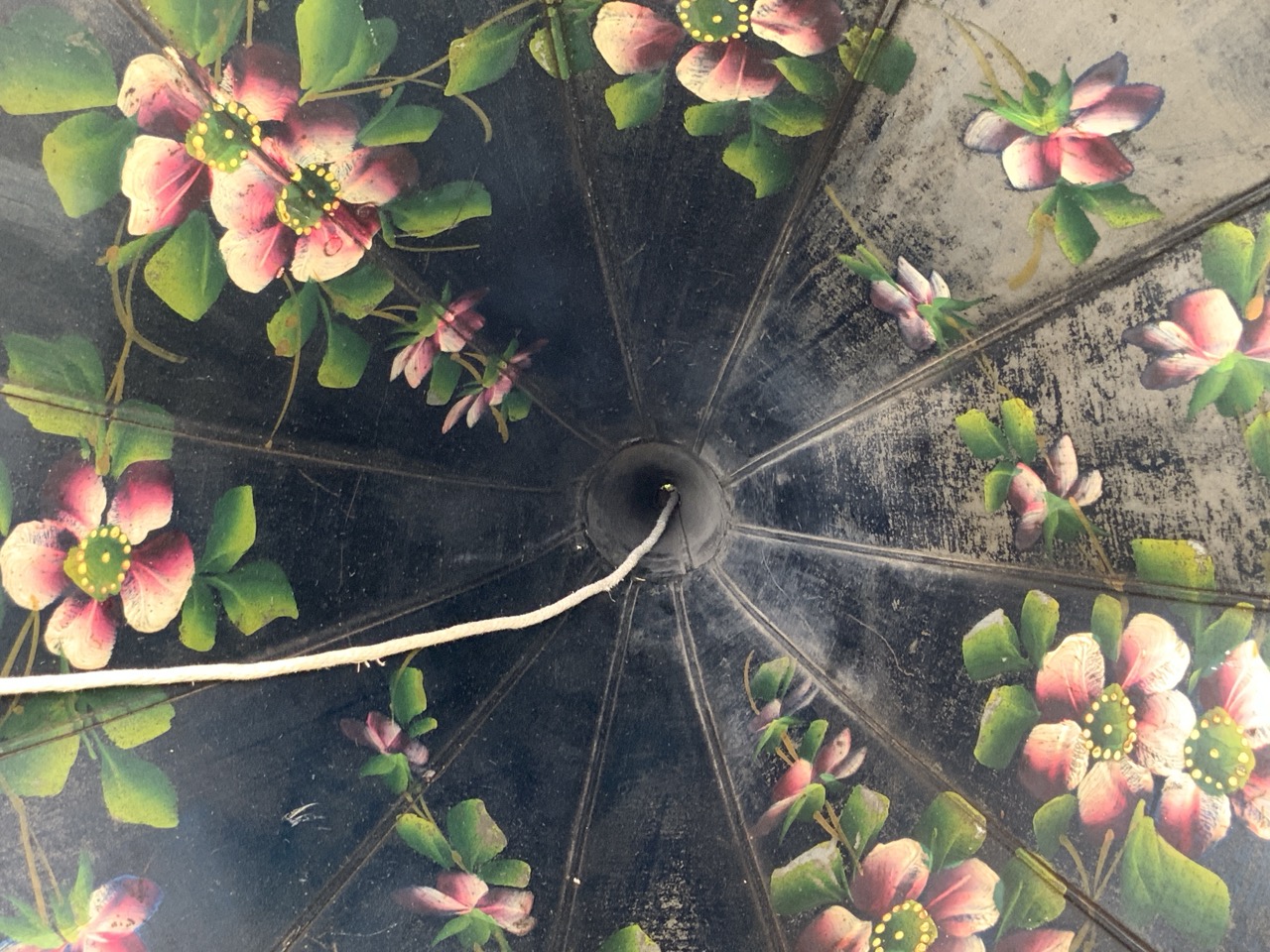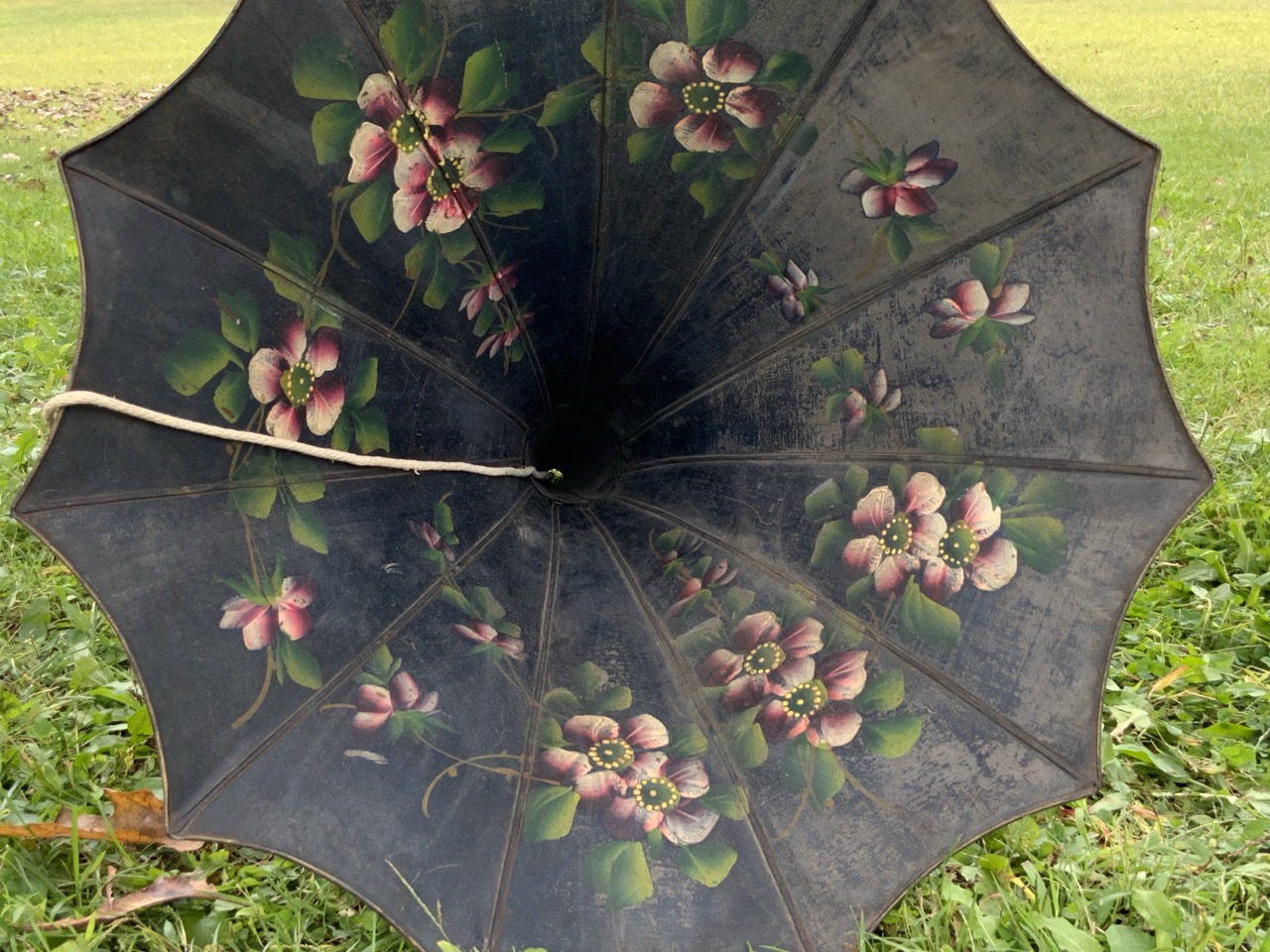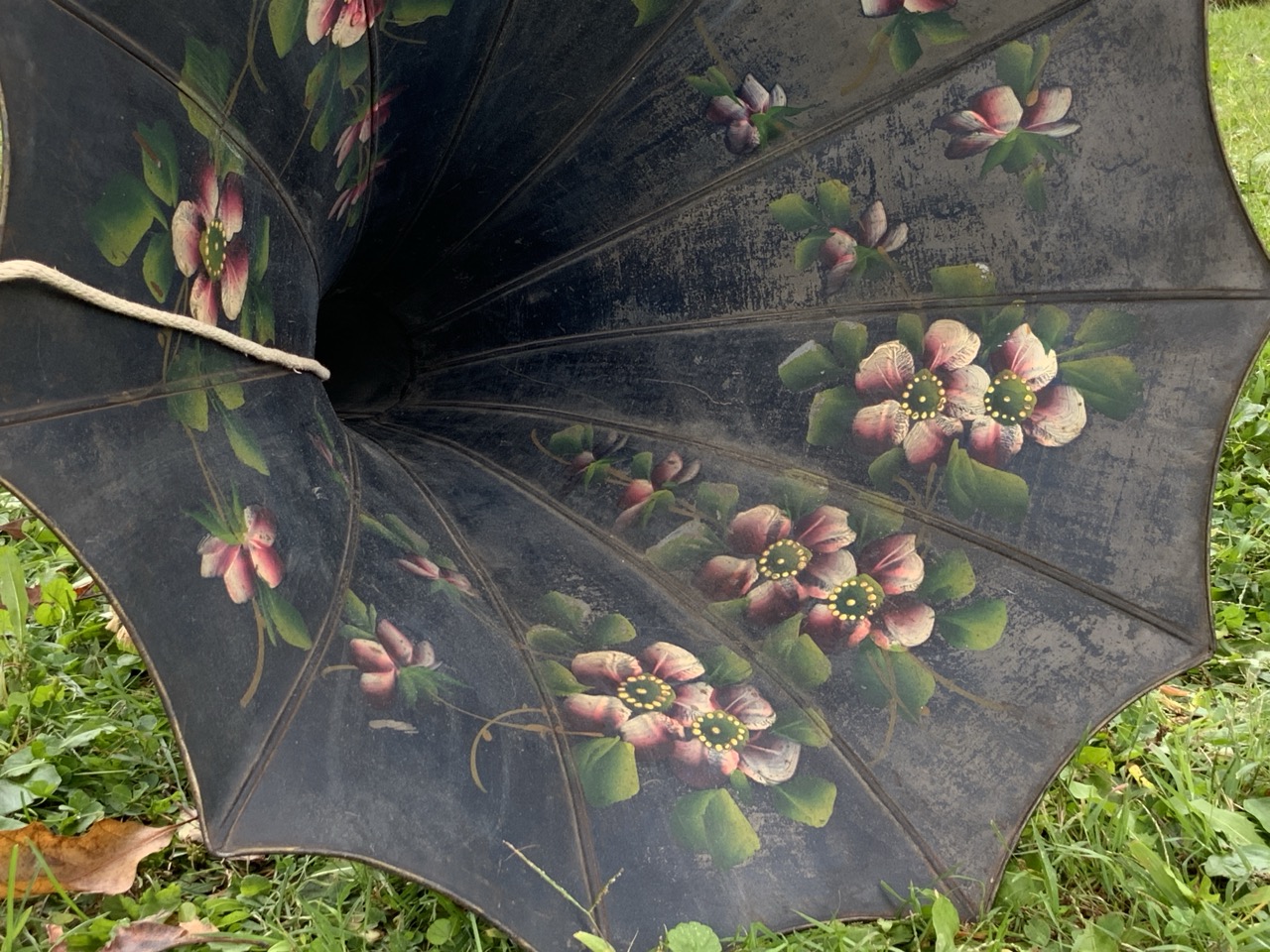 An antique phonograph horn with hand painted flowers.