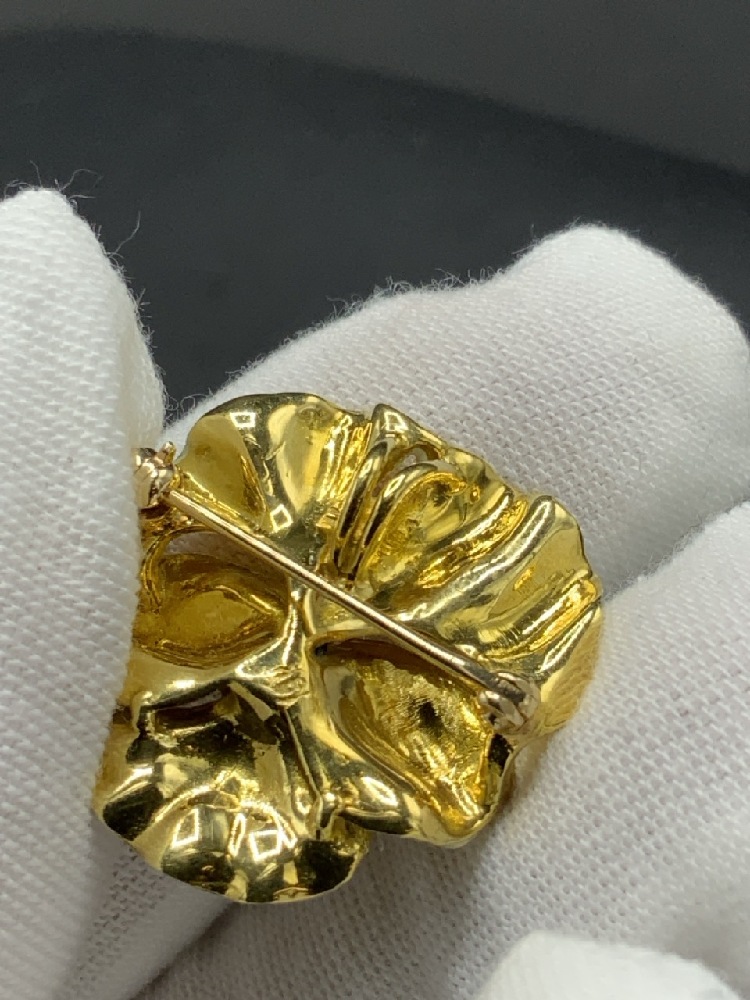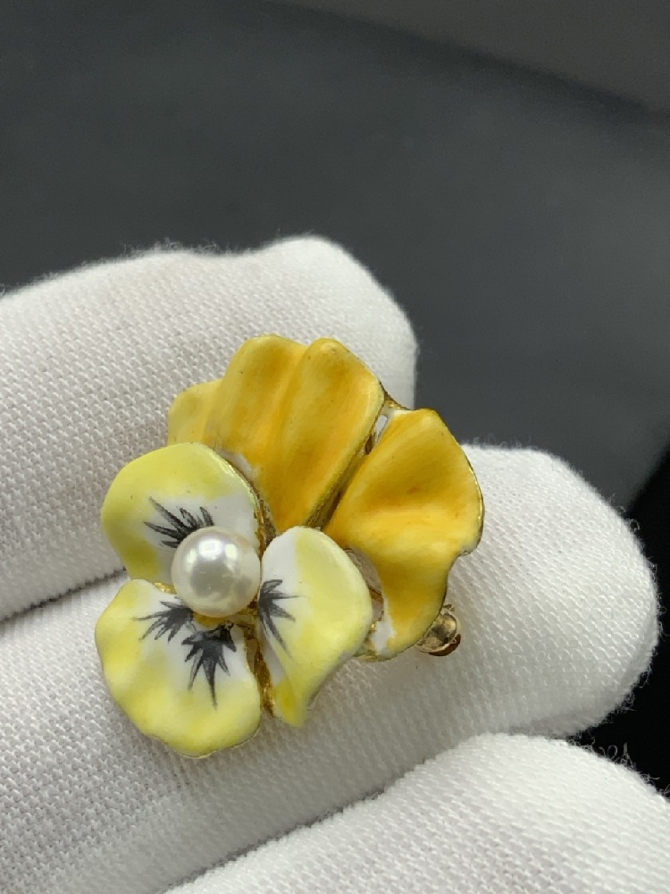 18K Gold Yellow Enamel Painted Pansies Pin w/ Pearl.