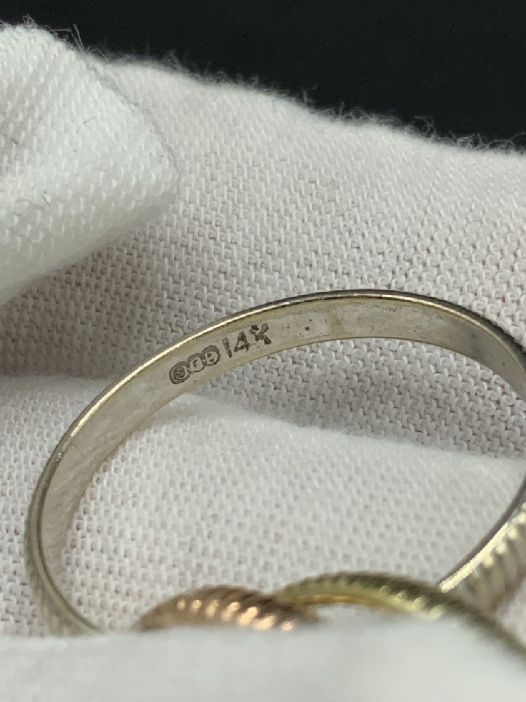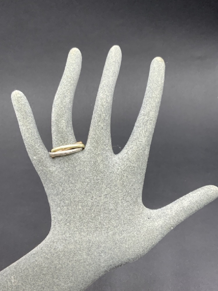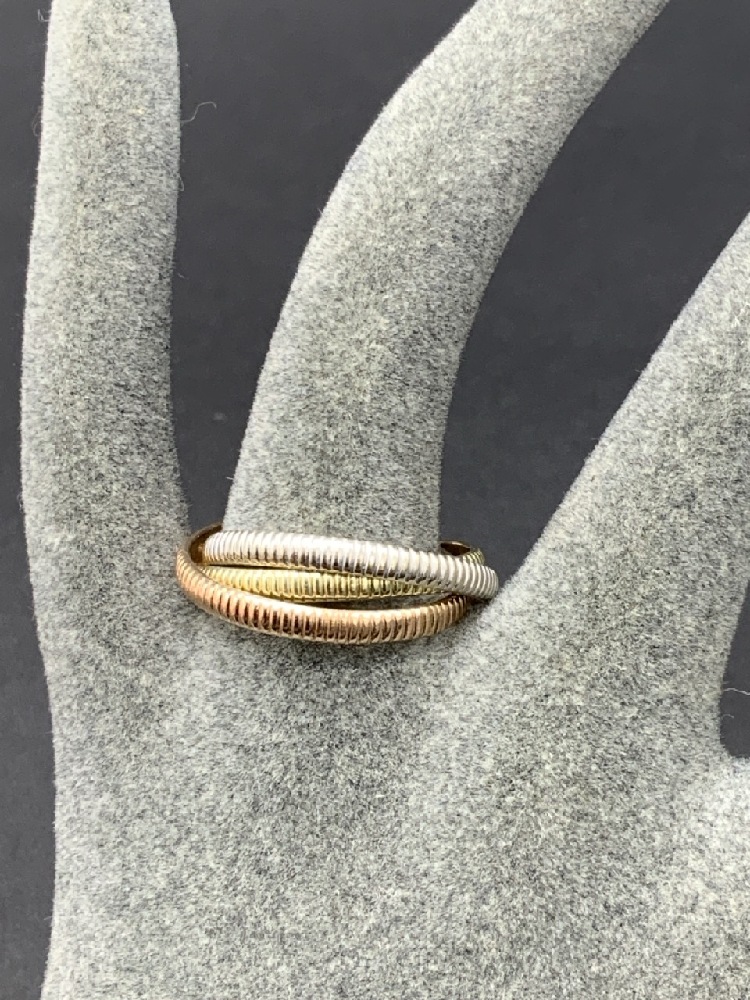 A 14K Tri-Gold with reeded edge Trinity Ring. (Yellow,White and Rose gold.
