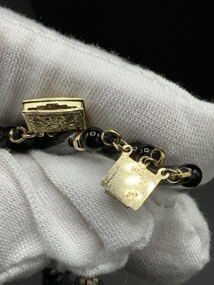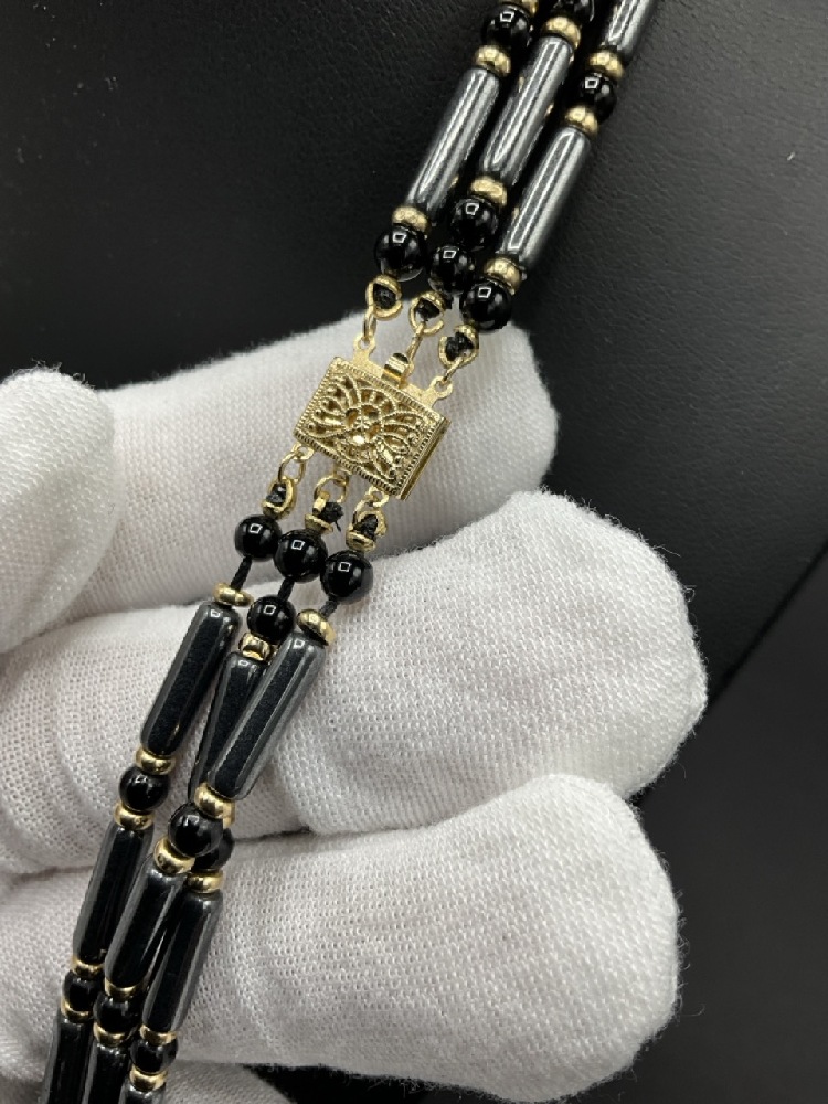 14K Gold Onyx and Hematite Three Strand Necklace.