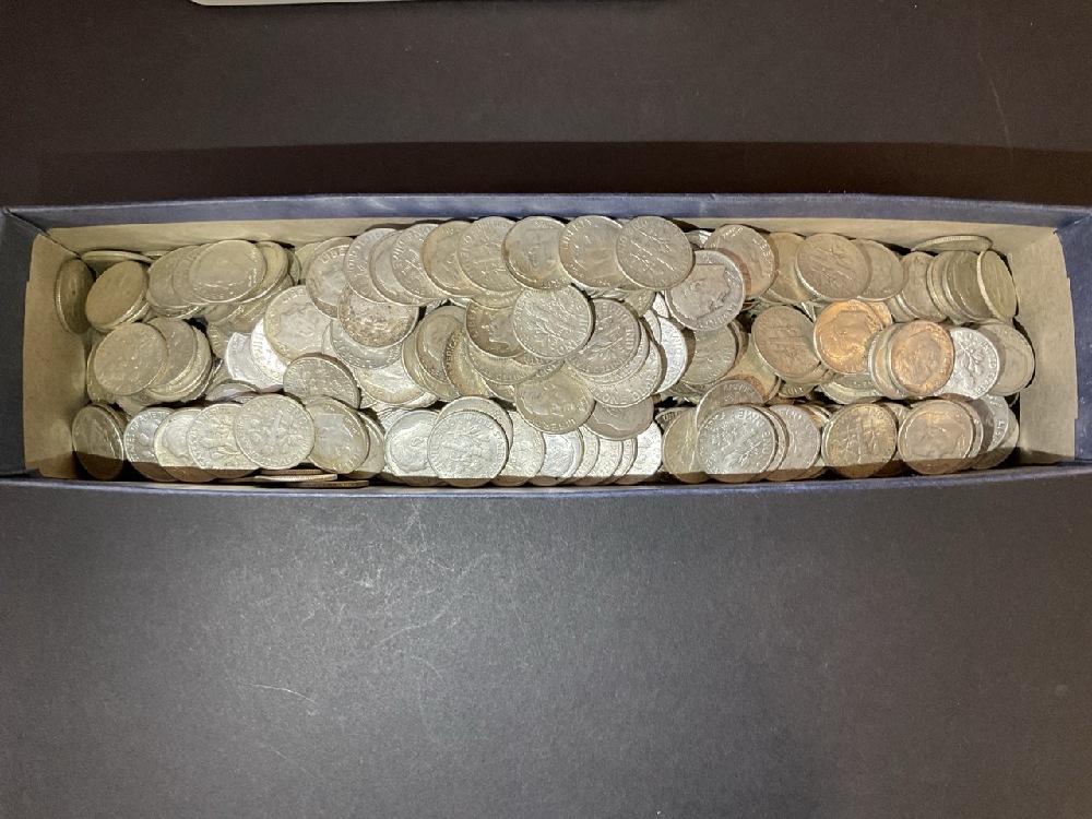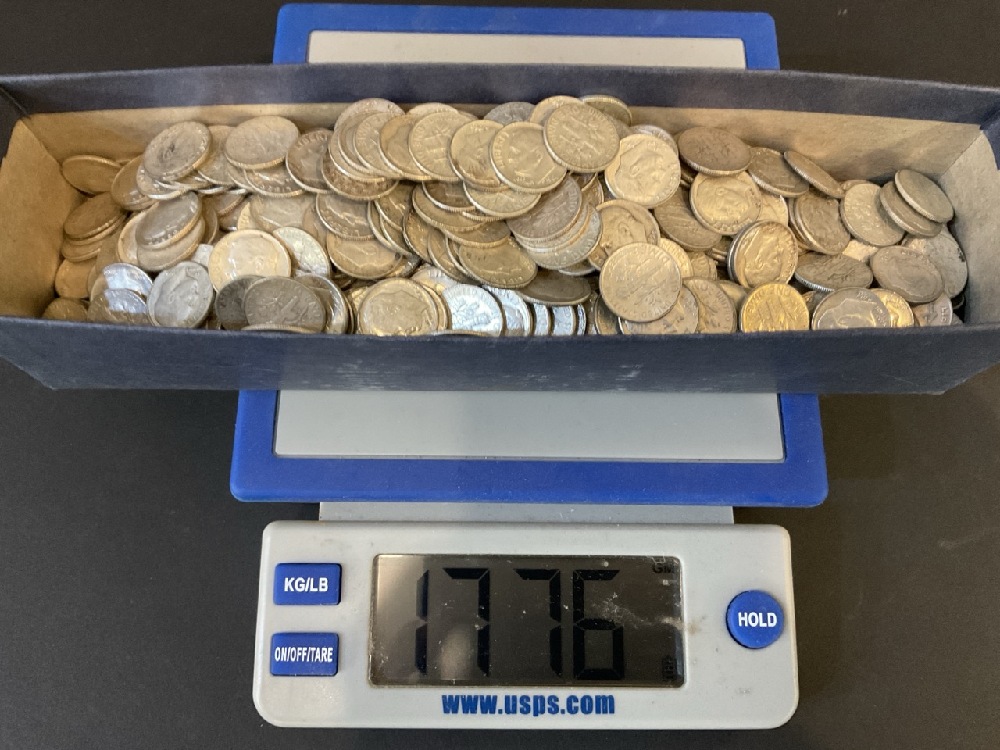 1,776 grams approximately 710 dimes @ 2.5 grams each. Box is not part of the weight