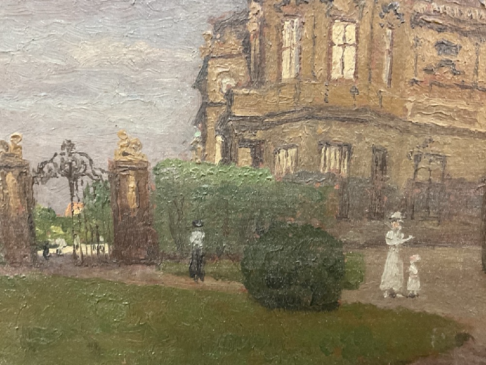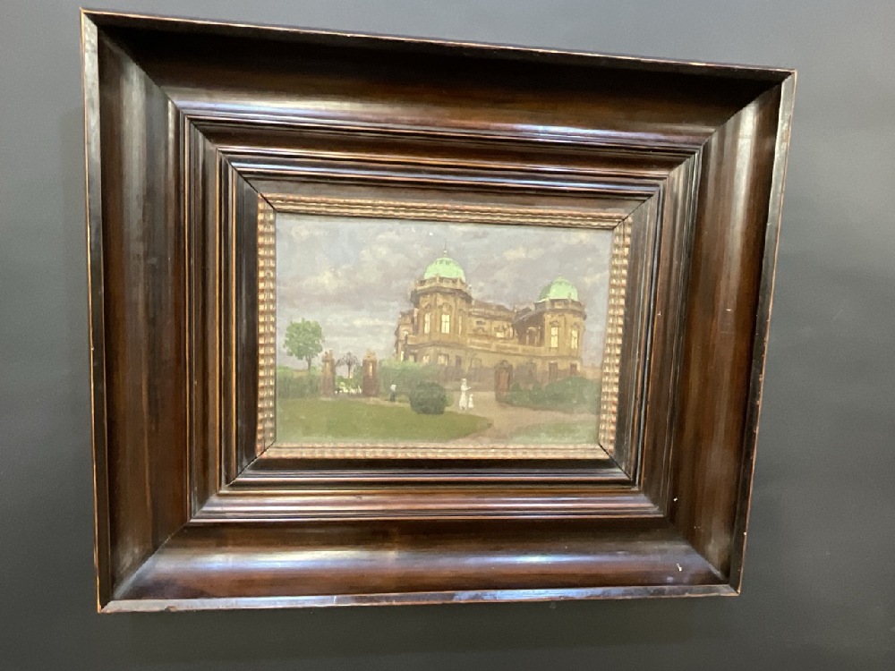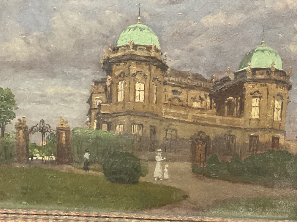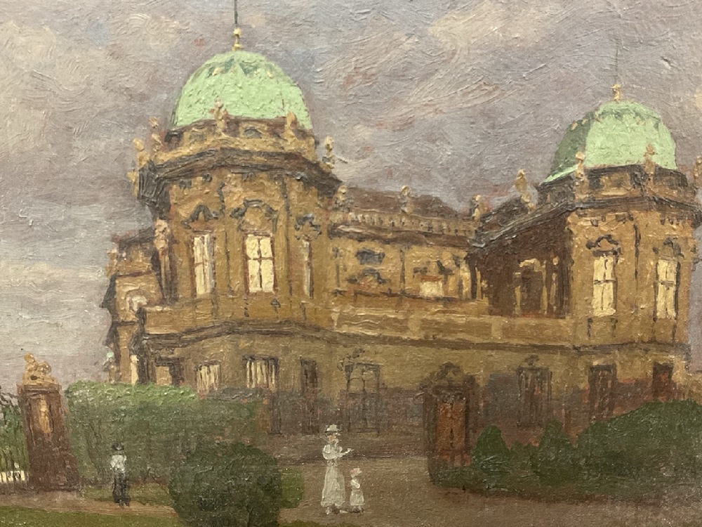 Hans Ranzoni (Austrian, 1868-1956), "Residence Belvedere", c. 1917, oil on board, 6" x 8". Ranzoni studied at the Ecoles des Beaux-Arts in Venice and the Munich Academy with Carl von Marr. In 1918, he was the president of the Society of Artists in Venice
