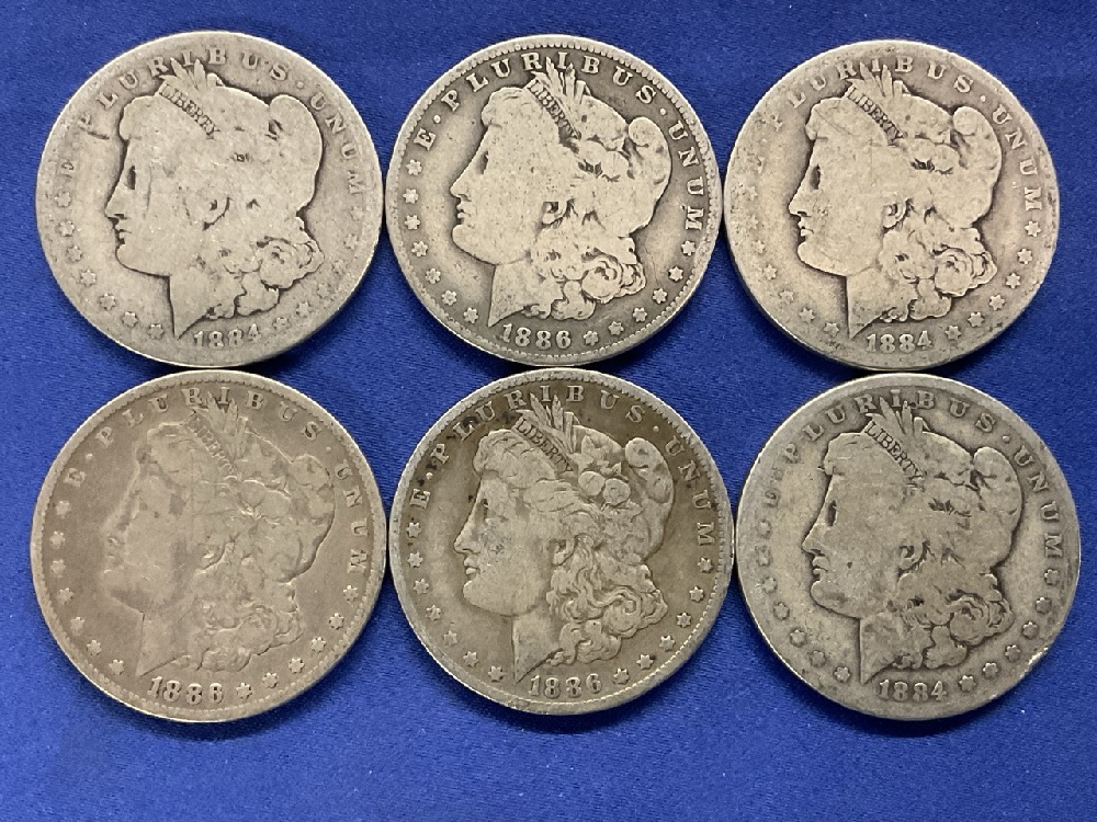 Six (6) U.S. Morgan Silver Dollars.1884 p x 21884-O1886-O x21886-P