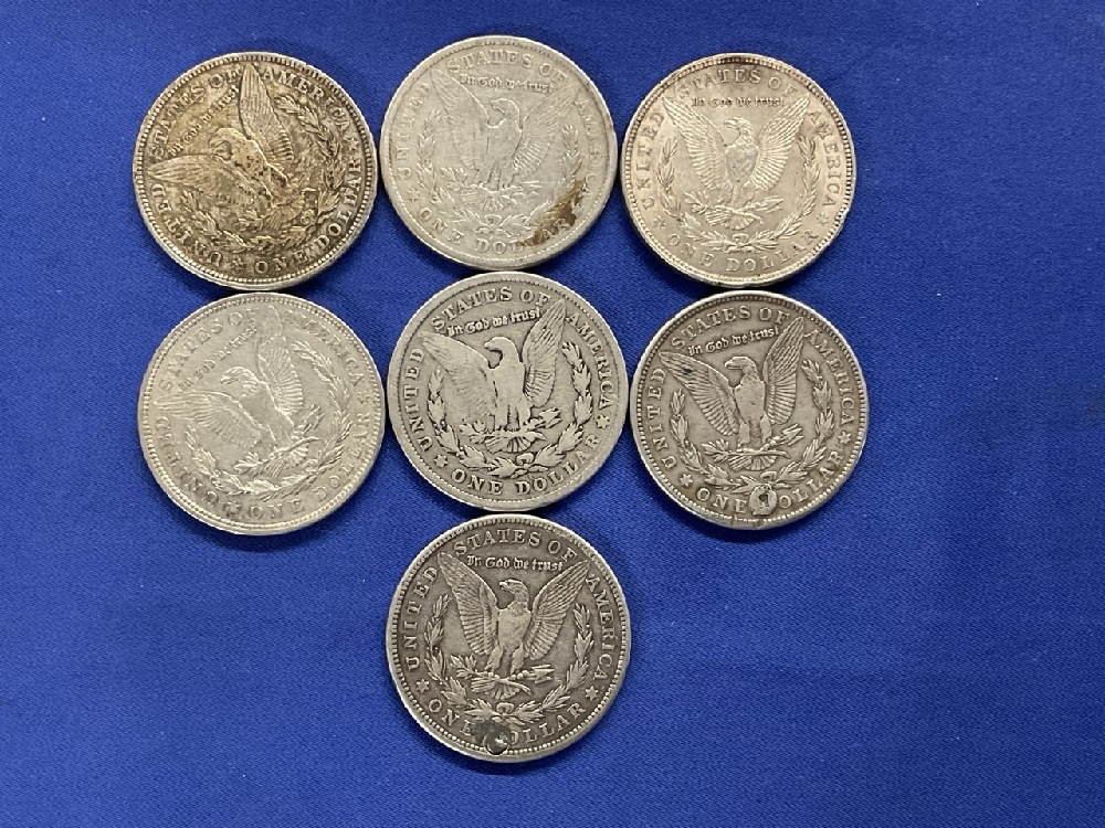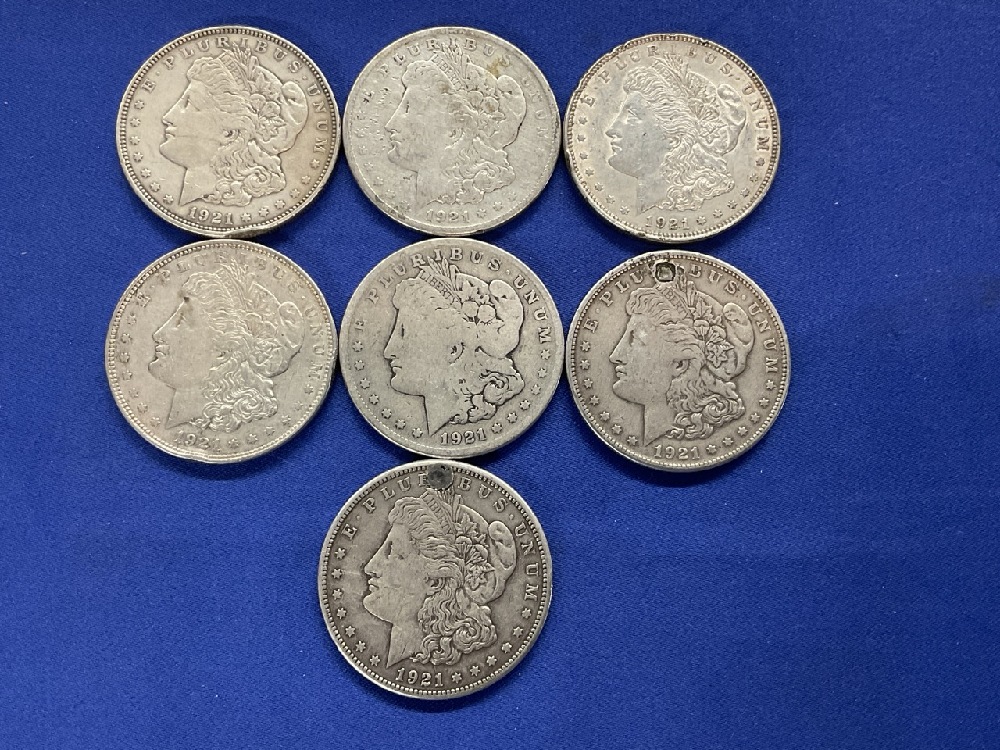 Seven (7) 1921 U.S. Morgan Silver Dollars. 2-S and 5-P Mints.
