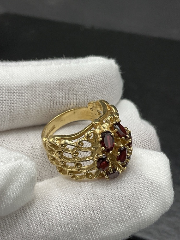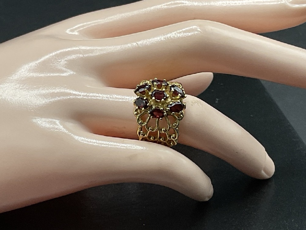 14K Yellow Gold Garnet Cocktail Ring. A Modernistic Design with Seven Garnet Gemstones.