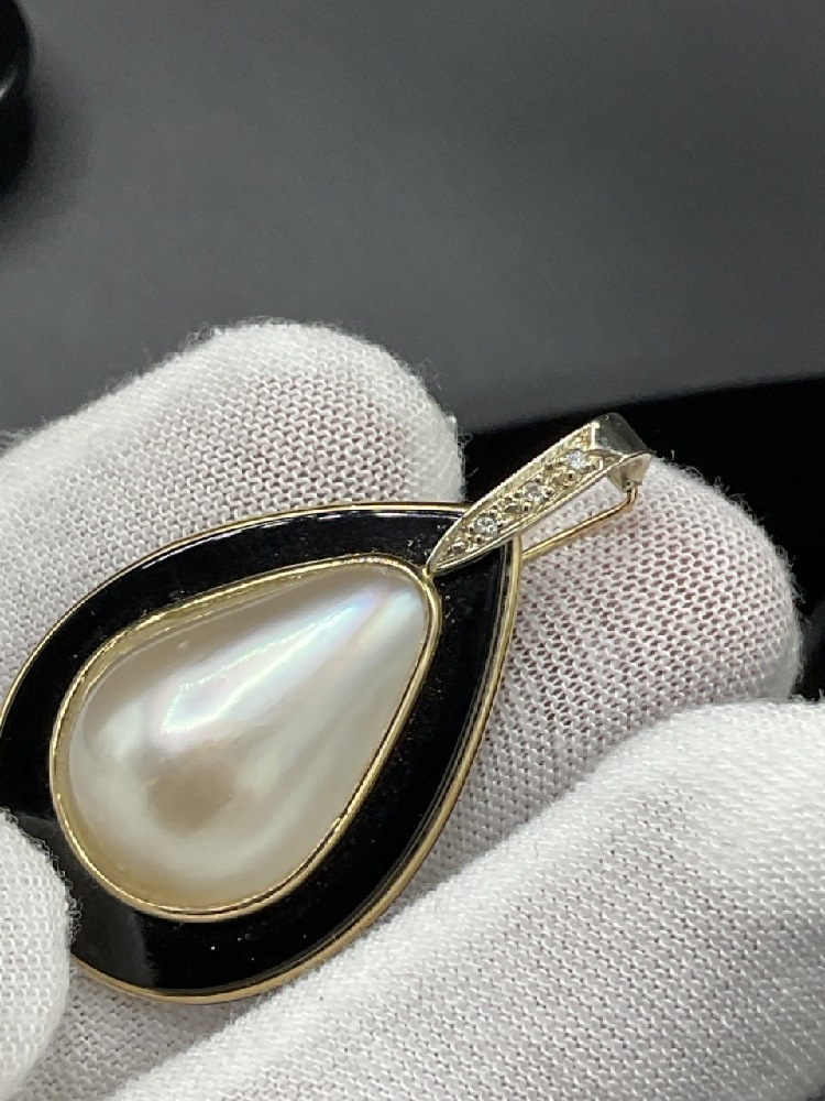 14K Yellow Gold Onyx and Pearl Earrings with matching Pendant with Diamonds.