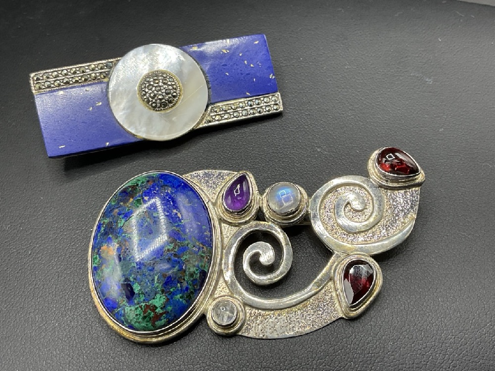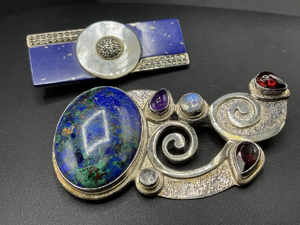 Two (2) Sterling silver pins with Lapis and gemstones. Good quality pieces.