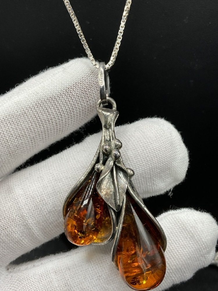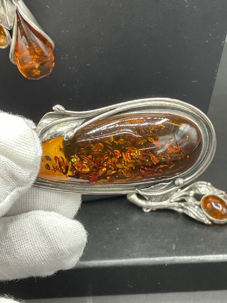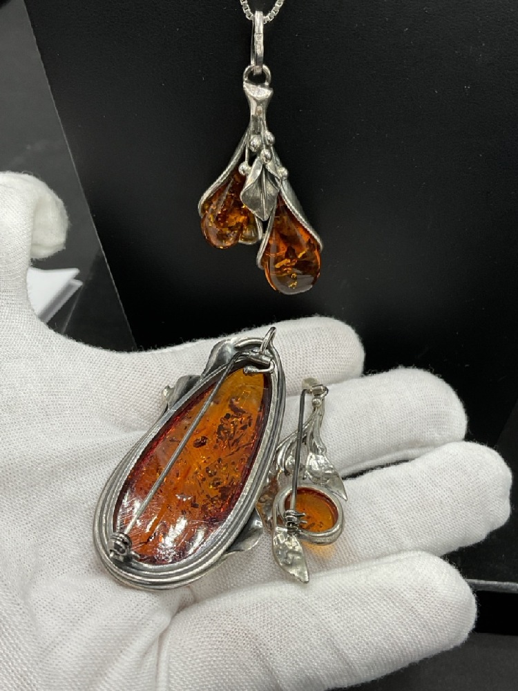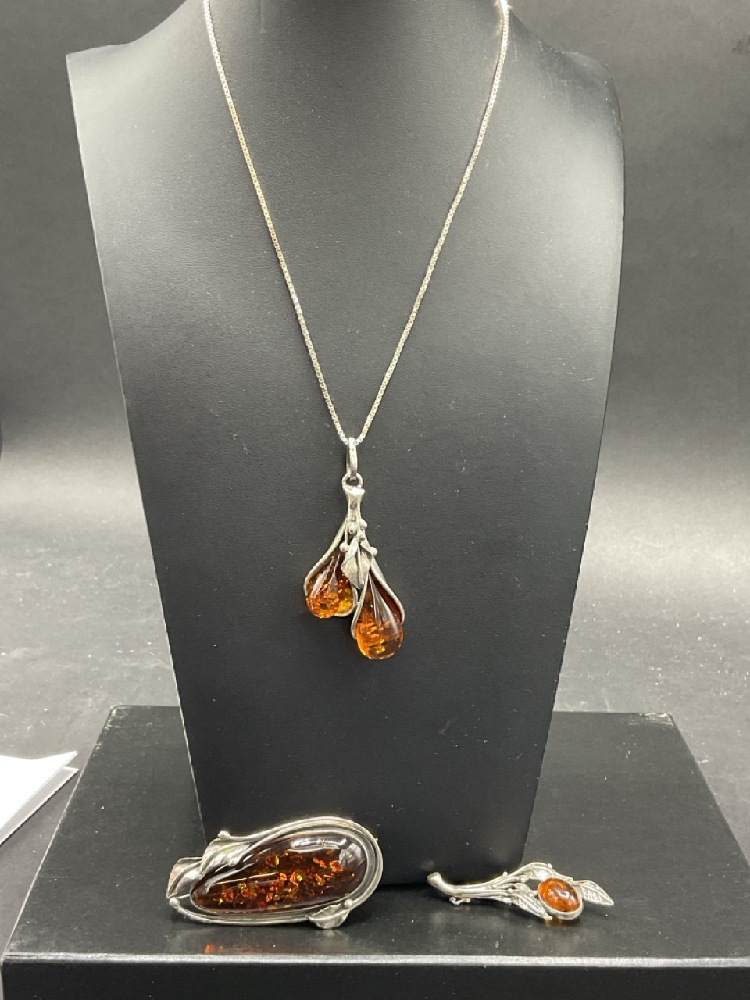 Sterling Silver Amber Jewelry Group. Includes Necklace with pendant and two pins.