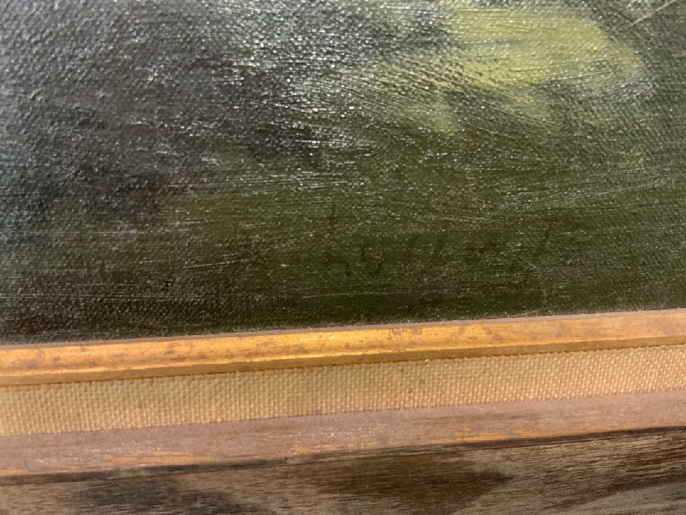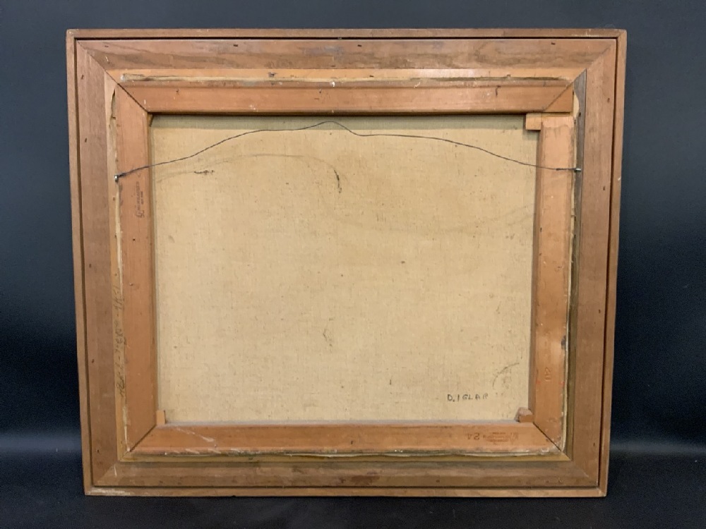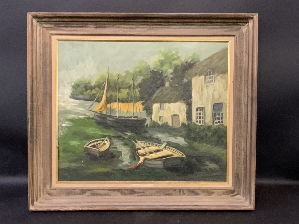 Illegibly Signed Oil on Canvas Lake House w/ Boat Scene. 20th century. Oil on canvas. Dimensions: 19 1/2” x 23 1/2” Framed - 26” x 30”