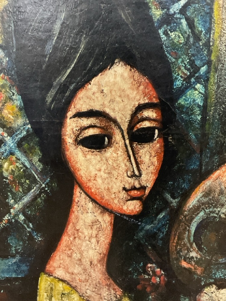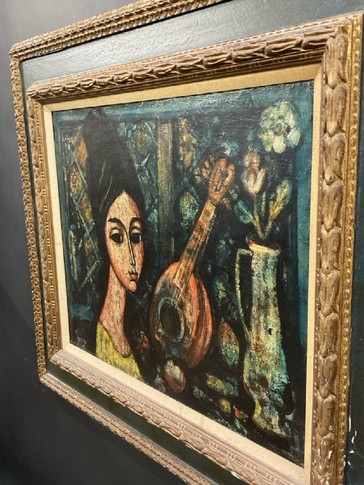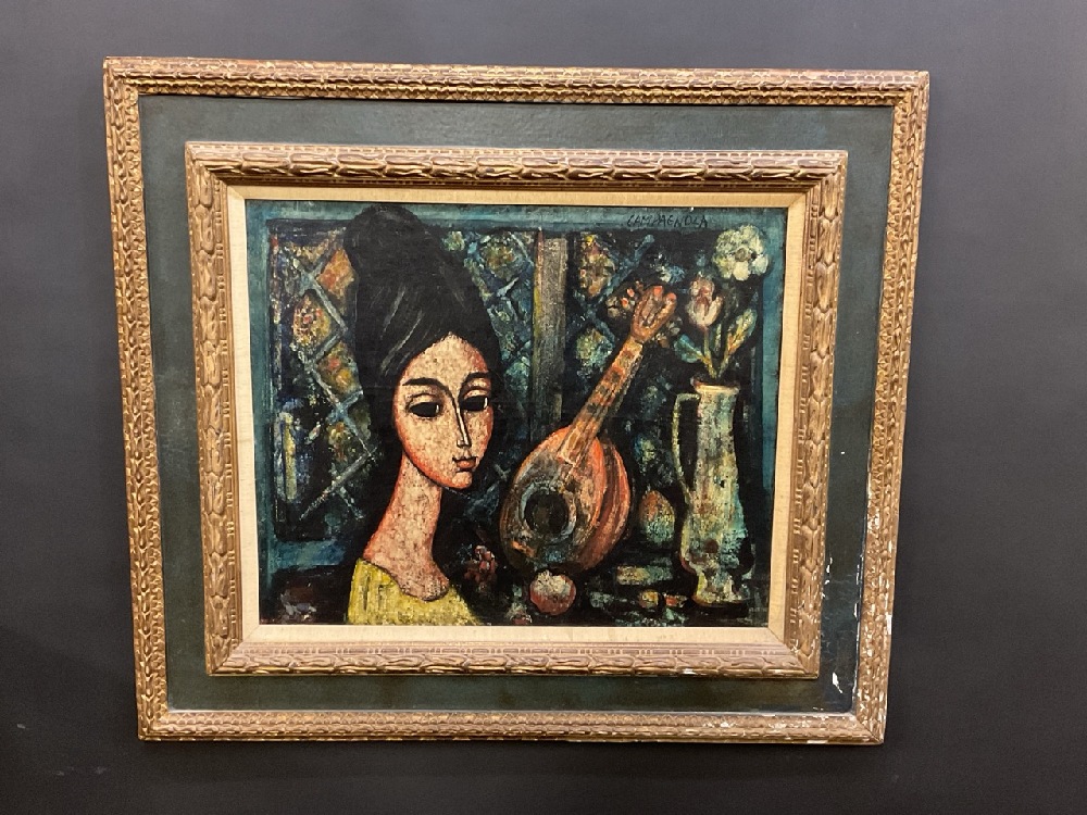 Enrico Campagnola (French/Italian 1911-1984)Portrait Painting of a Young Italian Woman with Mandolin Musical Instrument.Dimensions: 25” x 29” and 37” x 42 1/2” framed.